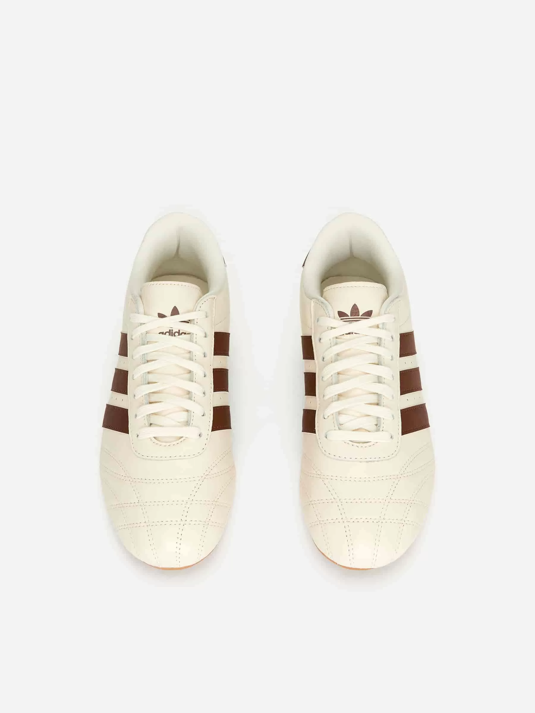 Der adidas Taekwondo ist ein flacher Schnürschuh aus butterweichem Leder. Das Steppdetail an den Zehen erinnert an den Stil der 2000er.
