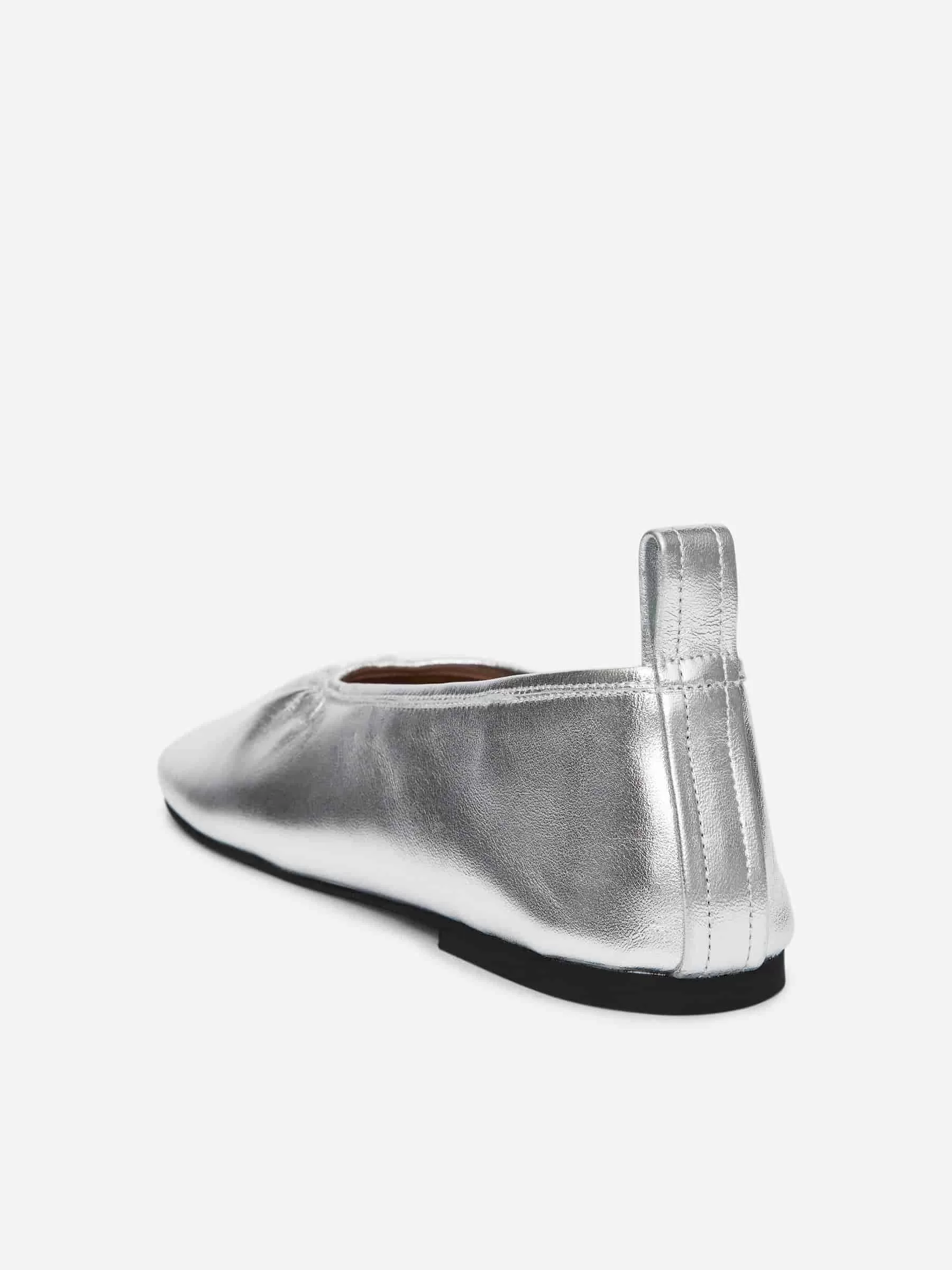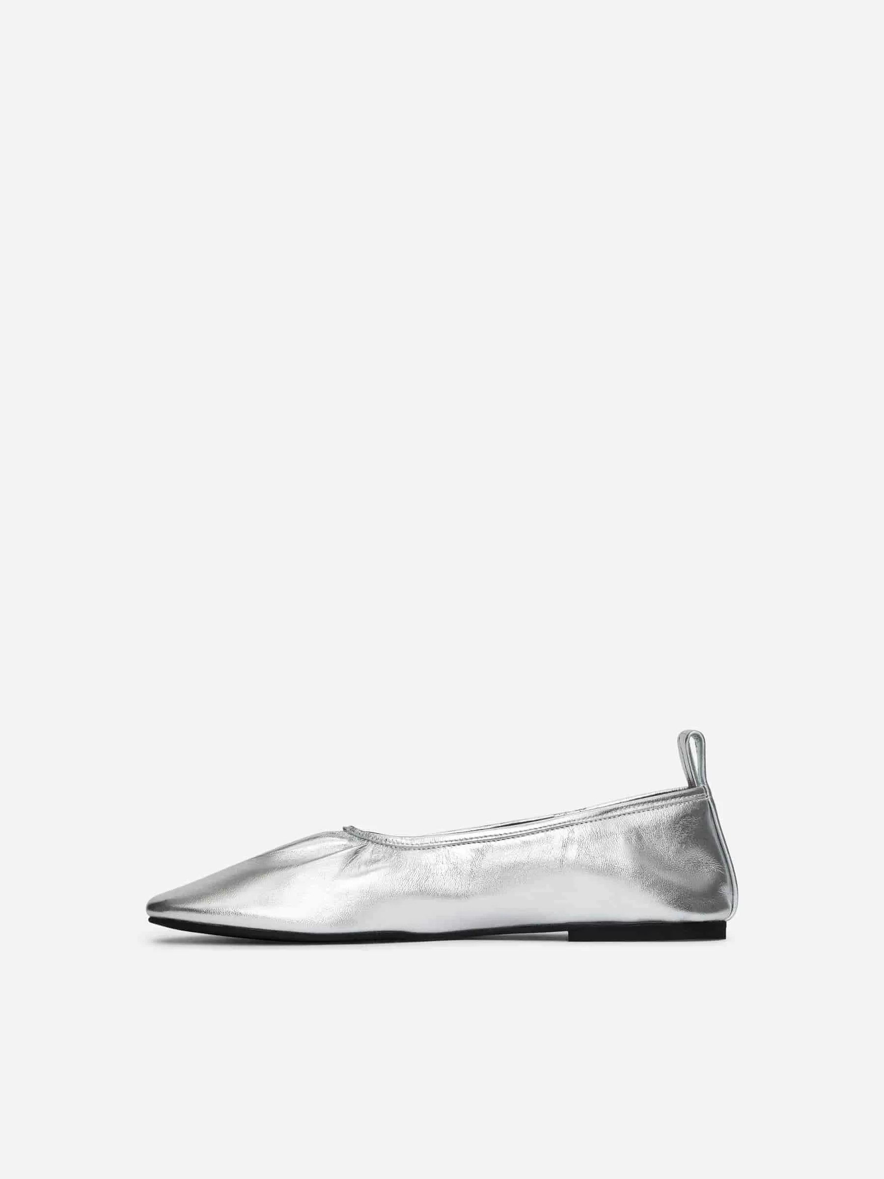 Ballerinas aus chromfreiem Leder. Detailliert mit einem Riemen auf der Rückseite zum einfachen Hineinschlüpfen. Gummisohle.
