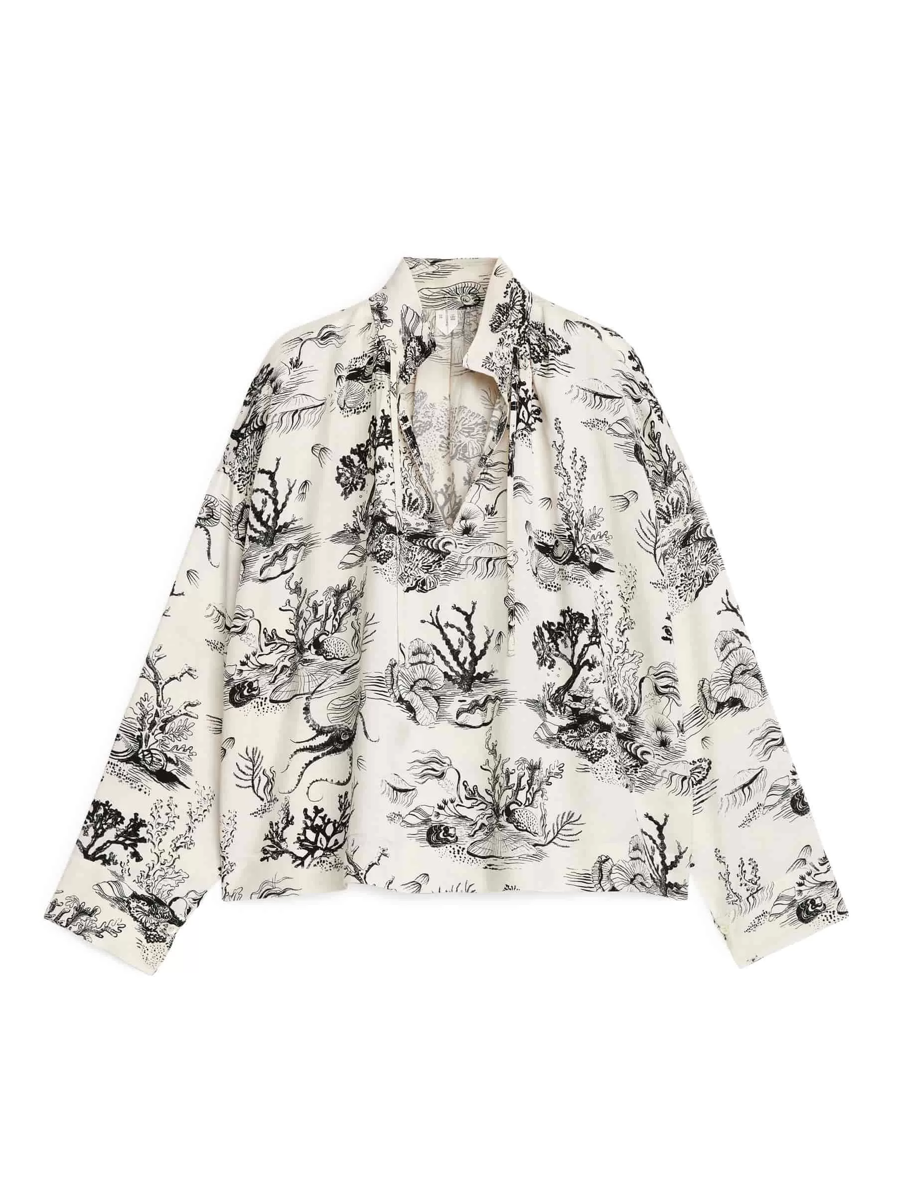 Locker geschnittene Bluse mit Allover-Print. Mit Kordelzug am Hals und Raffungen im Rücken. Manschetten mit Schlitzen und Knopf- und Schlaufenverschluss.