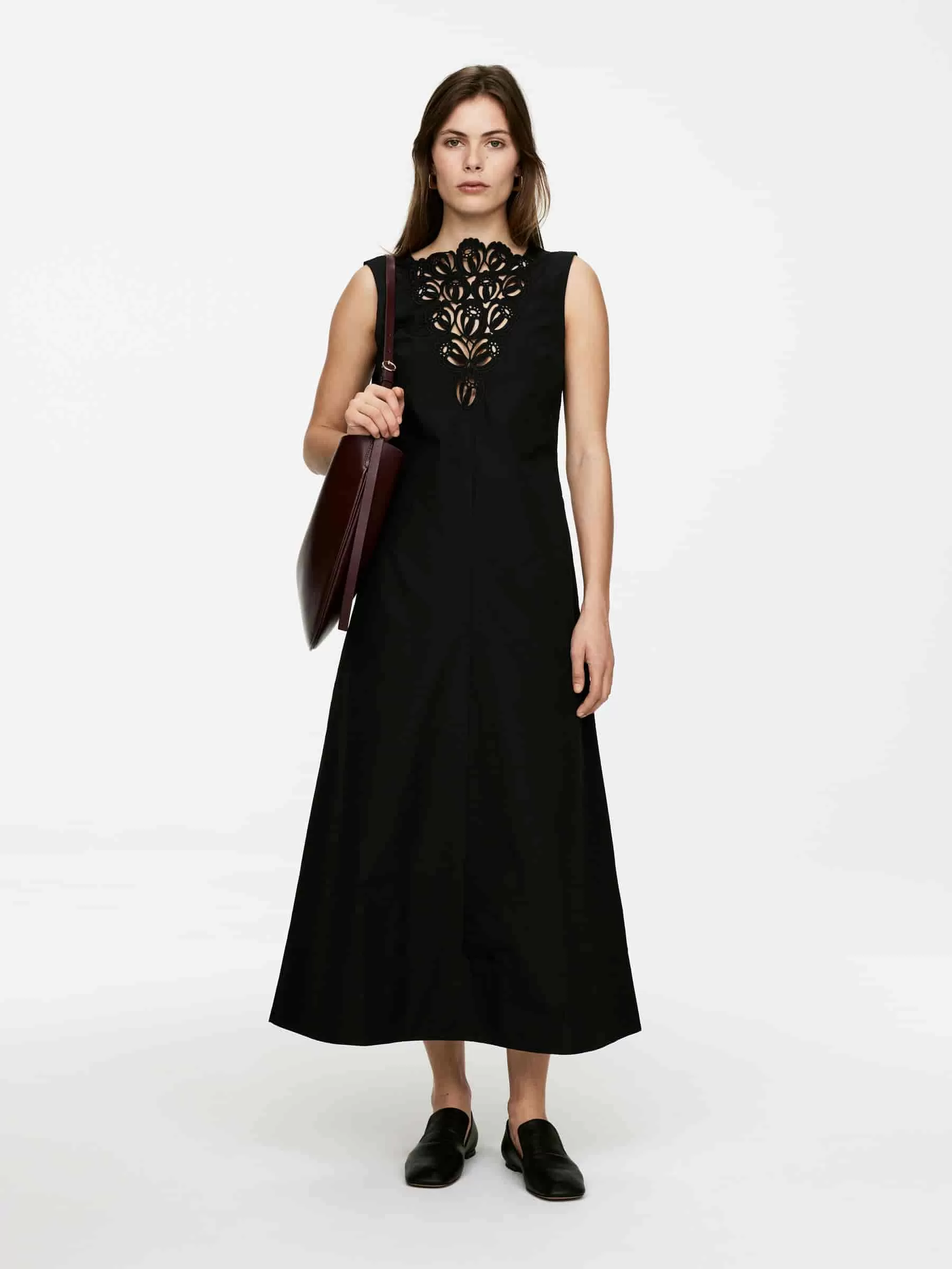 Ärmelloses Baumwollkleid mit Stickereien auf der Brust und an den Seitentaschen. Reißverschluss hinten. Normale Passform.