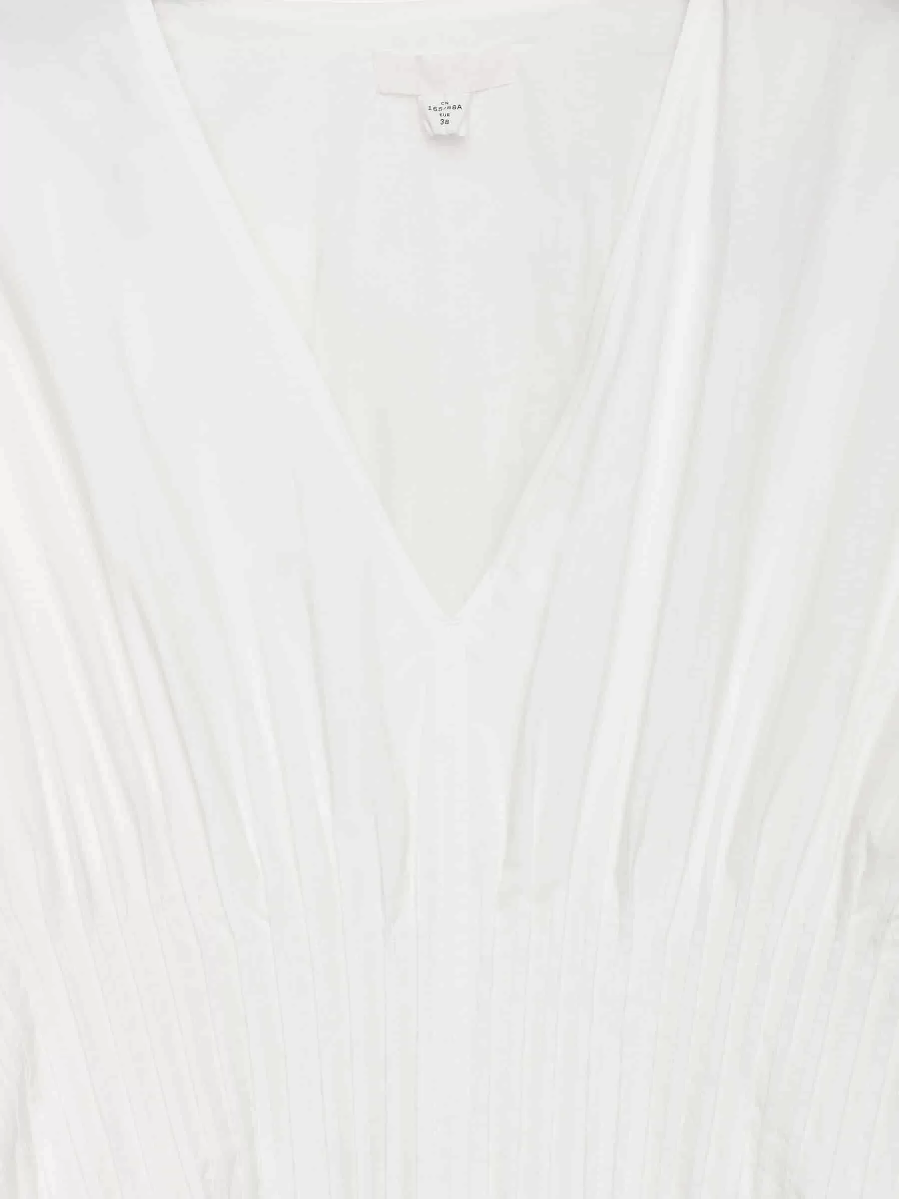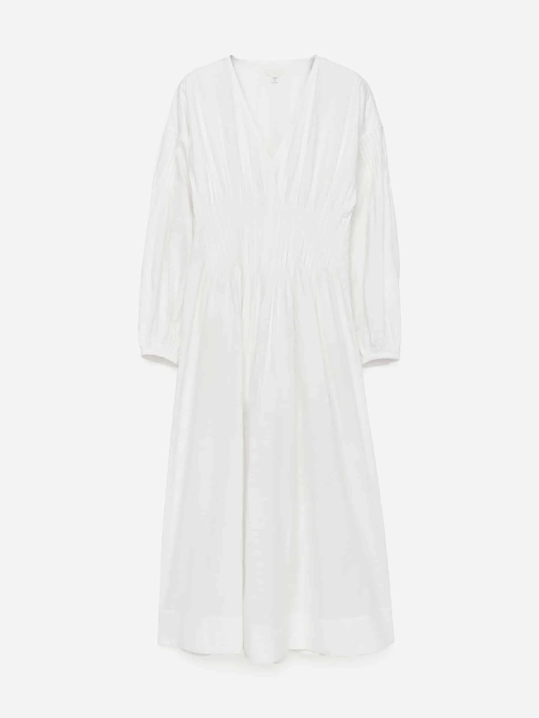 Ganzlanges Kleid aus Baumwolle. Ein langärmliges Modell mit V-Ausschnitt und Biesendetails an Taille und Ärmeln.