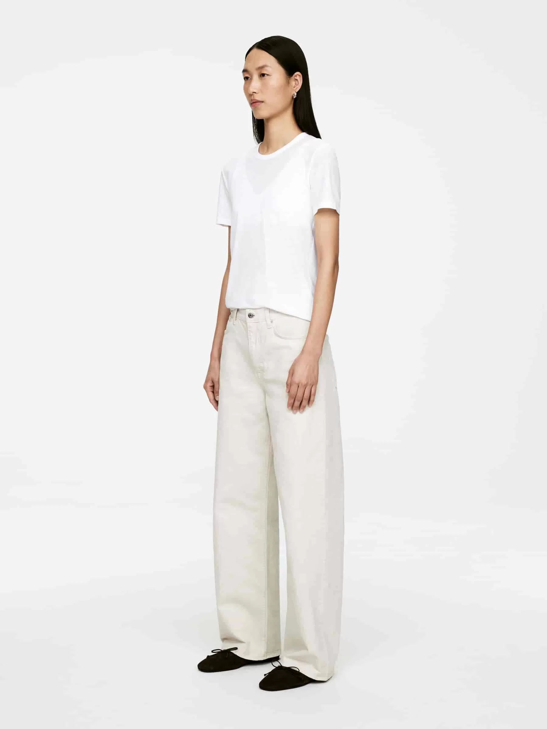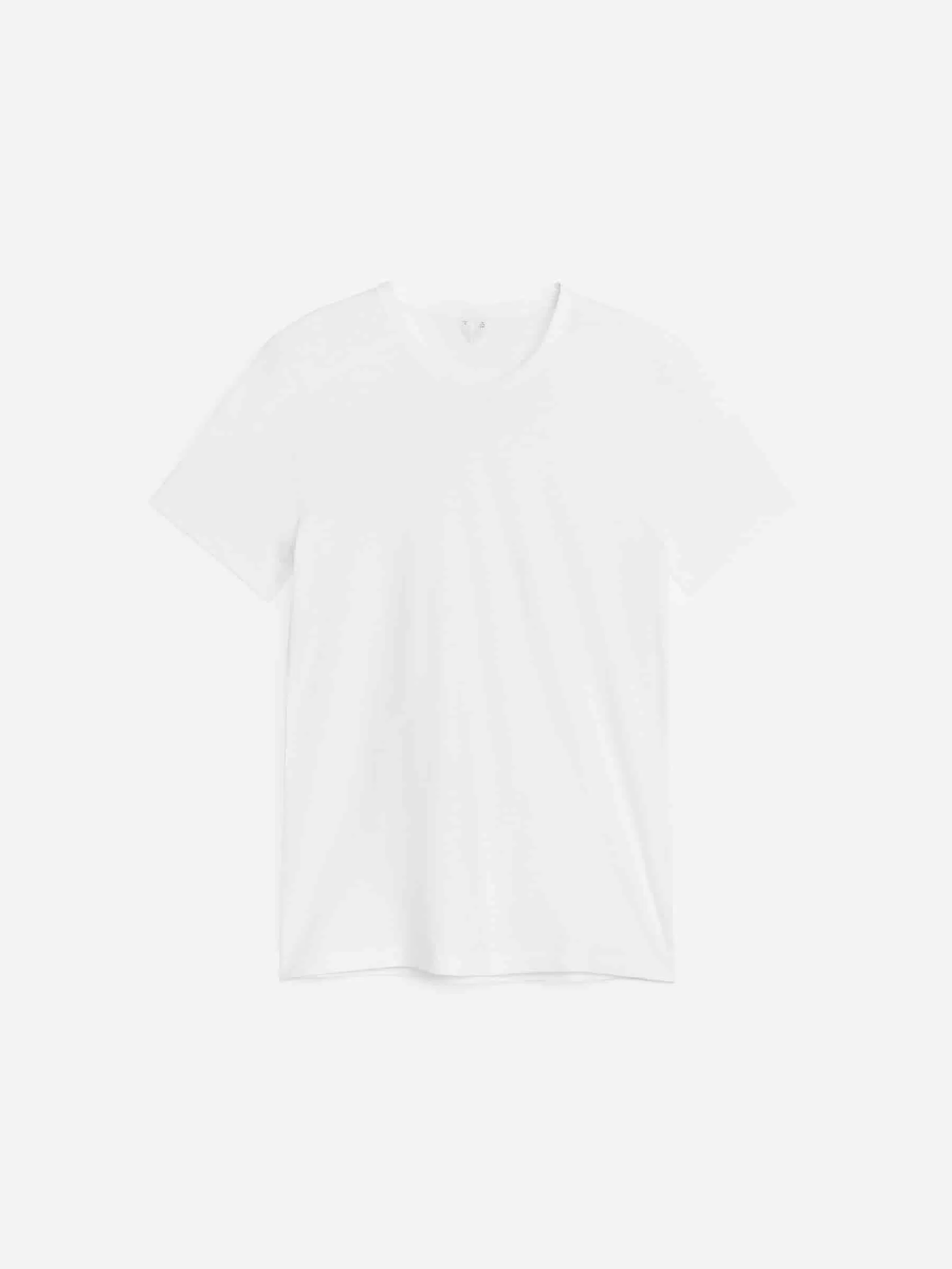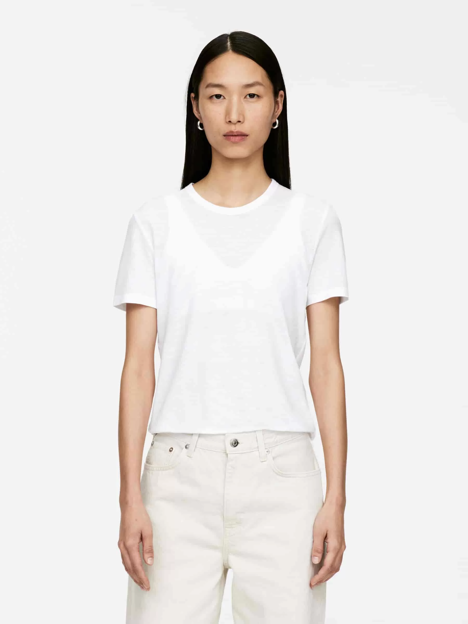 Passgenaues T-Shirt aus Eiskrepp-Strick-Baumwollqualität, die Fließfähigkeit mit einem einzigartigen, frischen Griffgefühl verbindet. Detailliert mit Bambusstichen am Ende der Ärmel und am unteren Saum sowie einer breiten Einfassung am Hals.