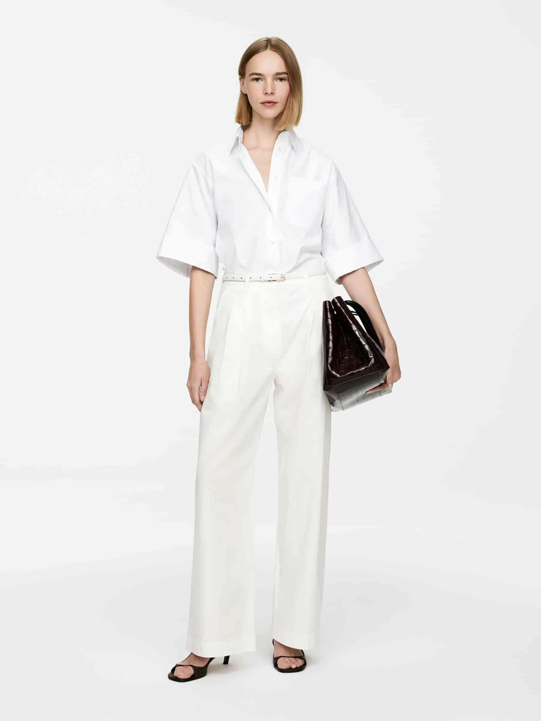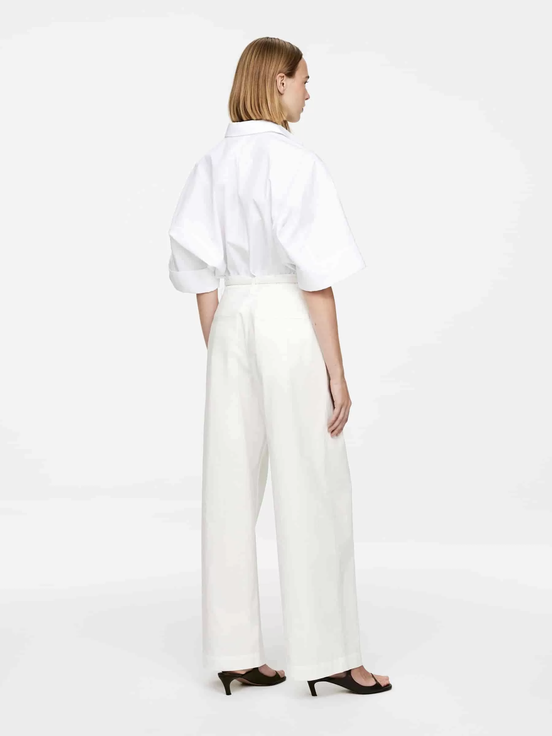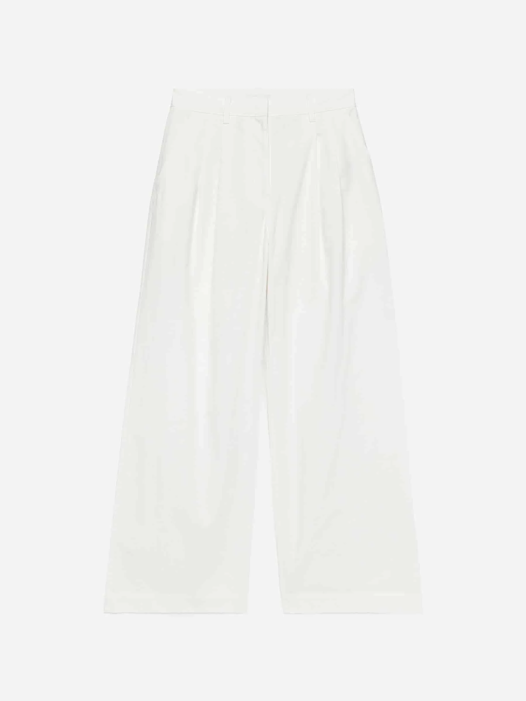 Hose mit entspannter Passform, Falten vorne und mittelhohem Bund. Detailliert mit Seitentaschen, Leistentaschen hinten und Haken- und Ösenverschluss.
