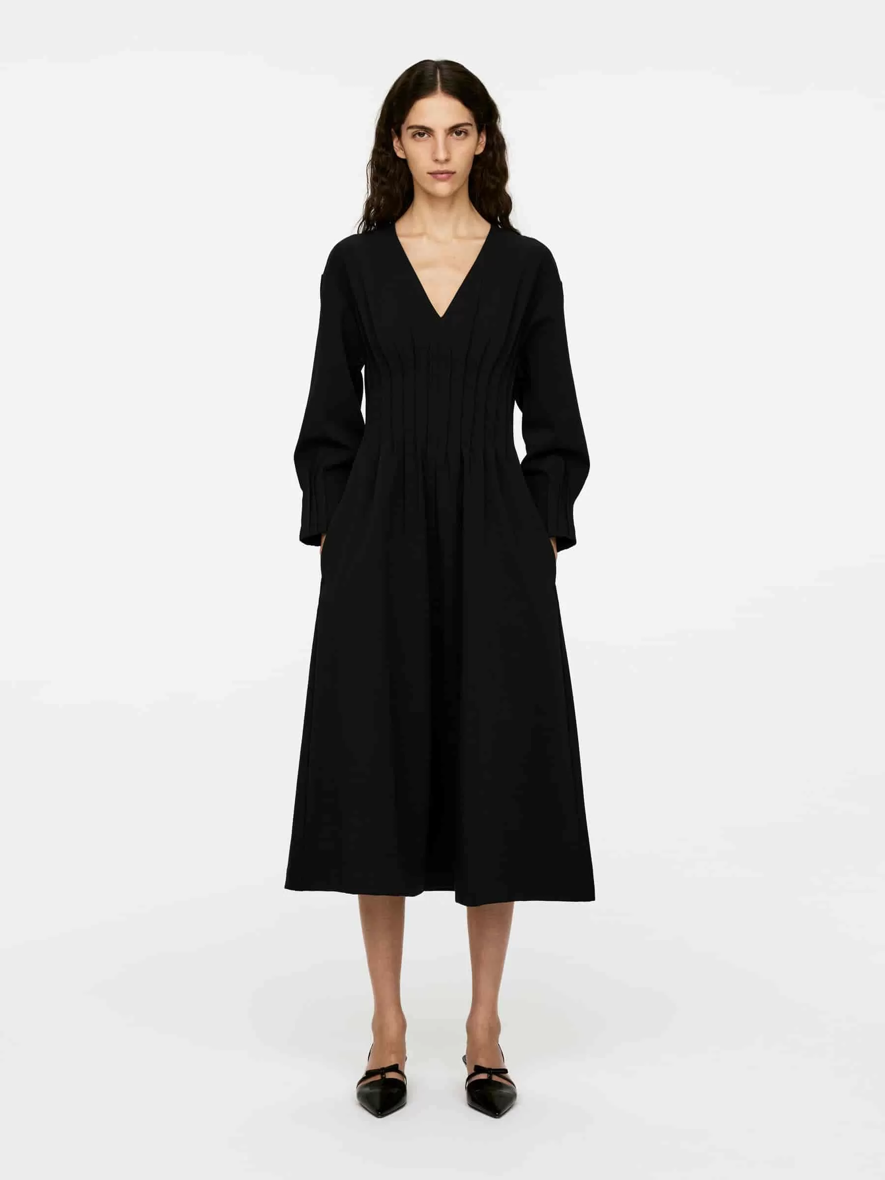 Kleid mit V-Ausschnitt und genähten Falten an der Taille und an den Ärmelenden, um die Silhouette zu betonen. Ein ungefütterter Schnitt, der bis zum Knöchel reicht. Versteckter Reißverschluss in der hinteren Mitte.