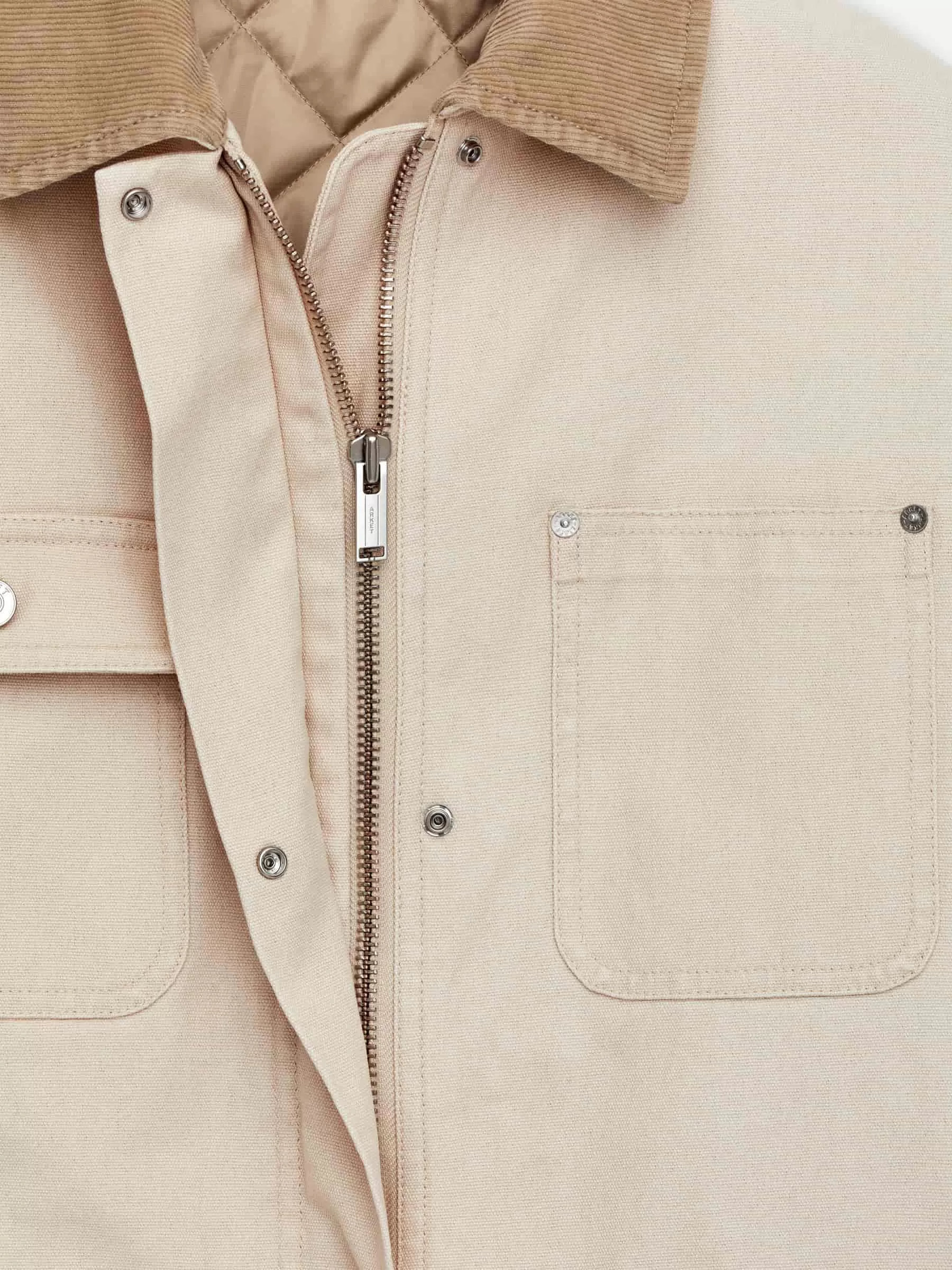Jacke im Workwear-Stil aus Stonewashed-Canvas-Stoff. Dies ist ein gepolstertes Modell mit Cordkragen, einem Zwei-Wege-Metallreißverschluss vorne und aufgesetzten Taschen mit Ösenknöpfen.