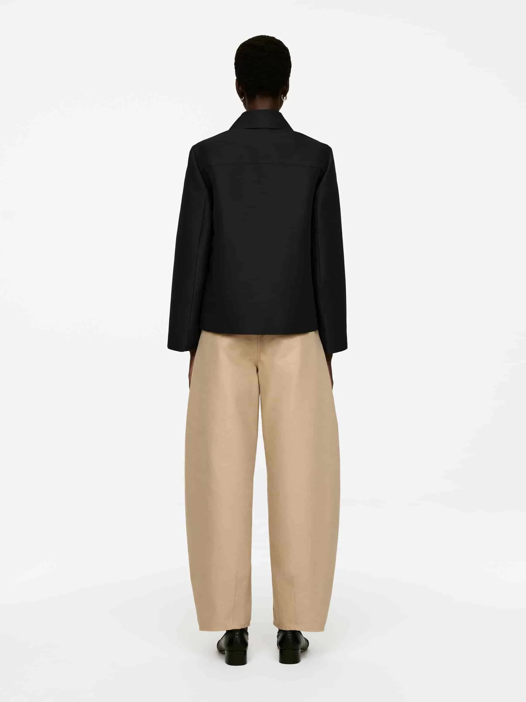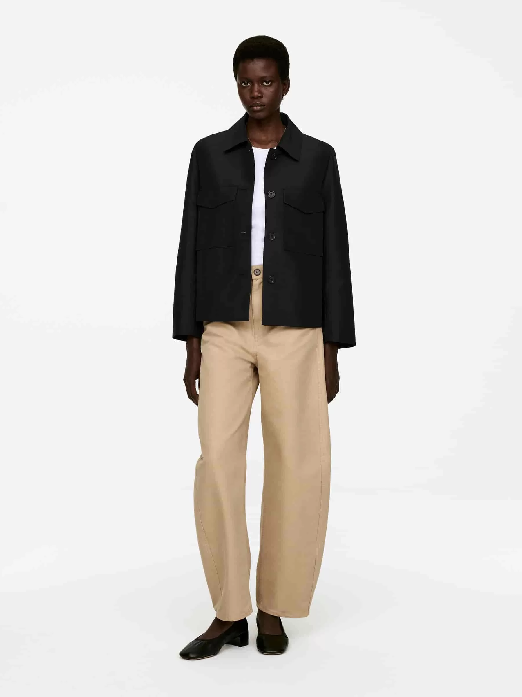 Hose im Chino-Stil aus Baumwolle. Ein Modell mit mittlerer Taille, ausgestellten Beinen, schrägen Seitentaschen und Leistentaschen hinten.