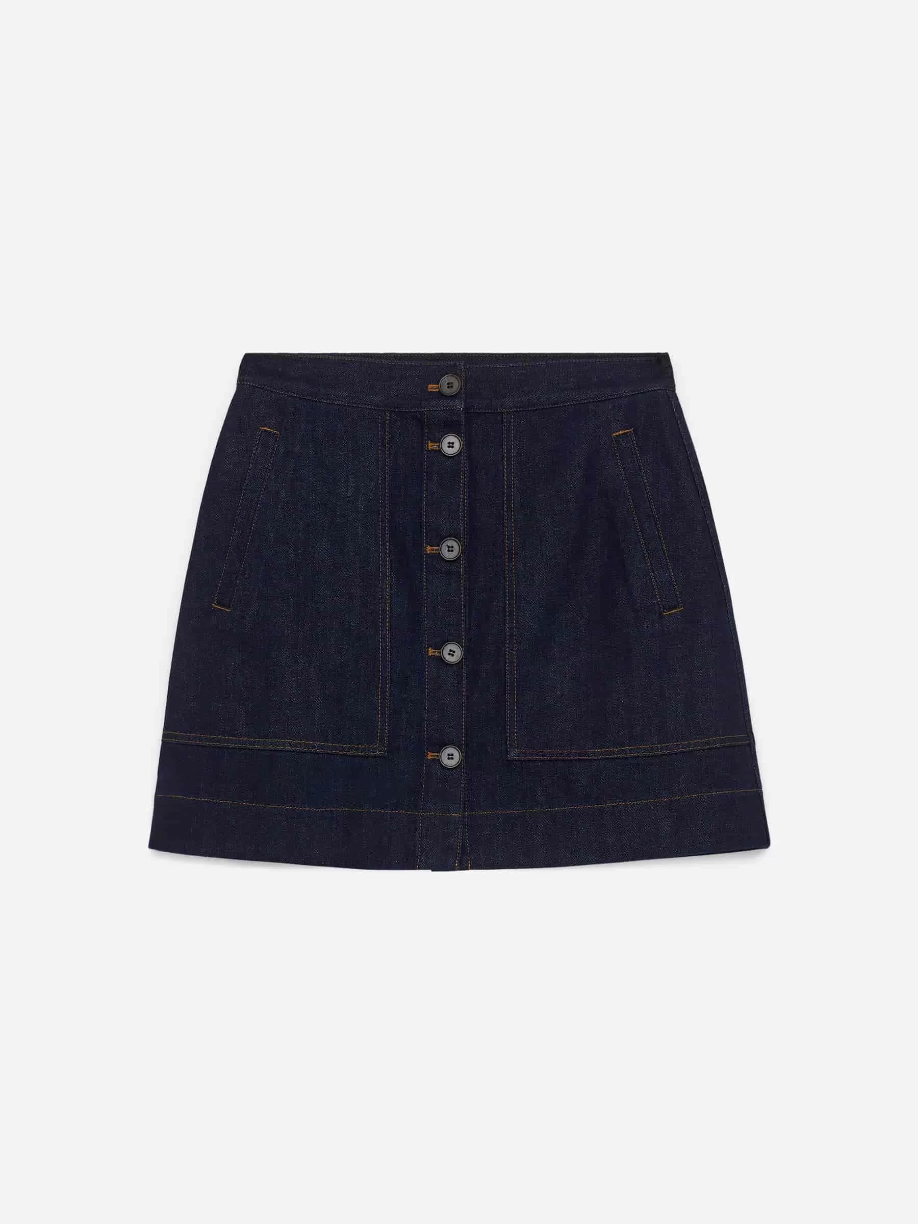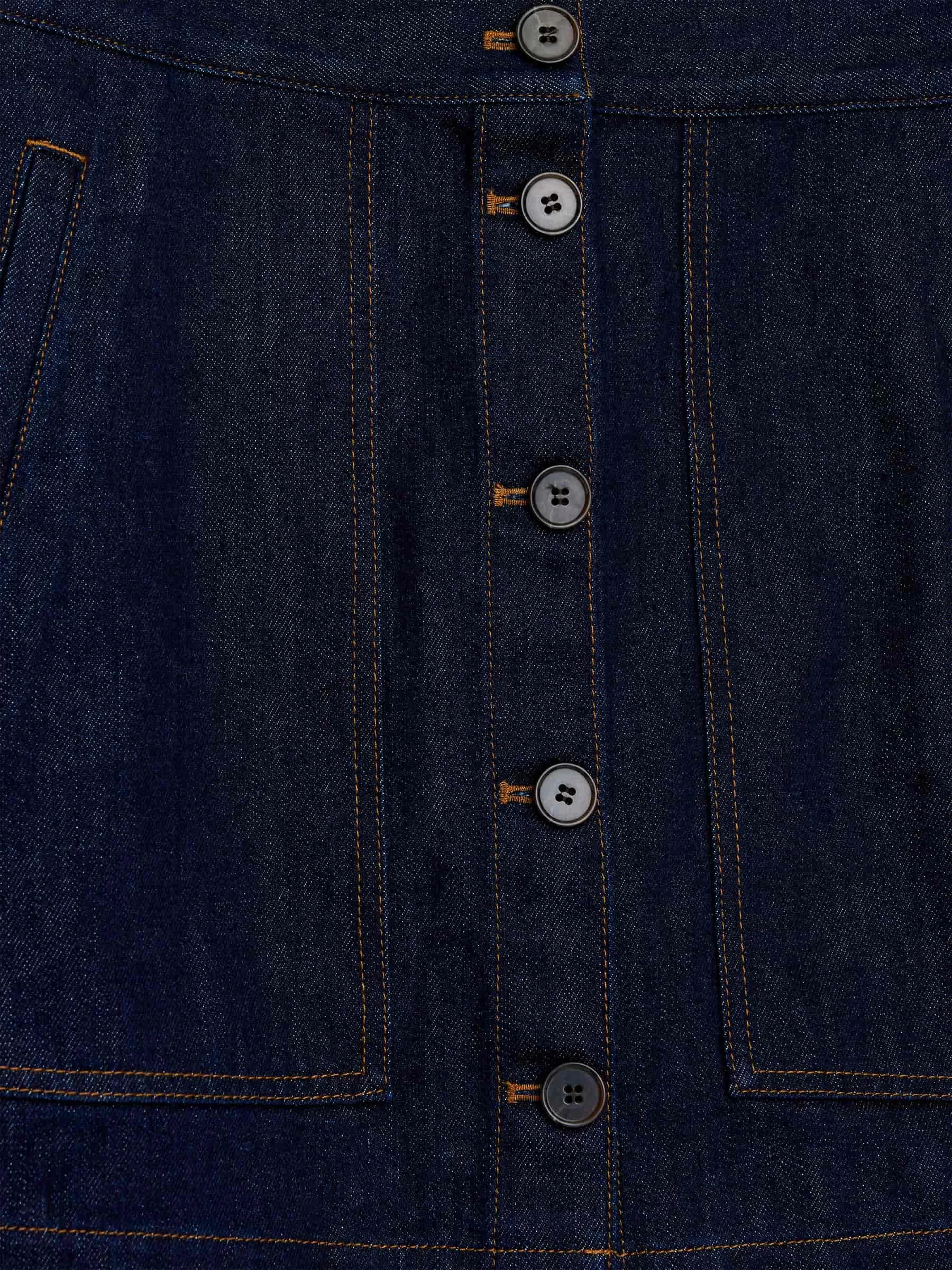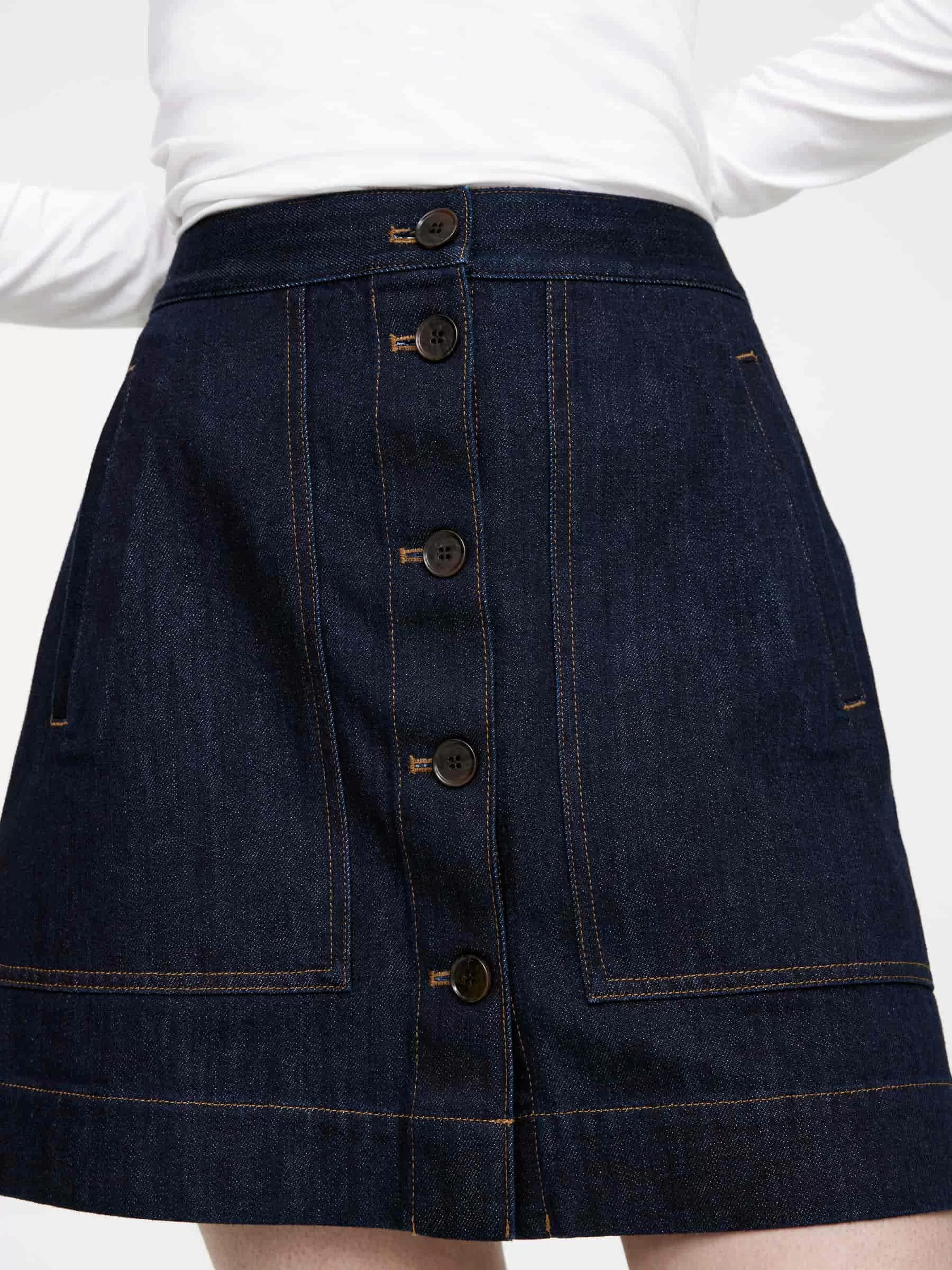 Kurzer Jeansrock aus Baumwolle. Mit Leistentaschen an den Seiten und Knopfverschluss vorne. Normale Passform.