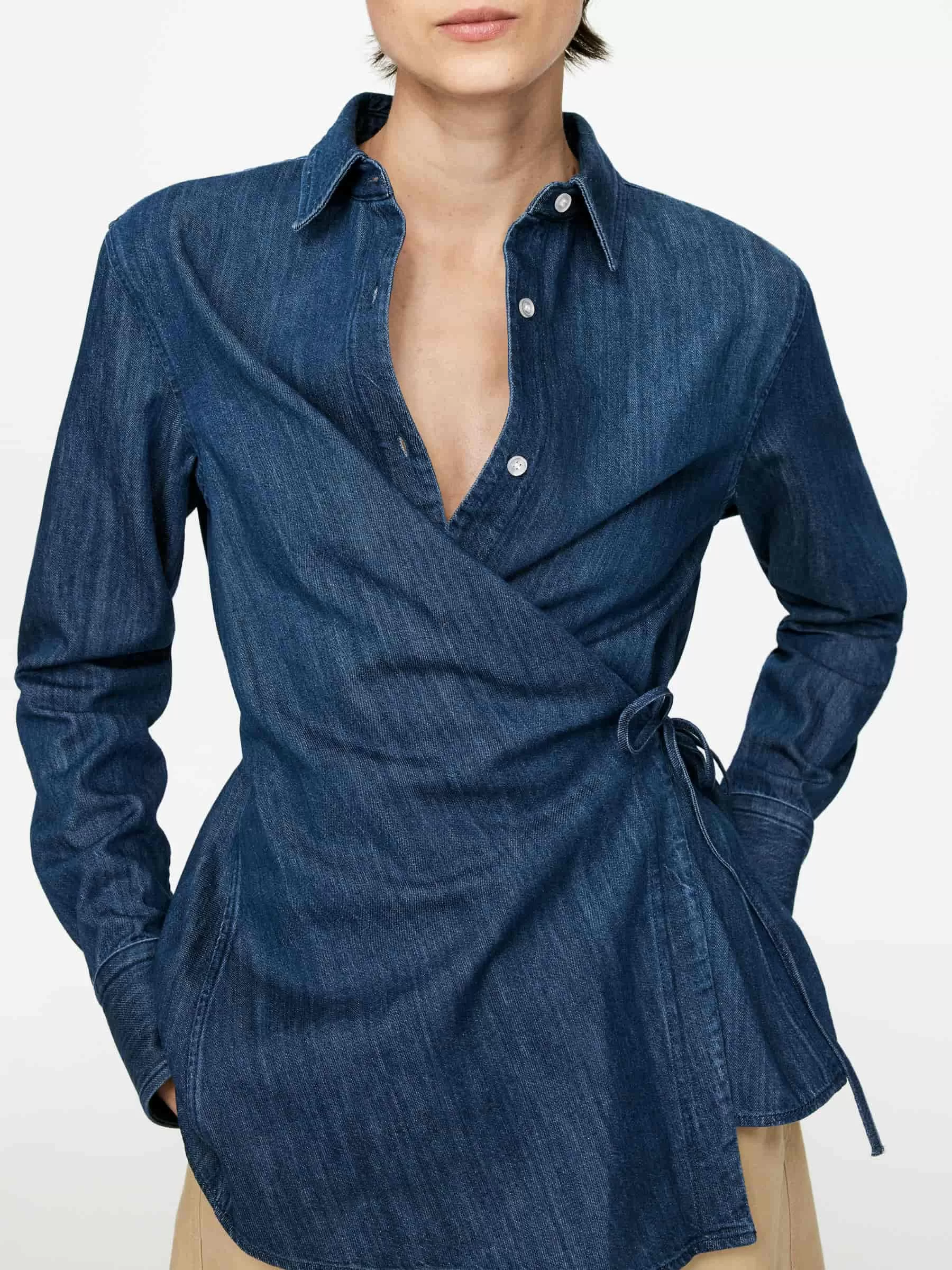 Jeans-Wickelhemd aus Baumwolle. Bindeband in der Taille und Knopfverschluss. Normale Passform.