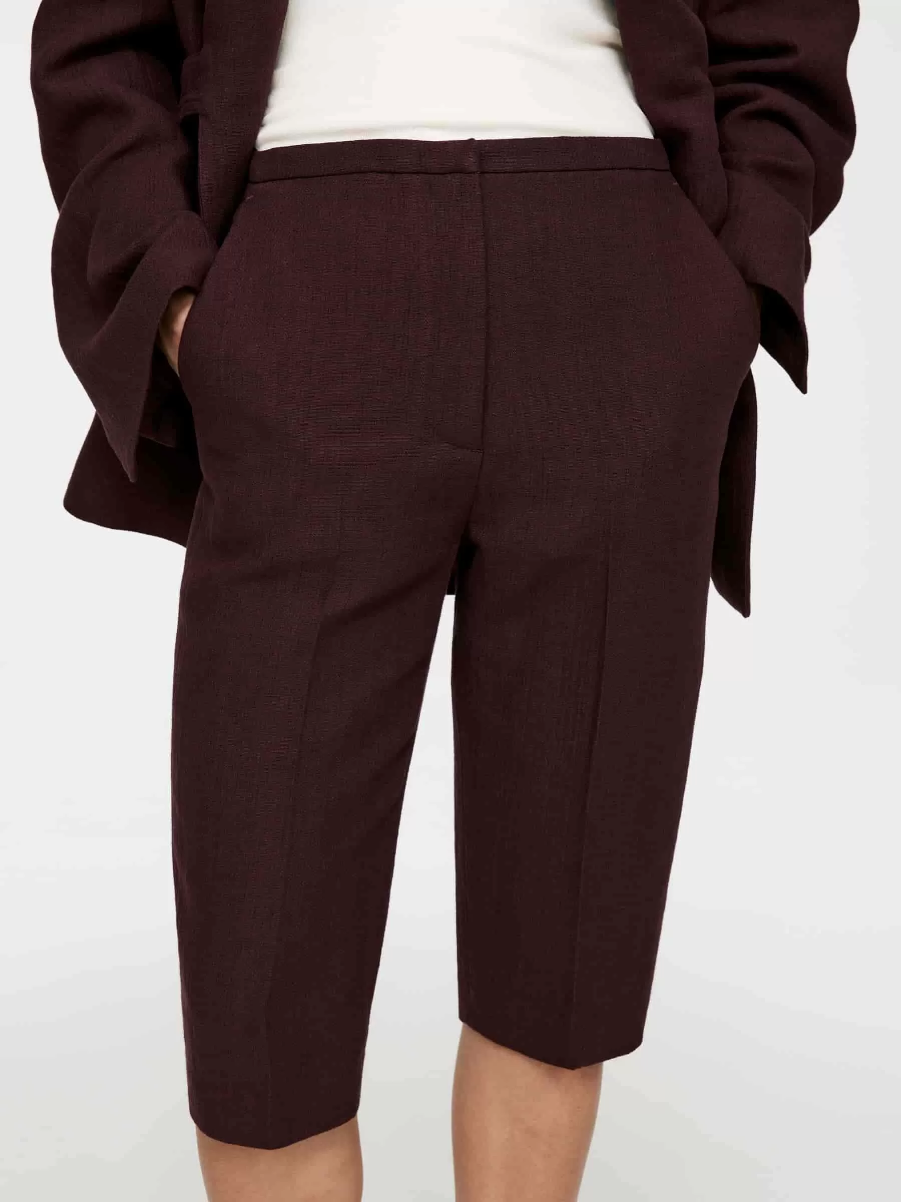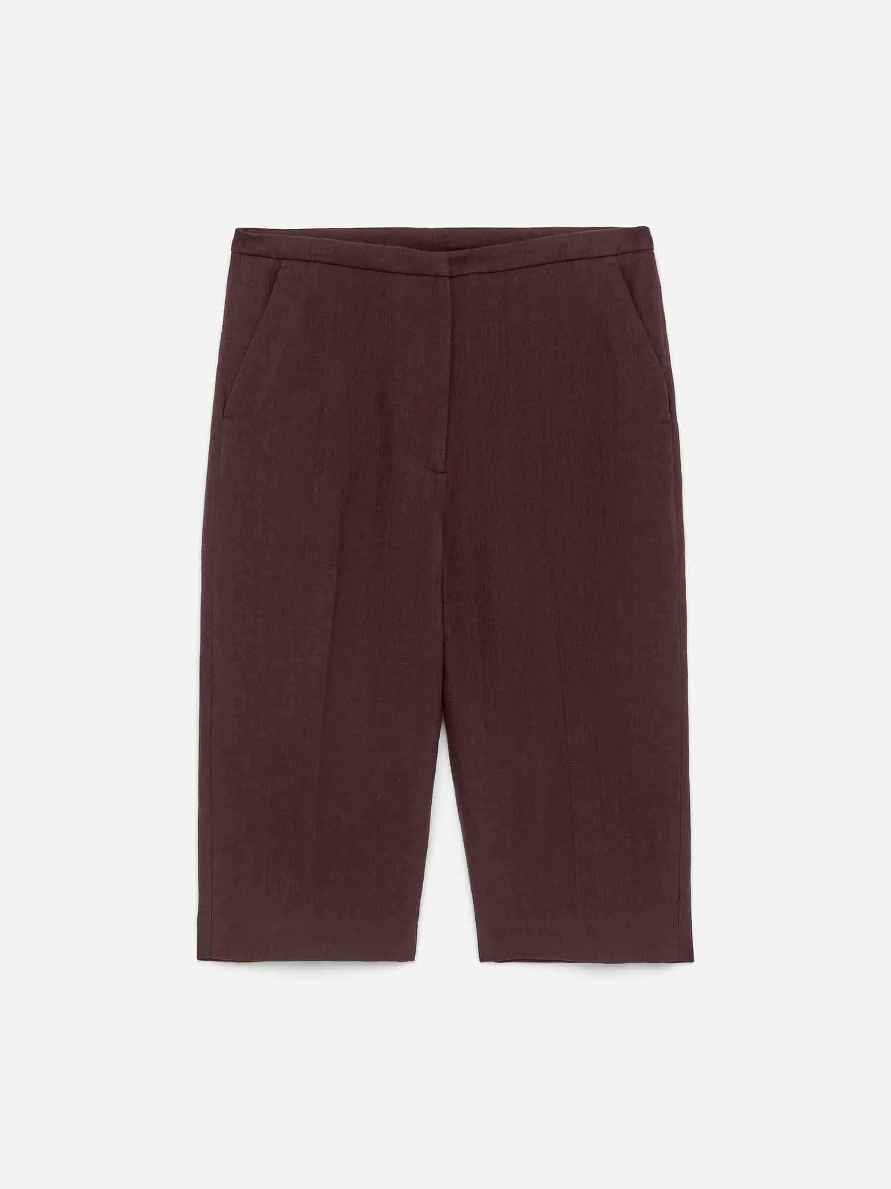 Mittelhohe, knielange Shorts aus einer Mischung aus Baumwolle und Leinen. Bügelfalte vorne und hinten, schräge Seitentaschen und Leistentaschen hinten. Reißverschluss und Hakenverschluss.