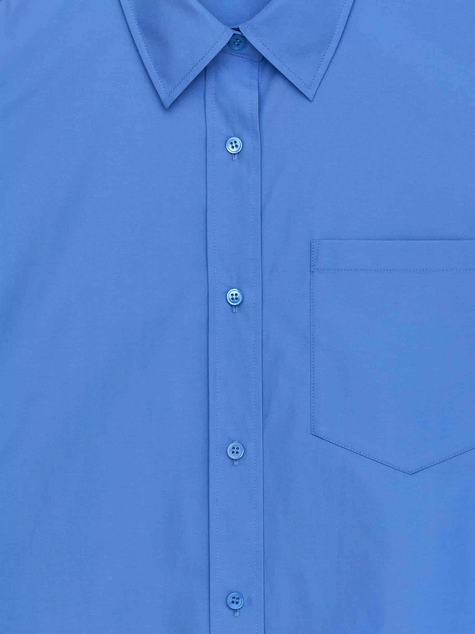 Kurz geschnittenes Hemd aus festem Baumwollgewebe. Für eine normale Passform geschnitten und mit spitzem Kragen, Knopfleiste vorne, einer einzelnen Brusttasche und geknöpften Manschetten ausgestattet.