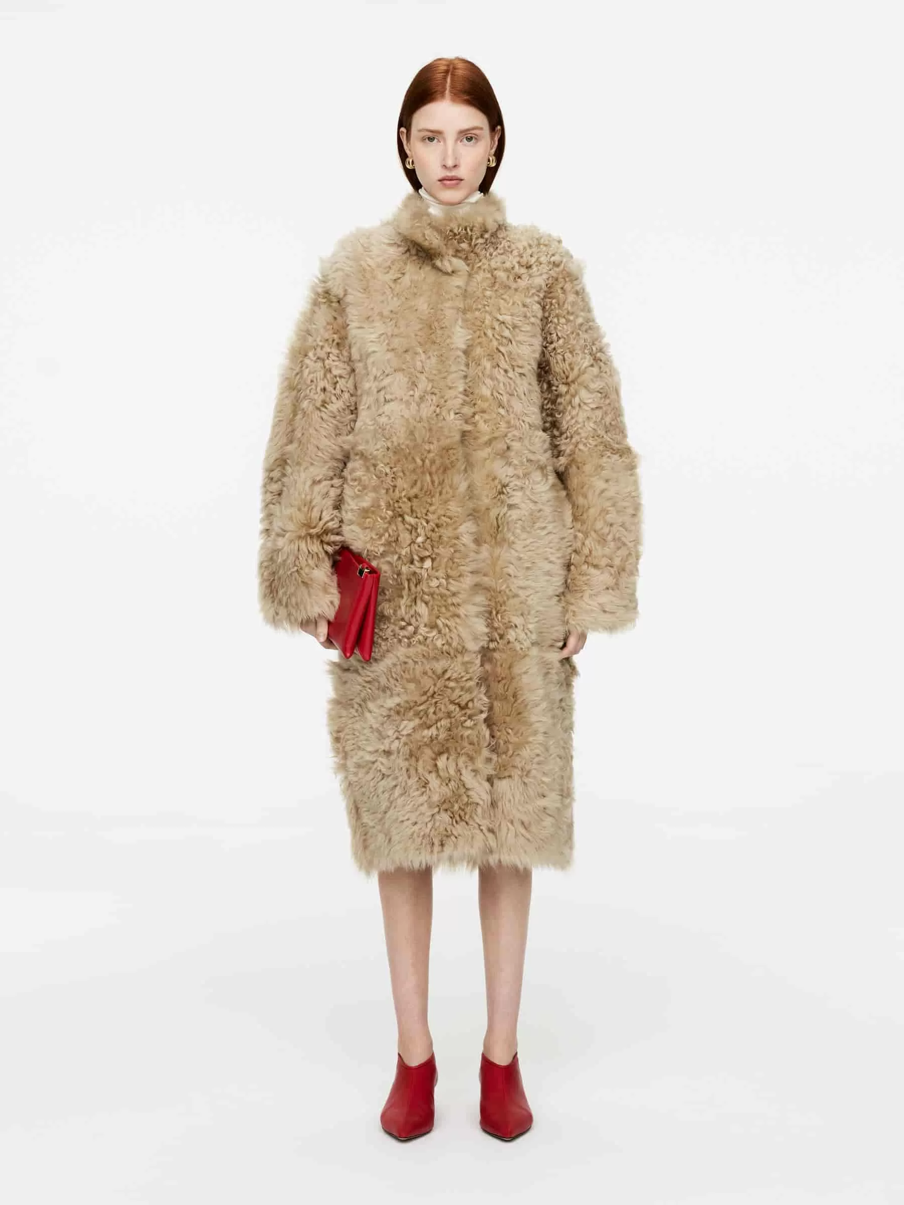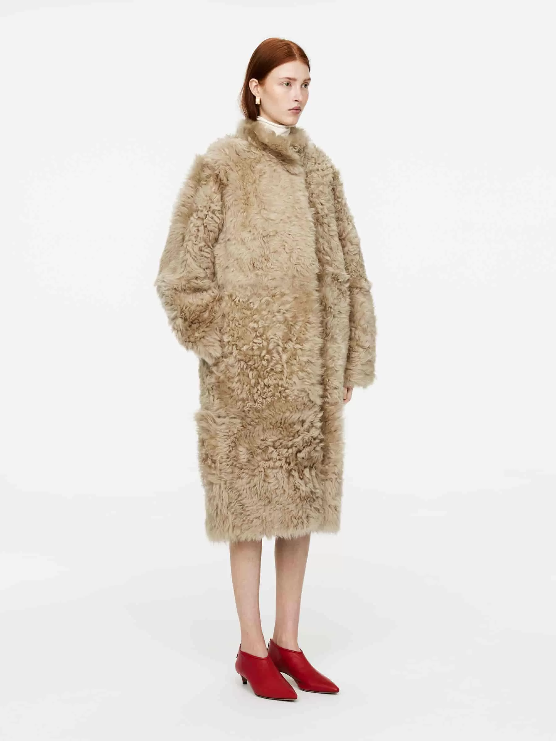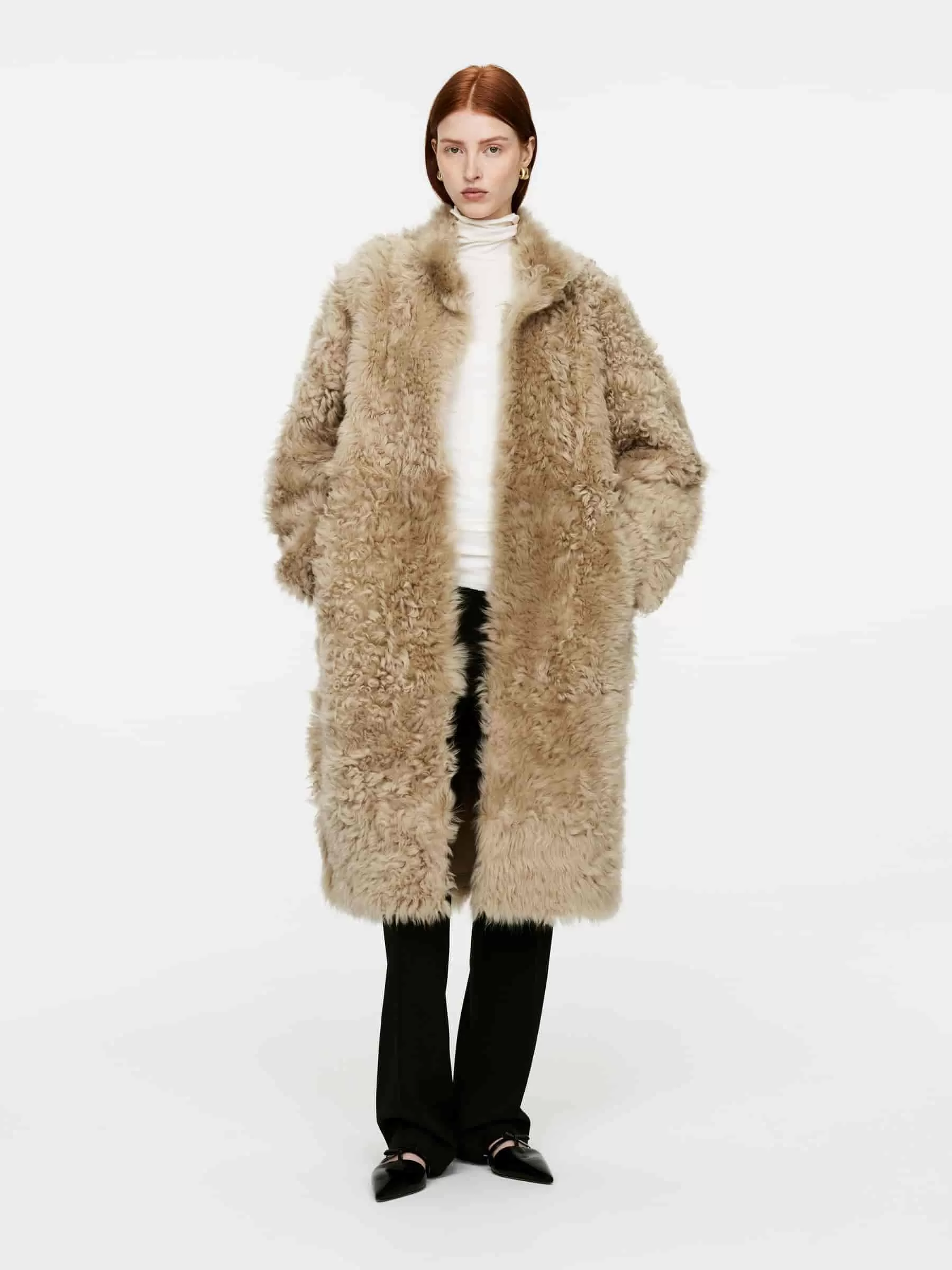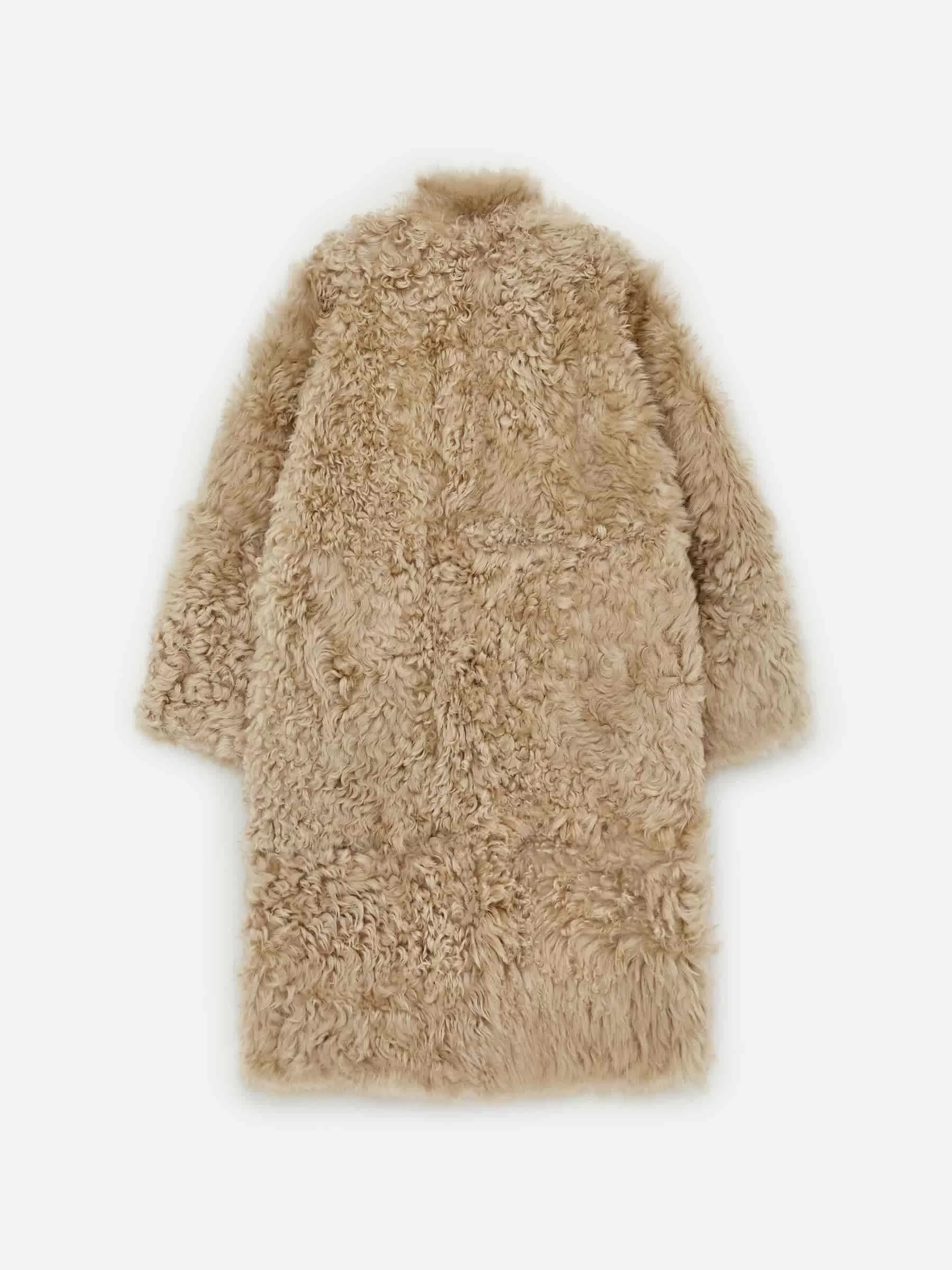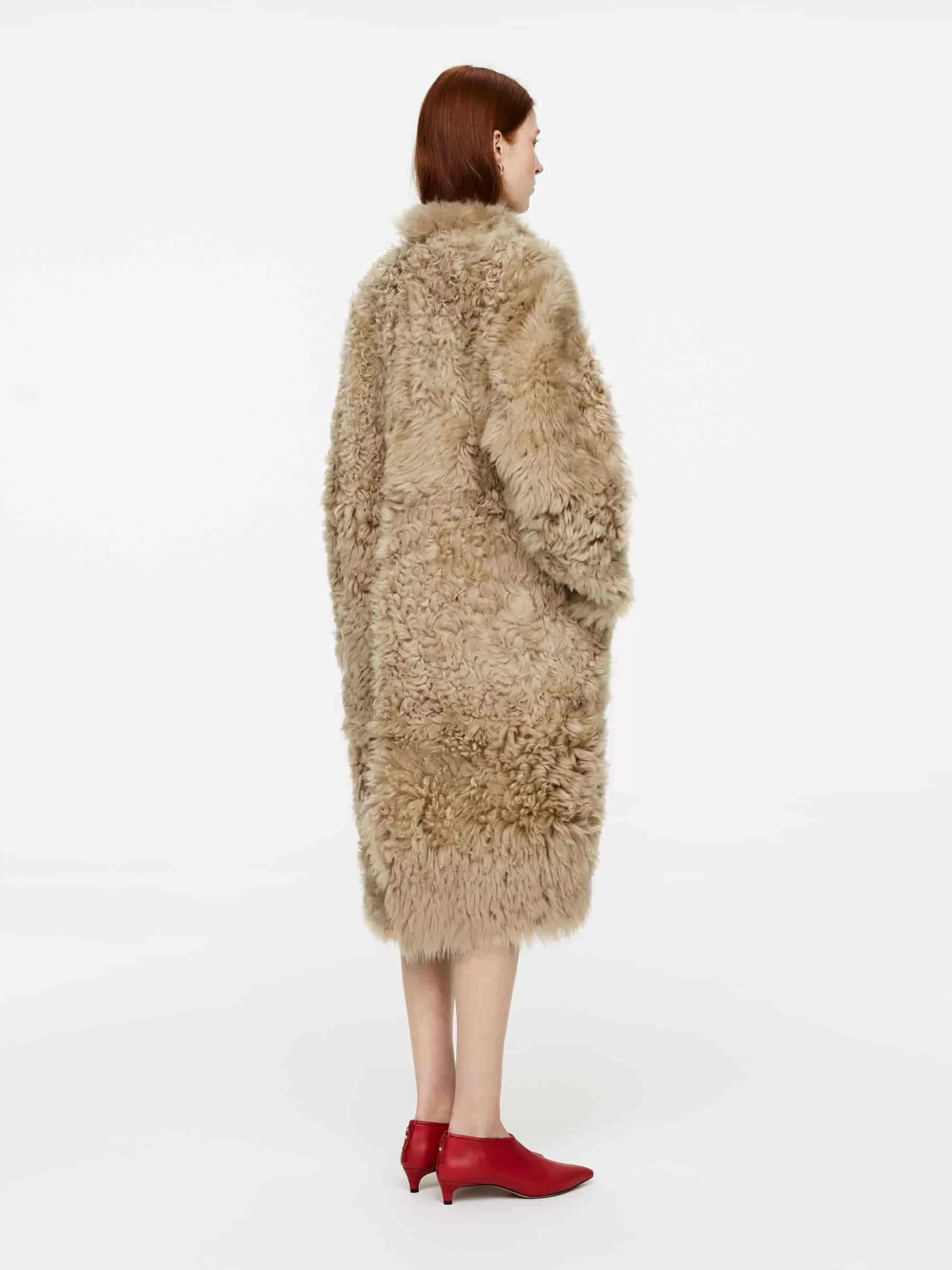 Lammfellmantel mit lockiger Textur auf der Außenseite und Lederfutter. Ein einreihiges Modell mit Taschen an den Seitennähten und Haken- und Riegelverschluss.
