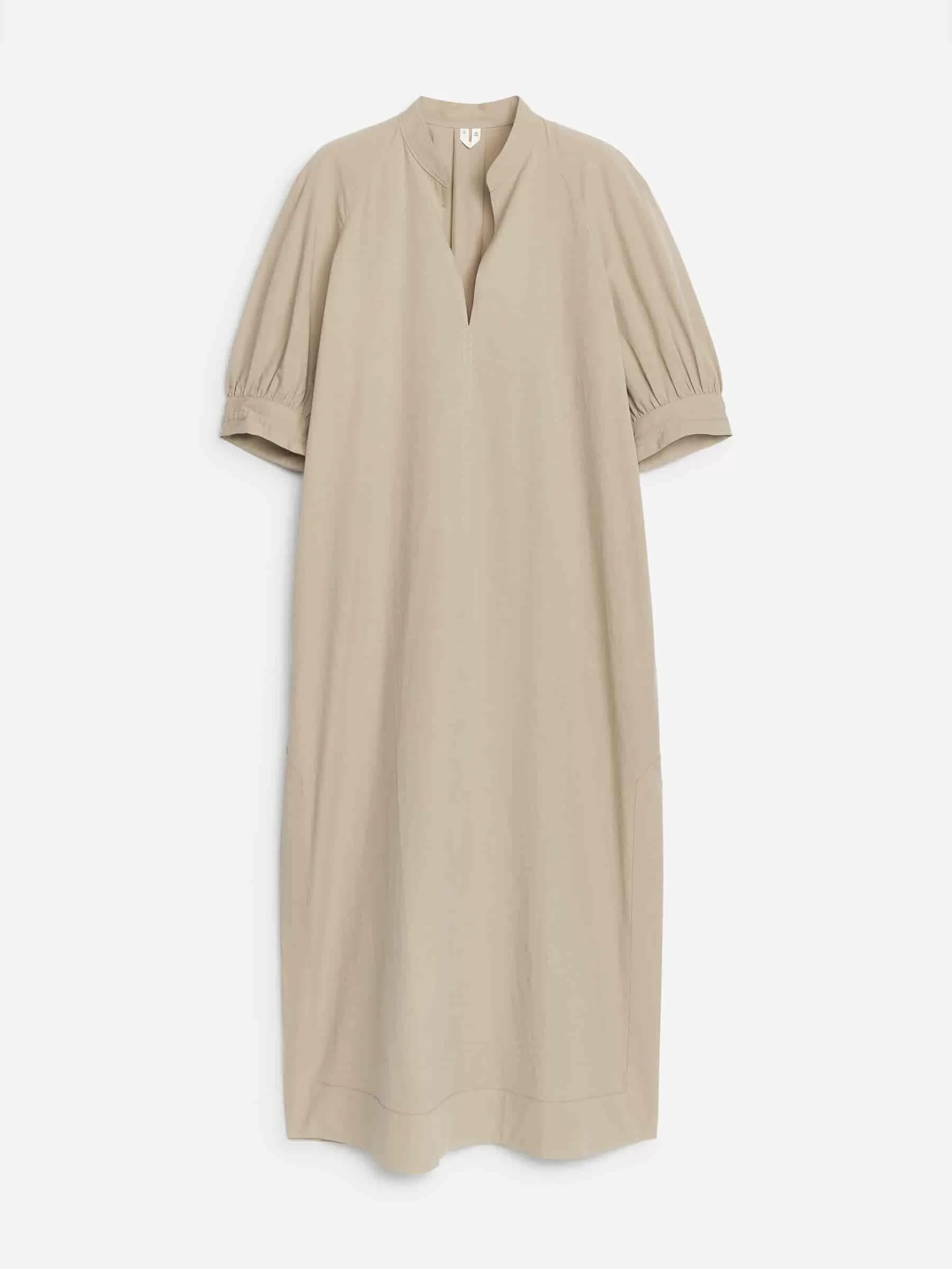 Maxikleid mit Raglan-Puffärmeln und Kordelzug. Mit spitzem V-Ausschnitt und Stehkragen, Seitentaschen und Seitenschlitzen.