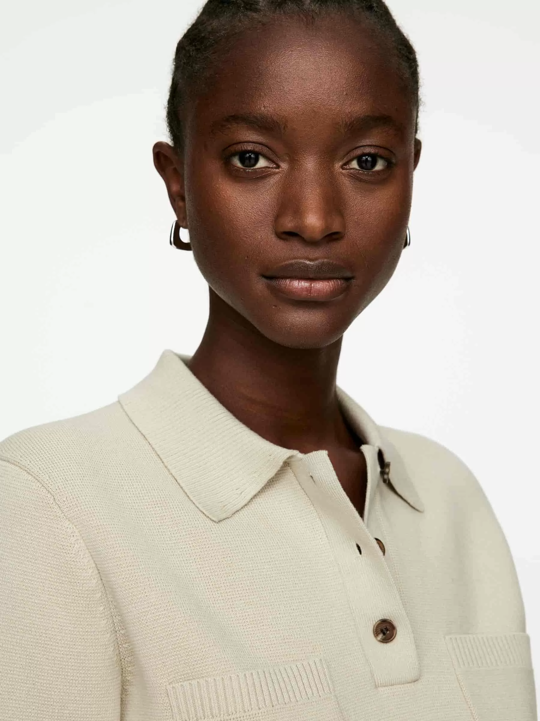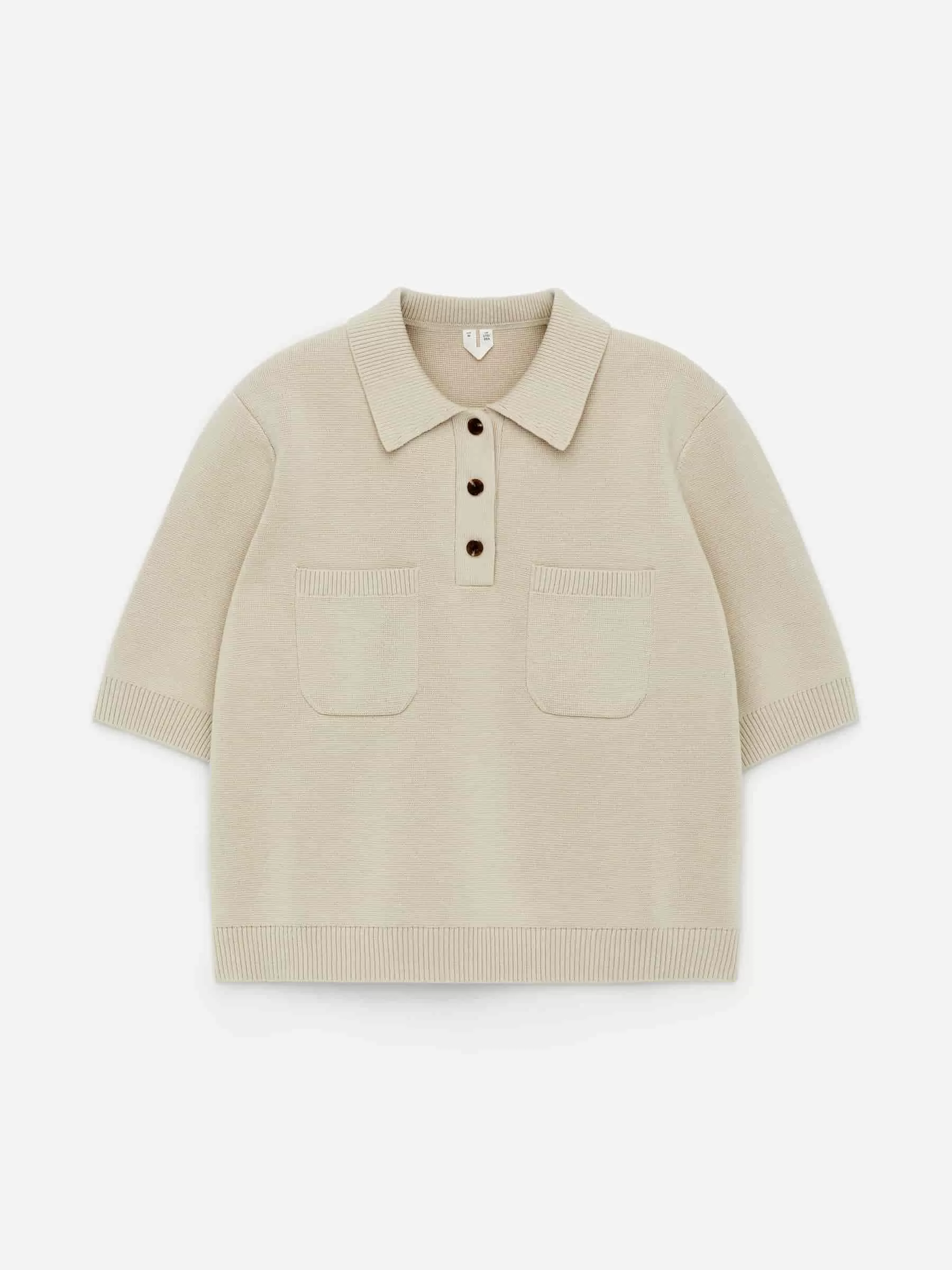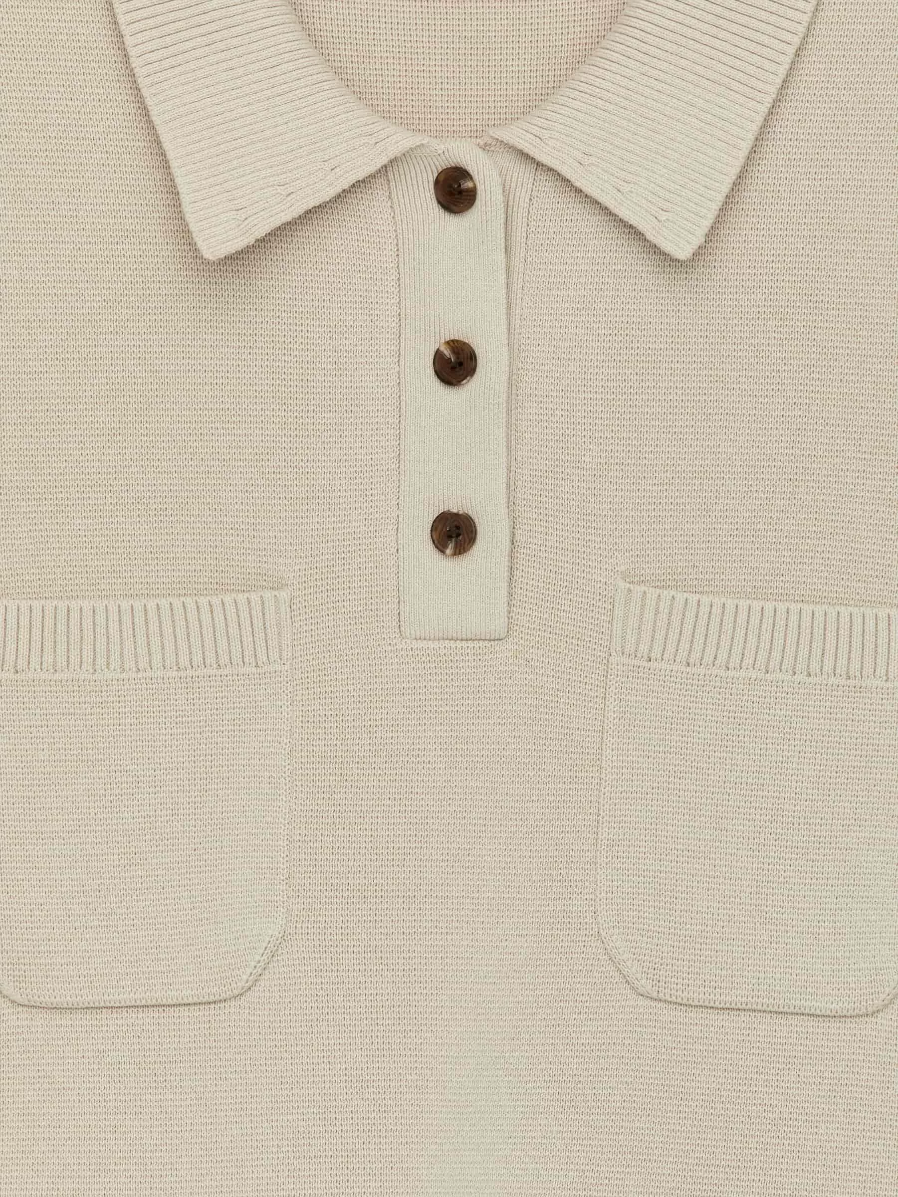 Kurzärmeliges Oberteil aus Baumwolle gestrickt. Mit Hemdkragen, Drei-Knopf-Verschluss und Brusttaschen. Normale Passform.