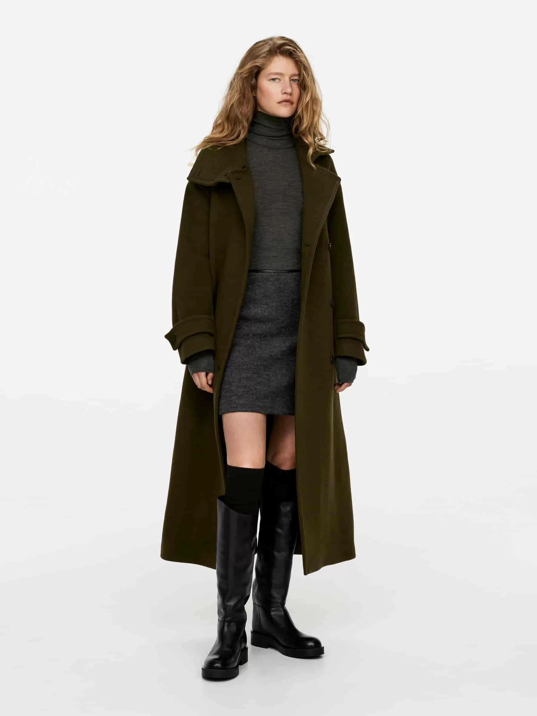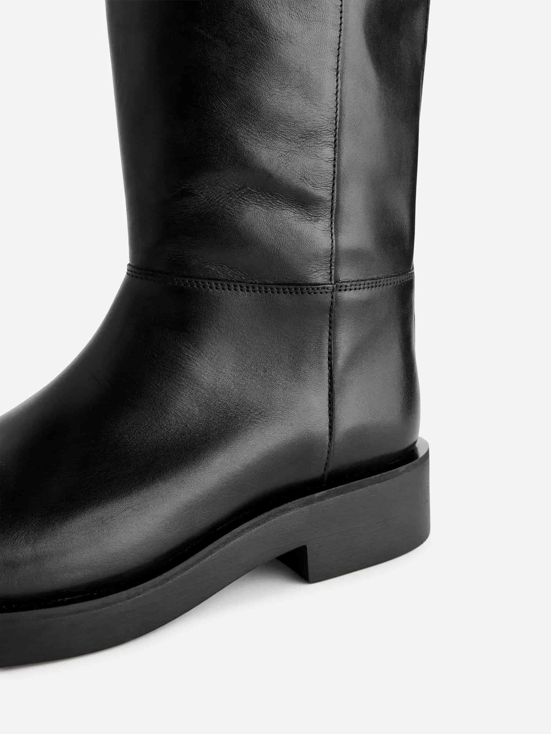 Stiefel, die von klassischen Reitstiefeln inspiriert sind und über dekorative Nähte an der Seite und um das Handgelenk verfügen. Der Zugriemen an der Rückseite erleichtert das Anziehen der Stiefel. Absatzhöhe 3,5 cm. Schafthöhe (Größe 39) 41,4 cm. Stiefelöffnungsumfang (Größe 39) 39,2 cm.