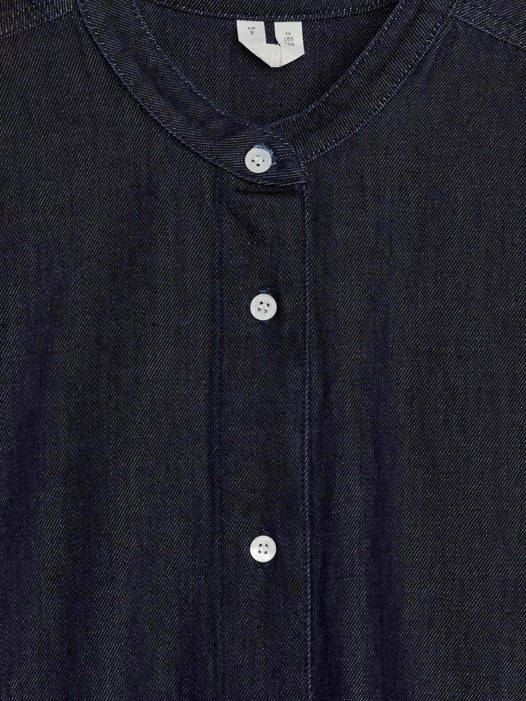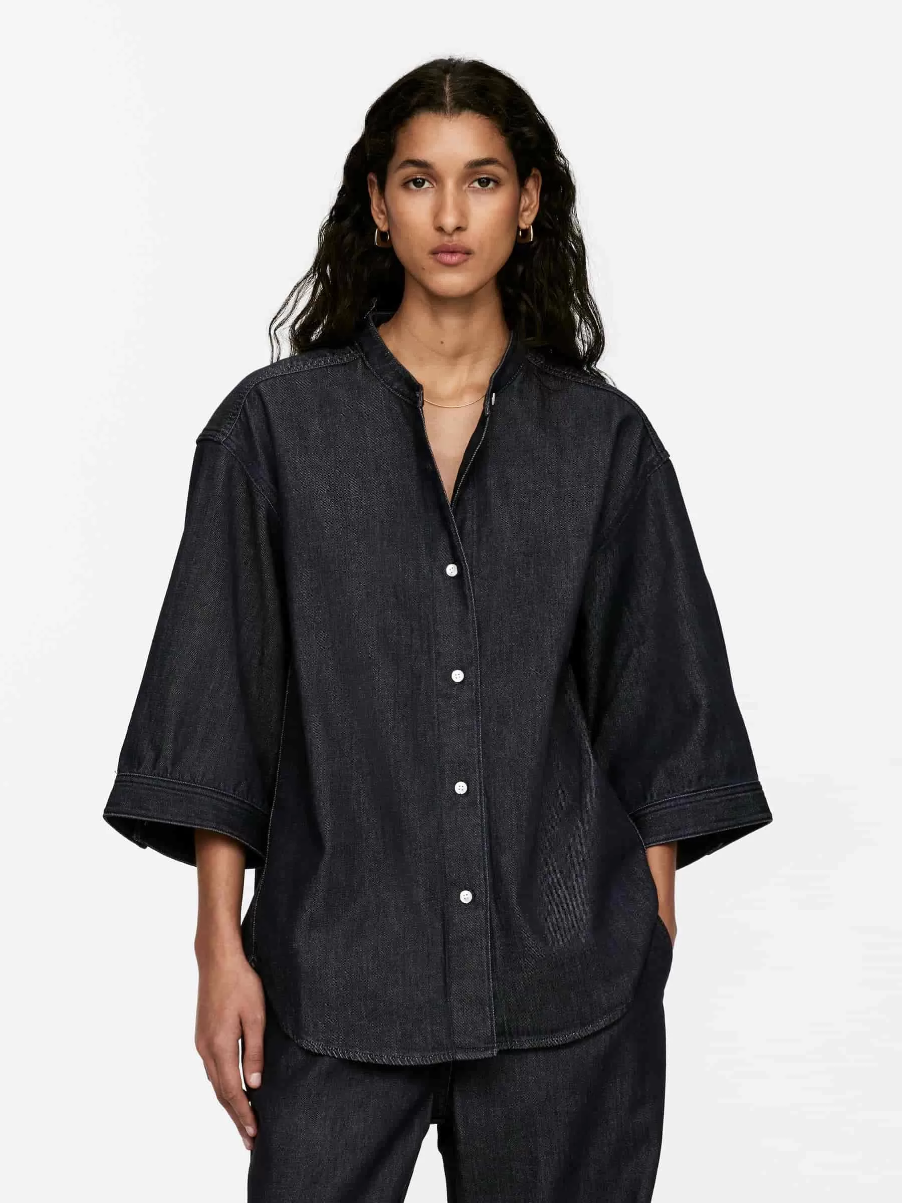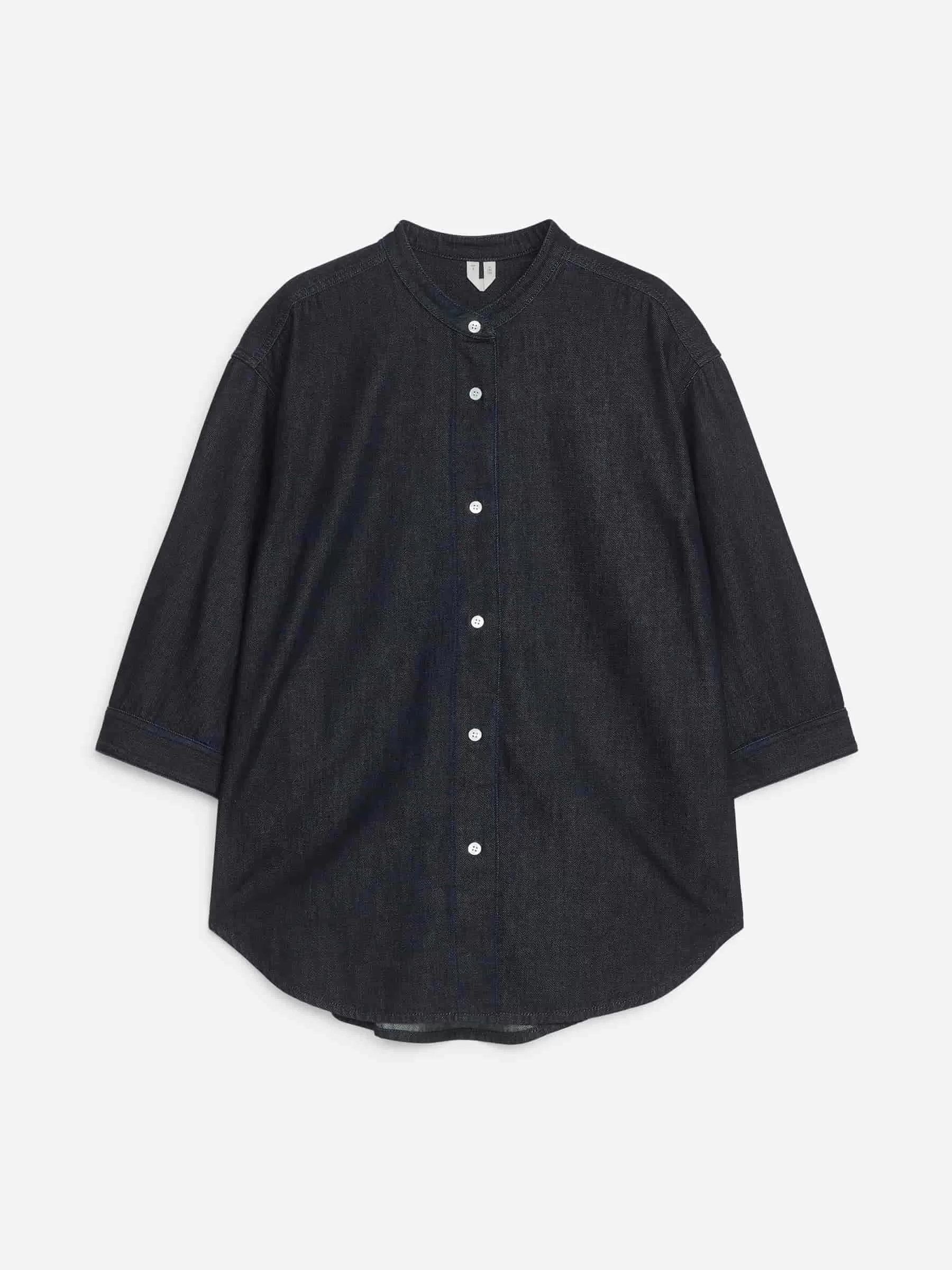 Raw-Jeanshemd aus einer Mischung aus Baumwolle und Lyocell. Ein kragenloses Modell mit Dreiviertelärmeln und geknöpften Manschetten. Normale Passform.