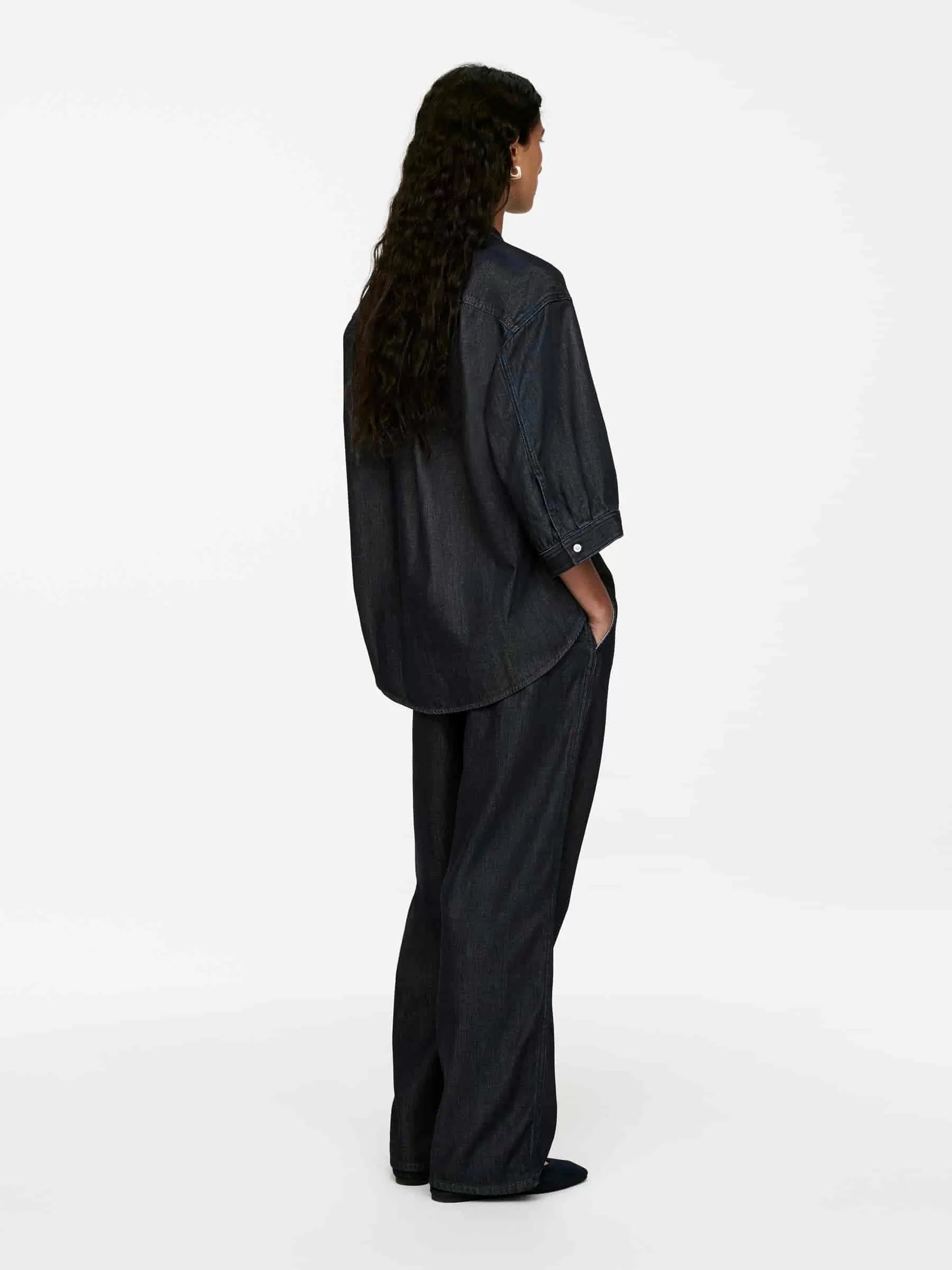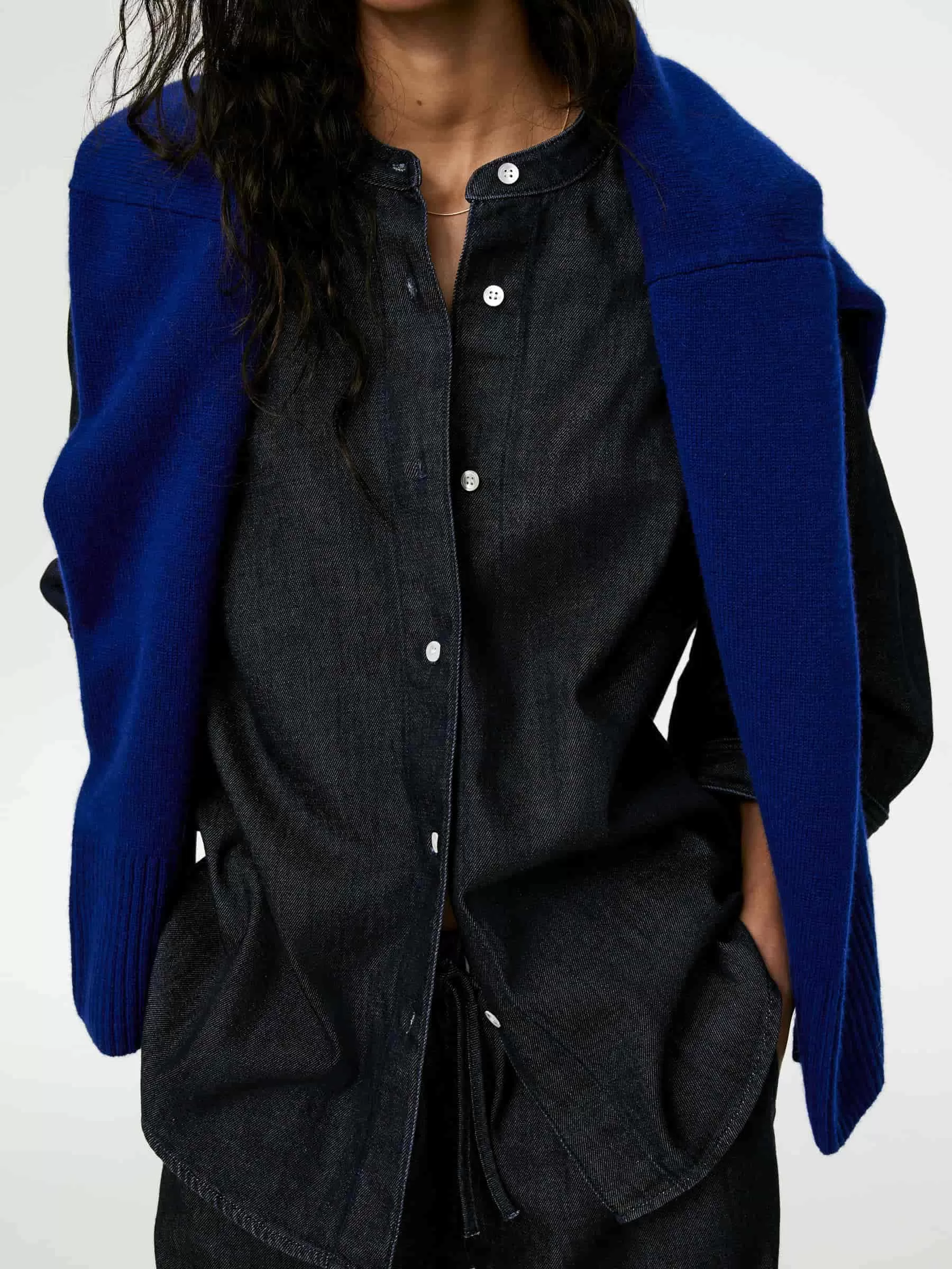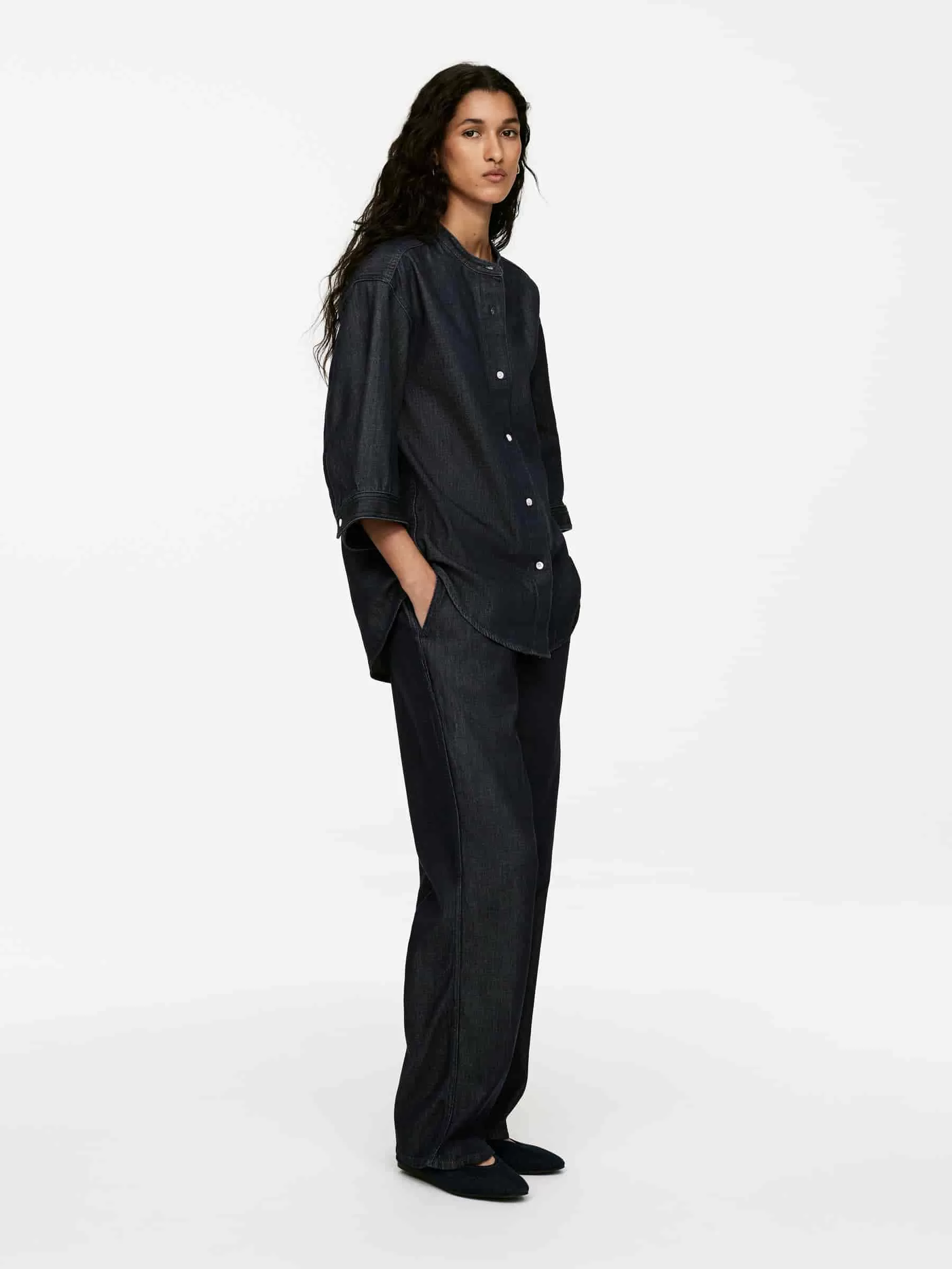 Raw-Jeanshemd aus einer Mischung aus Baumwolle und Lyocell. Ein kragenloses Modell mit Dreiviertelärmeln und geknöpften Manschetten. Normale Passform.