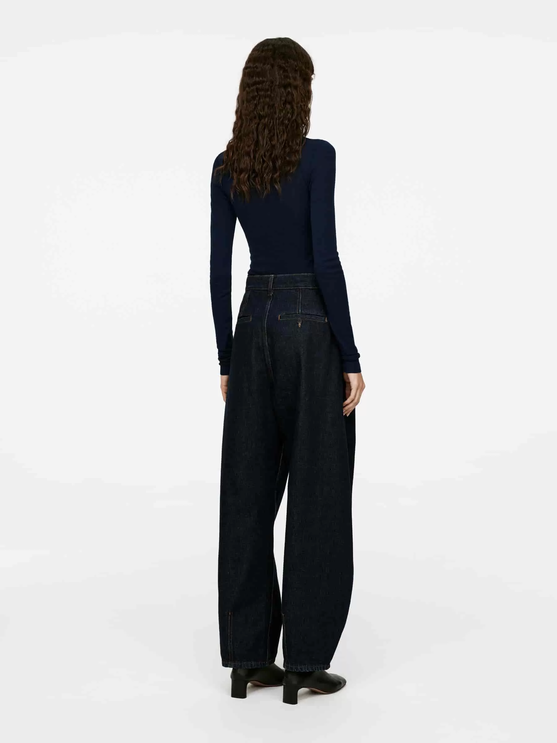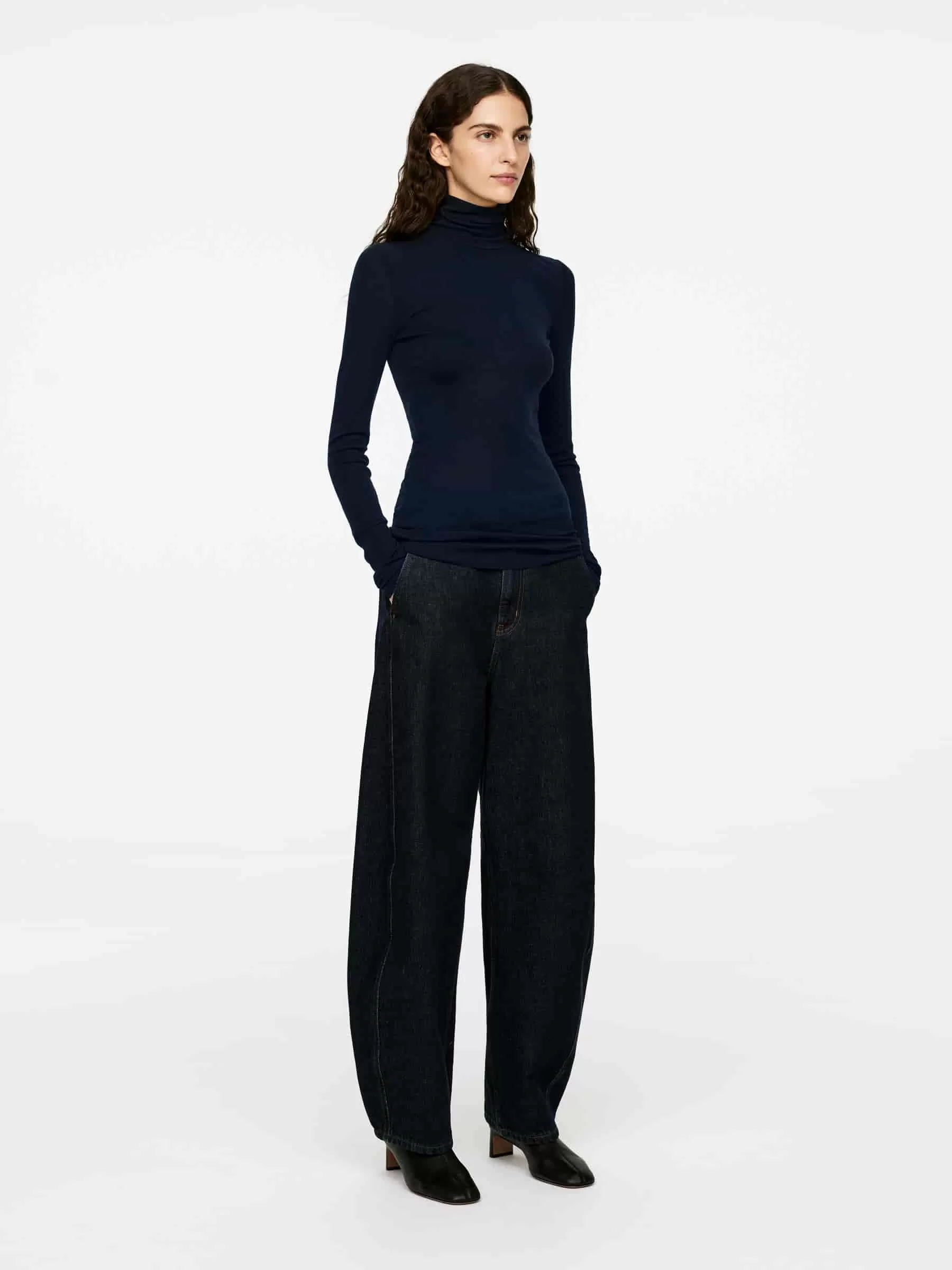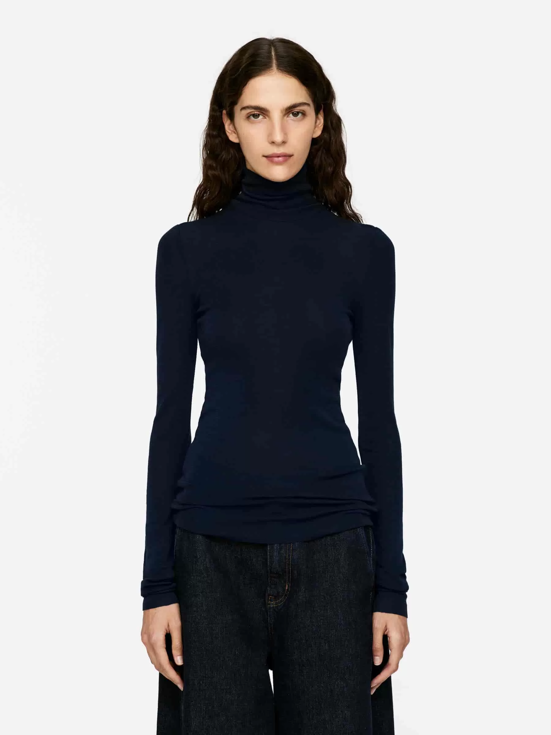 Durchsichtiges Jersey-Top mit Rollkragen, gestrickt aus reiner Merinowolle. Mit unversäuberten Kanten an Bündchen, Hals und Saum. Dieses Oberteil enthält 100 % RWS-Wolle, zertifiziert durch die Kontrollunion 893290. Produkte, die nach dem Responsible Wool Standard (RWS) zertifiziert sind, enthalten Wollfasern von Farmen, die unabhängig die Tierschutz- und Landbewirtschaftungsanforderungen erfüllen.
