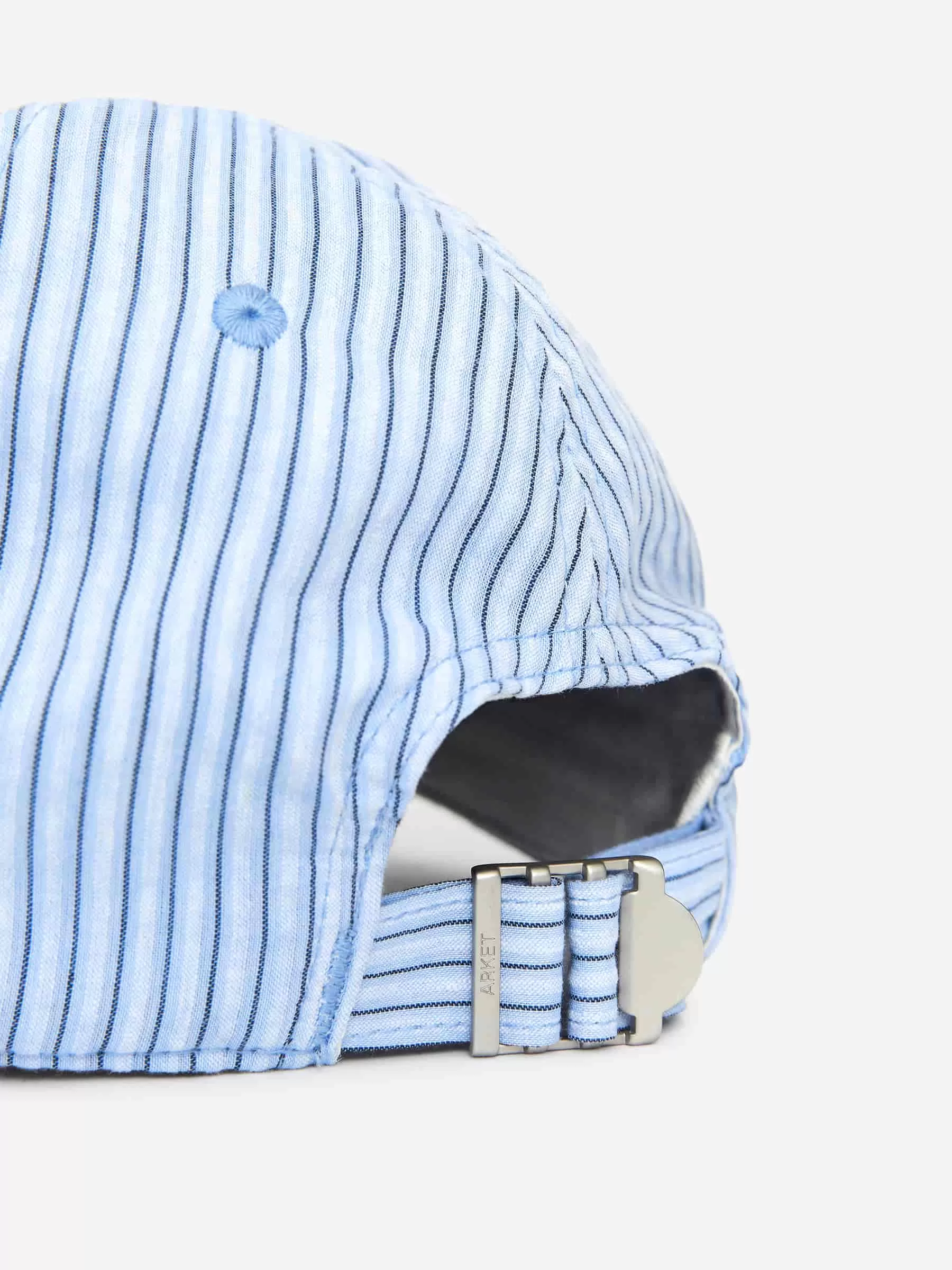 Mütze aus einem Seersucker-Gewebe aus Baumwolle und Leinen. Riemen mit Metallschnalle auf der Rückseite zum Anpassen der Größe.