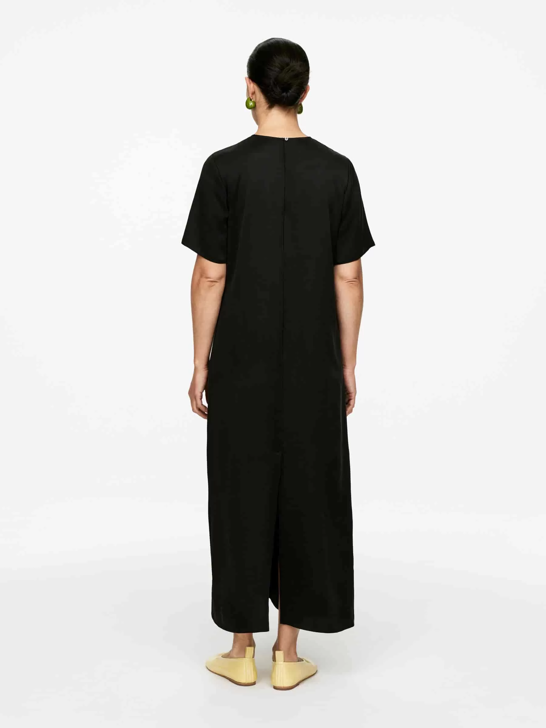 Ganzlanges Kleid aus reiner Seide. Ein kurzärmliges Modell mit einem Schlitz in der Mitte des Rückens. Normale Passform.