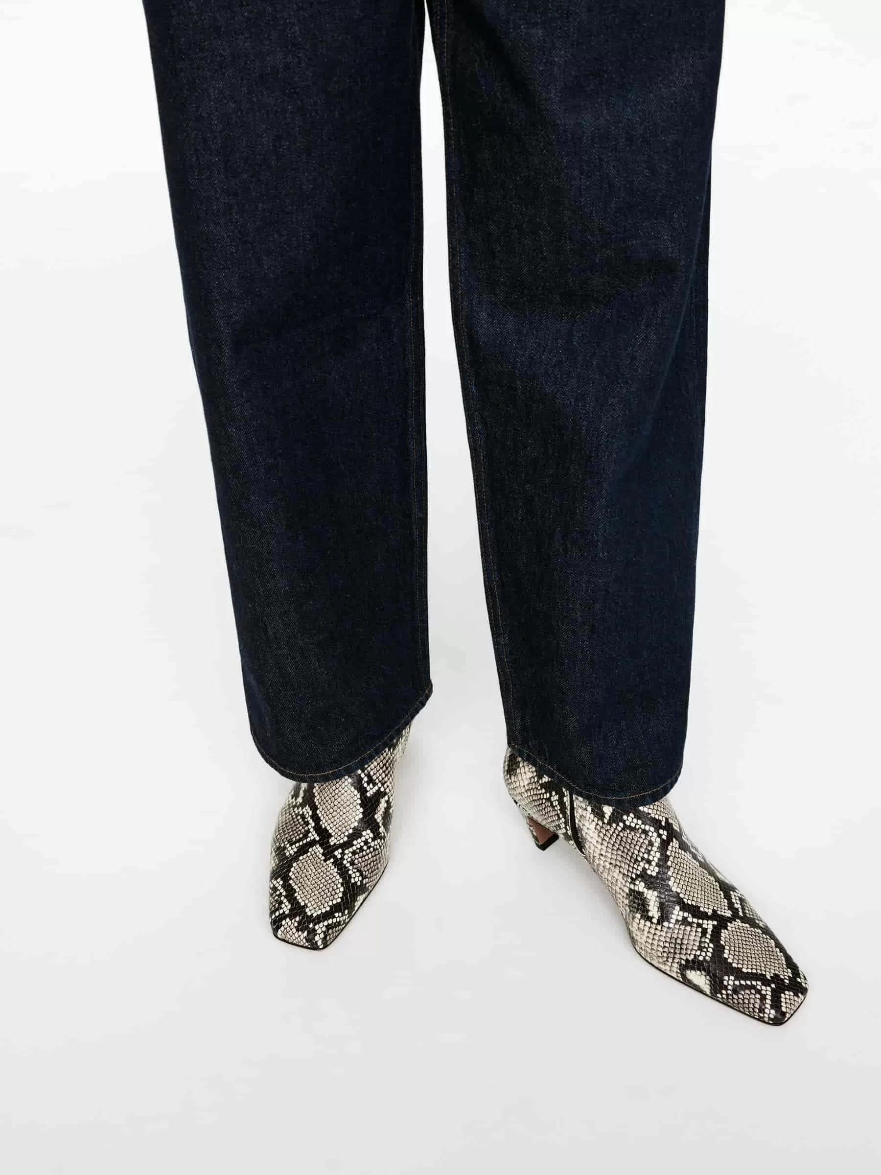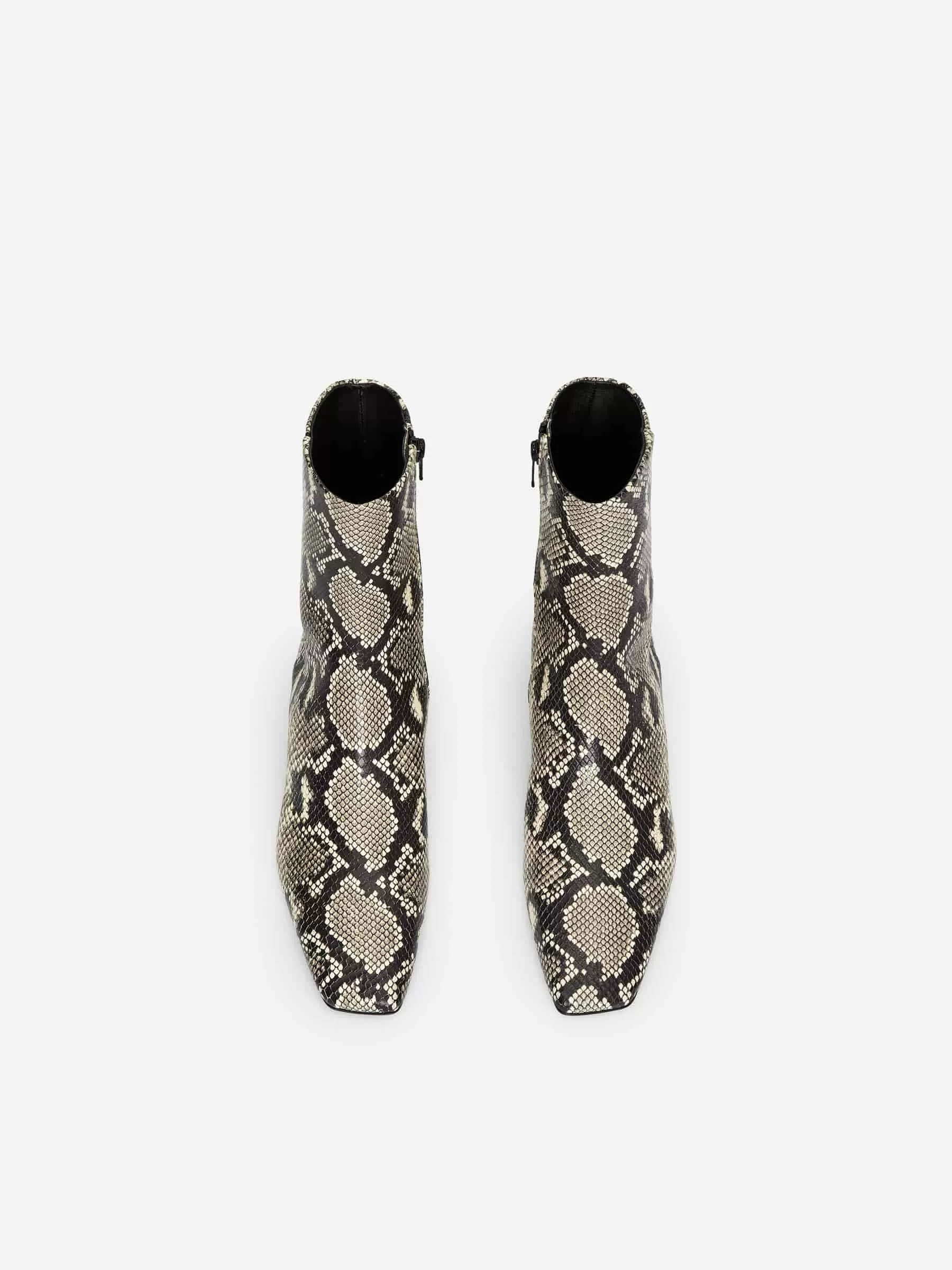 Stiefel aus Leder mit schlangenartigem Muster. Das Leder wurde einem chromfreien Gerbungsprozess unterzogen. Ein schlichter Schnitt mit leicht abgerundetem Absatz und quadratischer Spitze. Reißverschluss auf der Innenseite. Absatzhöhe 5 cm.