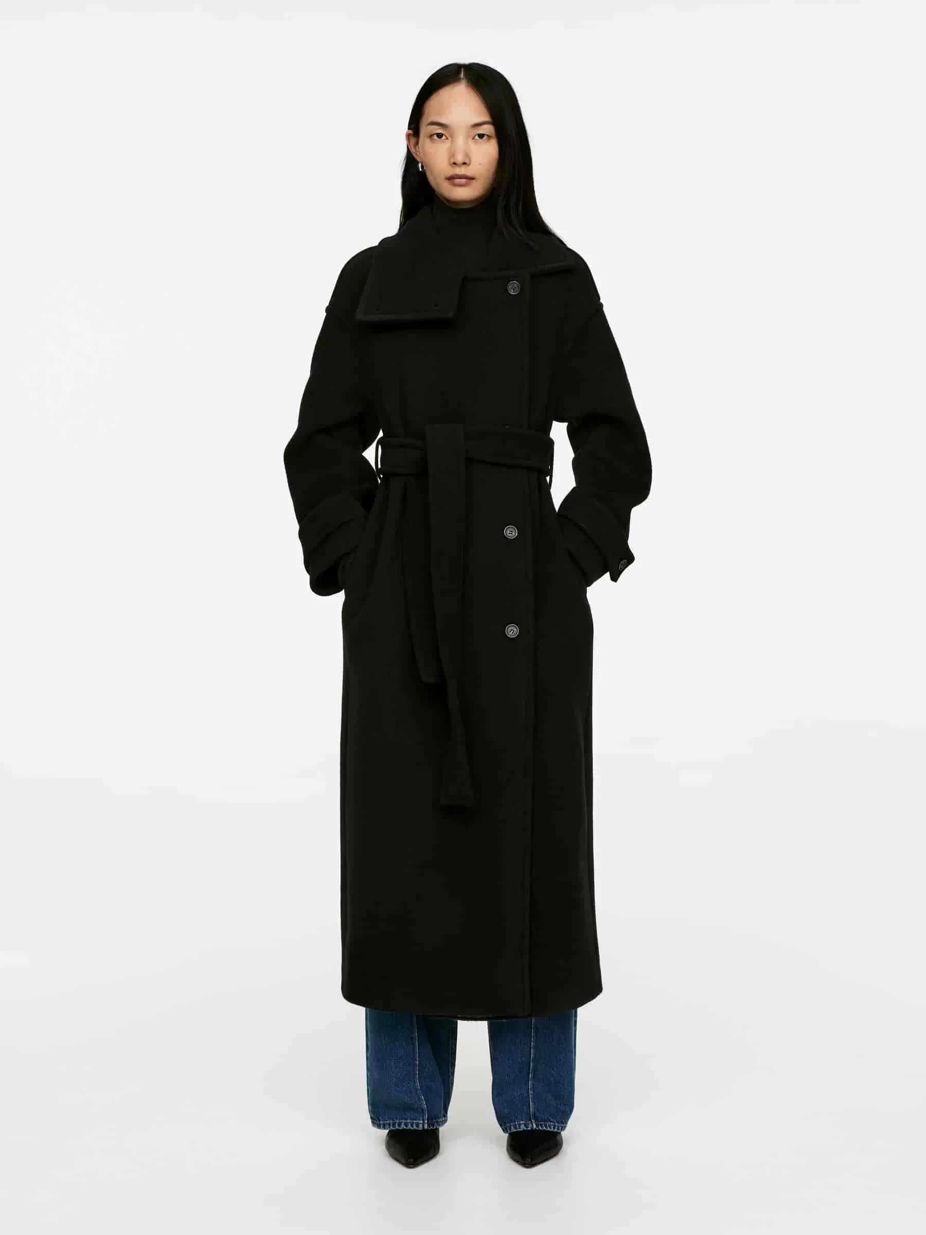 Maximantel mit Gürtel aus einer Wollmischung. Ein vollständig gefütterter, einreihiger Stil mit einem Kragen, der umgeschlagen oder stehend getragen werden kann. Taschen an den Seitennähten, Ärmel und Ärmellaschen mit Knopfverschluss. Übergroße Passform. Der Stil besteht zu 75 % aus RWS-Wolle (TE-00047206). Produkte, die nach dem Responsible Wool Standard (RWS) zertifiziert sind, enthalten Wollfasern von Farmen, die unabhängig nach Tierschutz- und Landbewirtschaftungsanforderungen zertifiziert sind.