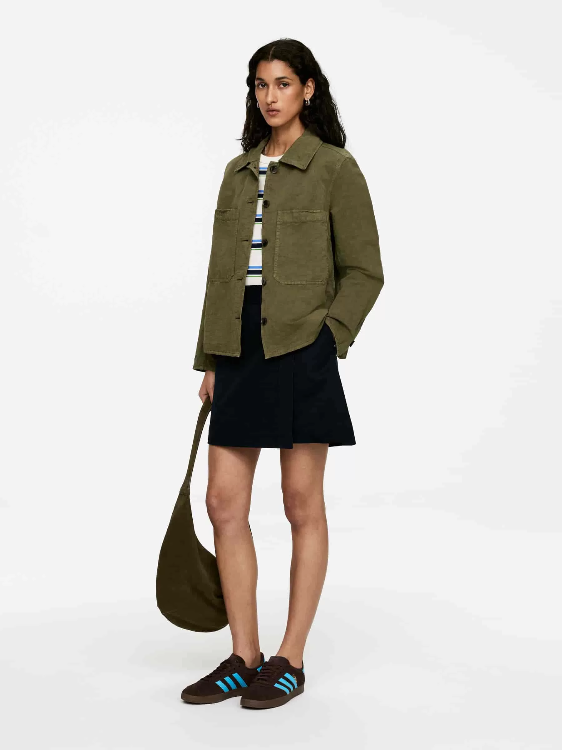 Überhemd im Workwear-Stil mit kurzer, kastenförmiger Passform. Mit geräumigen aufgesetzten Taschen auf der Brust und Knöpfen in der Mitte vorne in Kontrastfarbe.