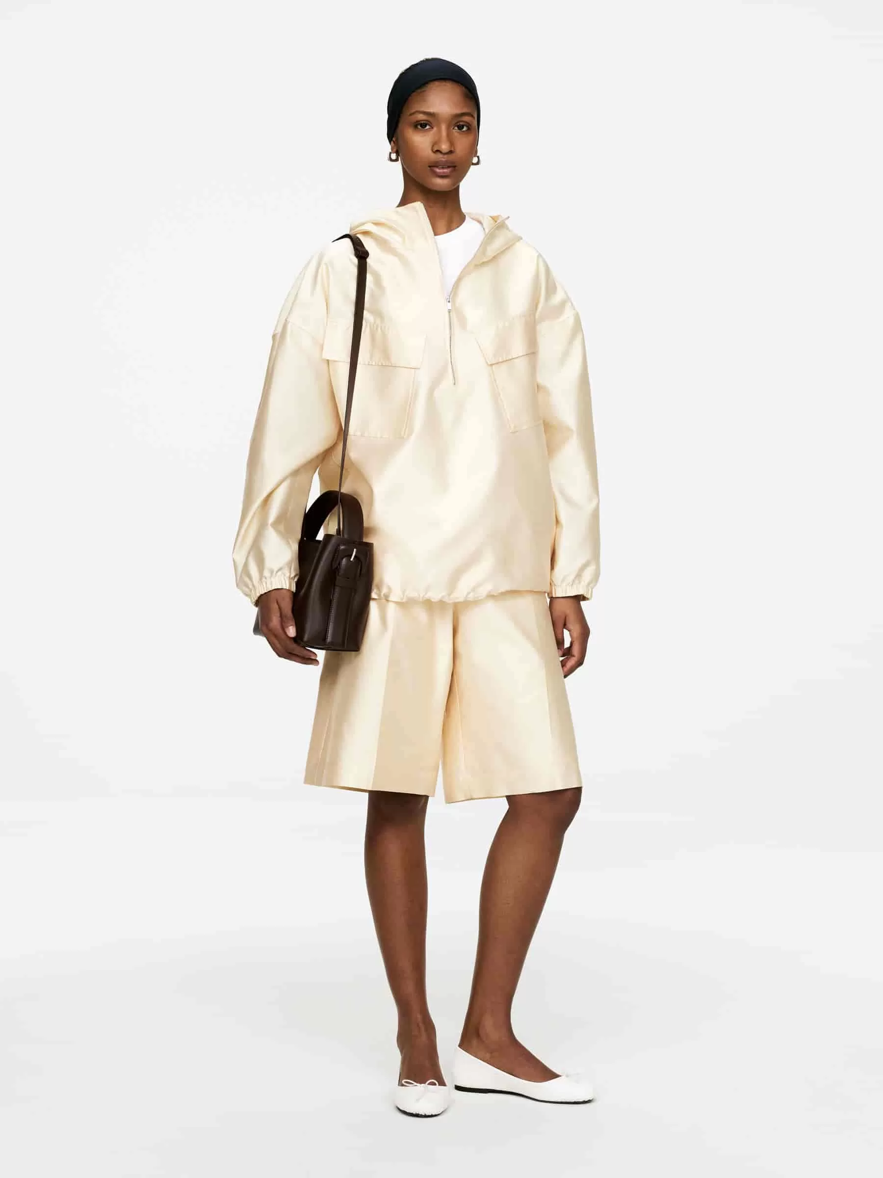 Mittelgroße Umhängetasche aus festem Lederfaserstoff. Ausgestattet mit einem Magnetverschluss und einem breiten oberen Griff mit lederbezogener Schnalle. Sowohl der Schultergurt als auch der obere Griff sind in der Länge verstellbar. Die Tasche verfügt über ein mittleres Fach mit Reißverschluss.  Abmessungen 23 cm x 19 cm x 10,5 cm. Das verwendete Leder wurde einem chromfreien Gerbungsprozess unterzogen.