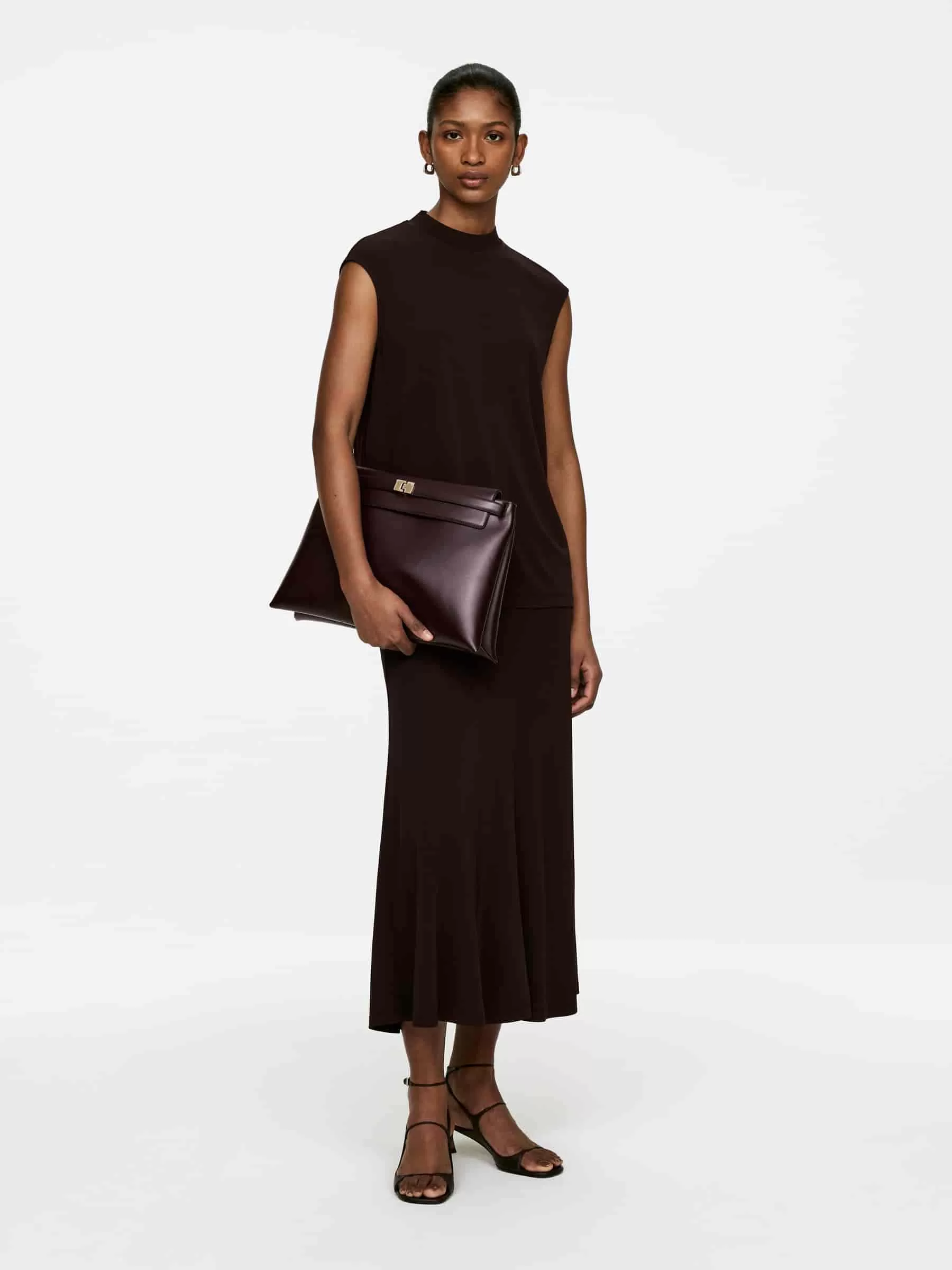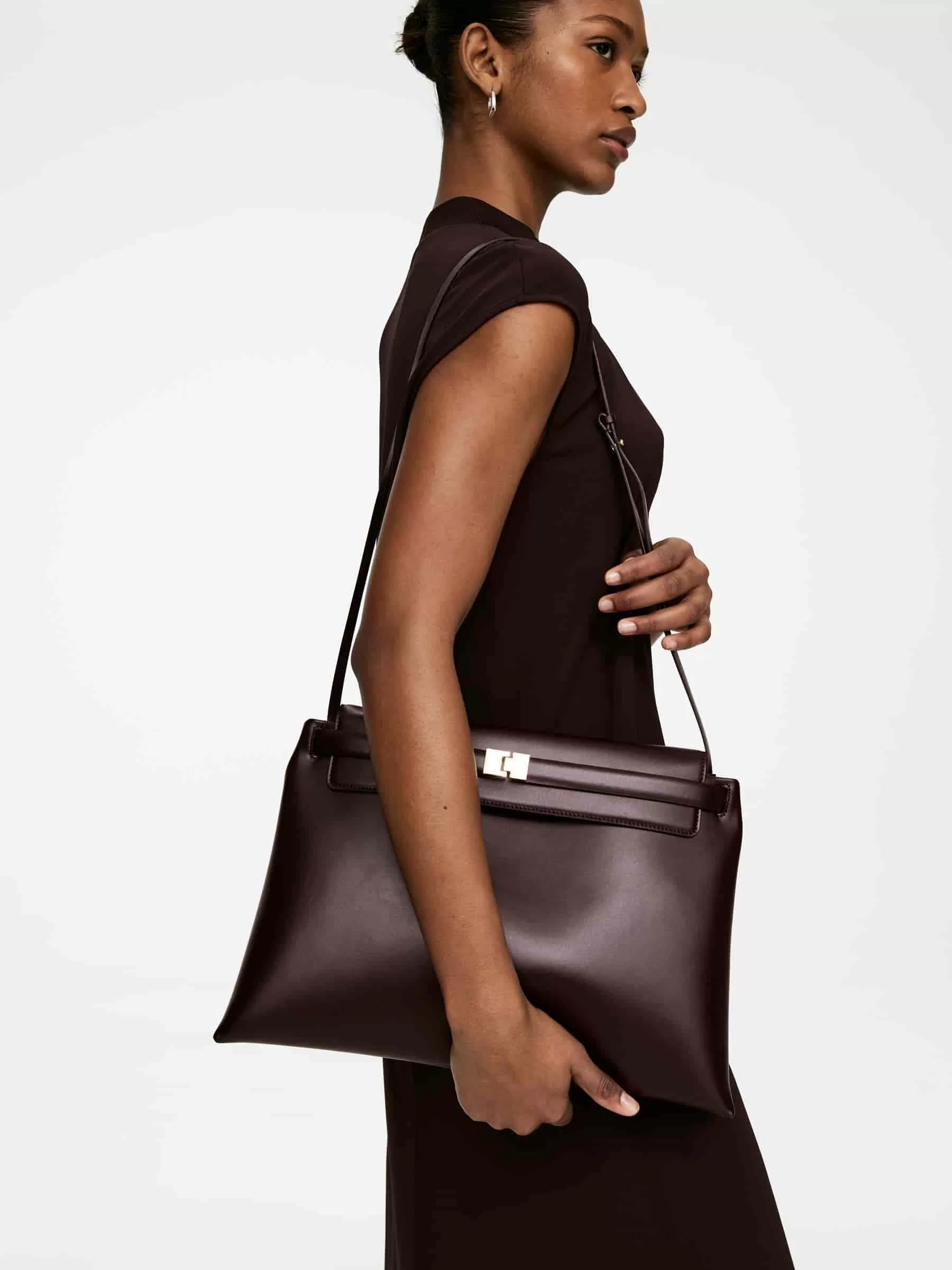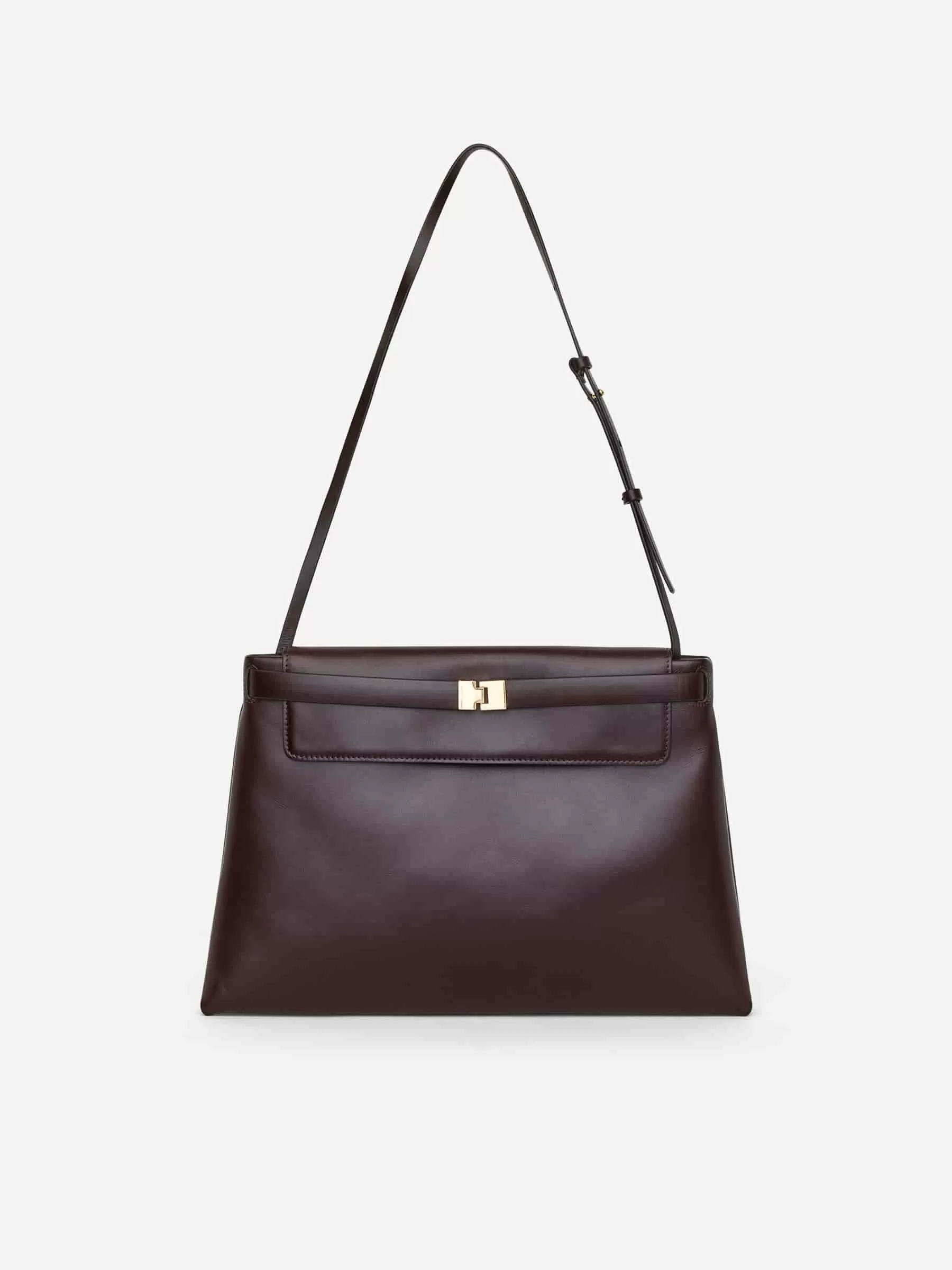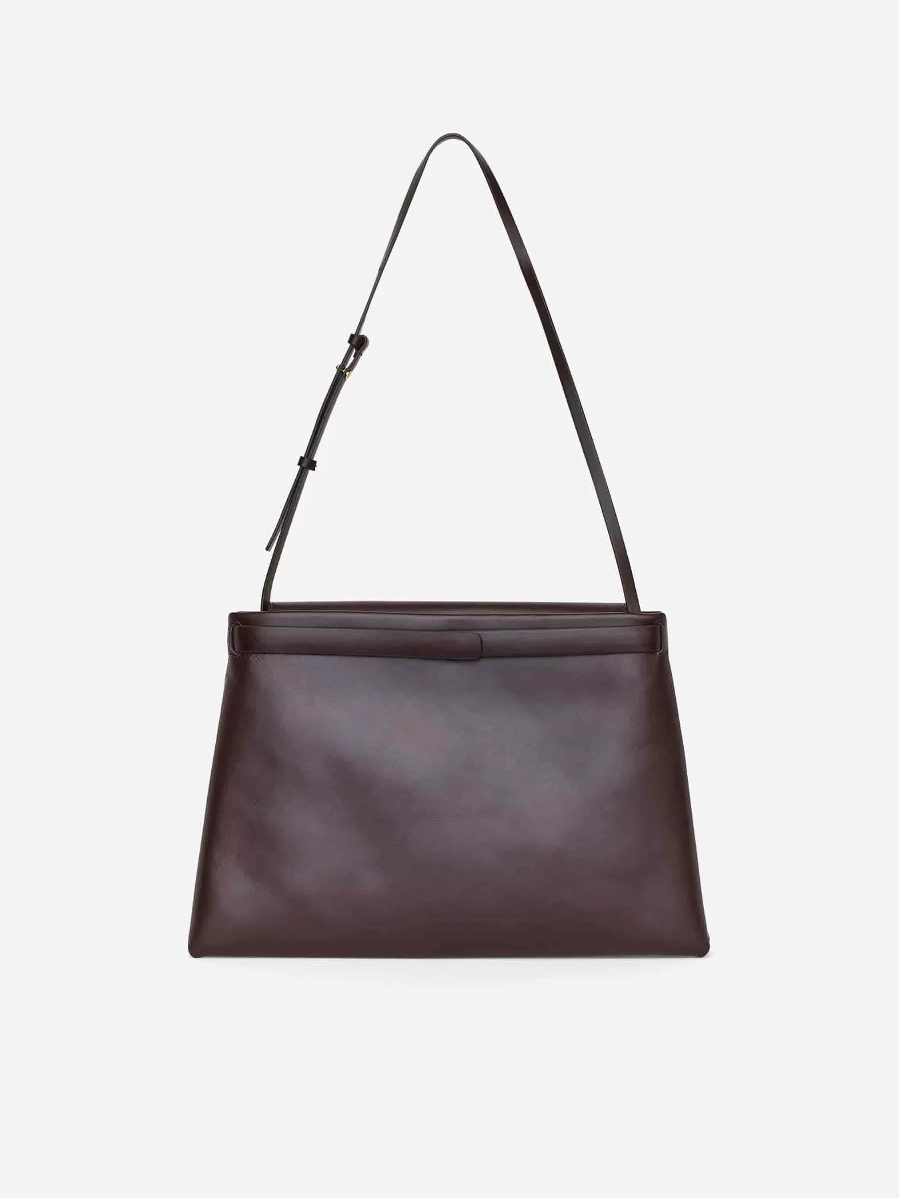 Tasche aus chromfreiem Leder. Ausgestattet mit einem abnehmbaren Gürtel mit vergoldeter Schnalle um die obere Klappe. Abnehmbarer Schultergurt und Reißverschluss. Die Tasche kann als Clutch oder über der Schulter getragen werden. Maße 39 x 25,5 cm.