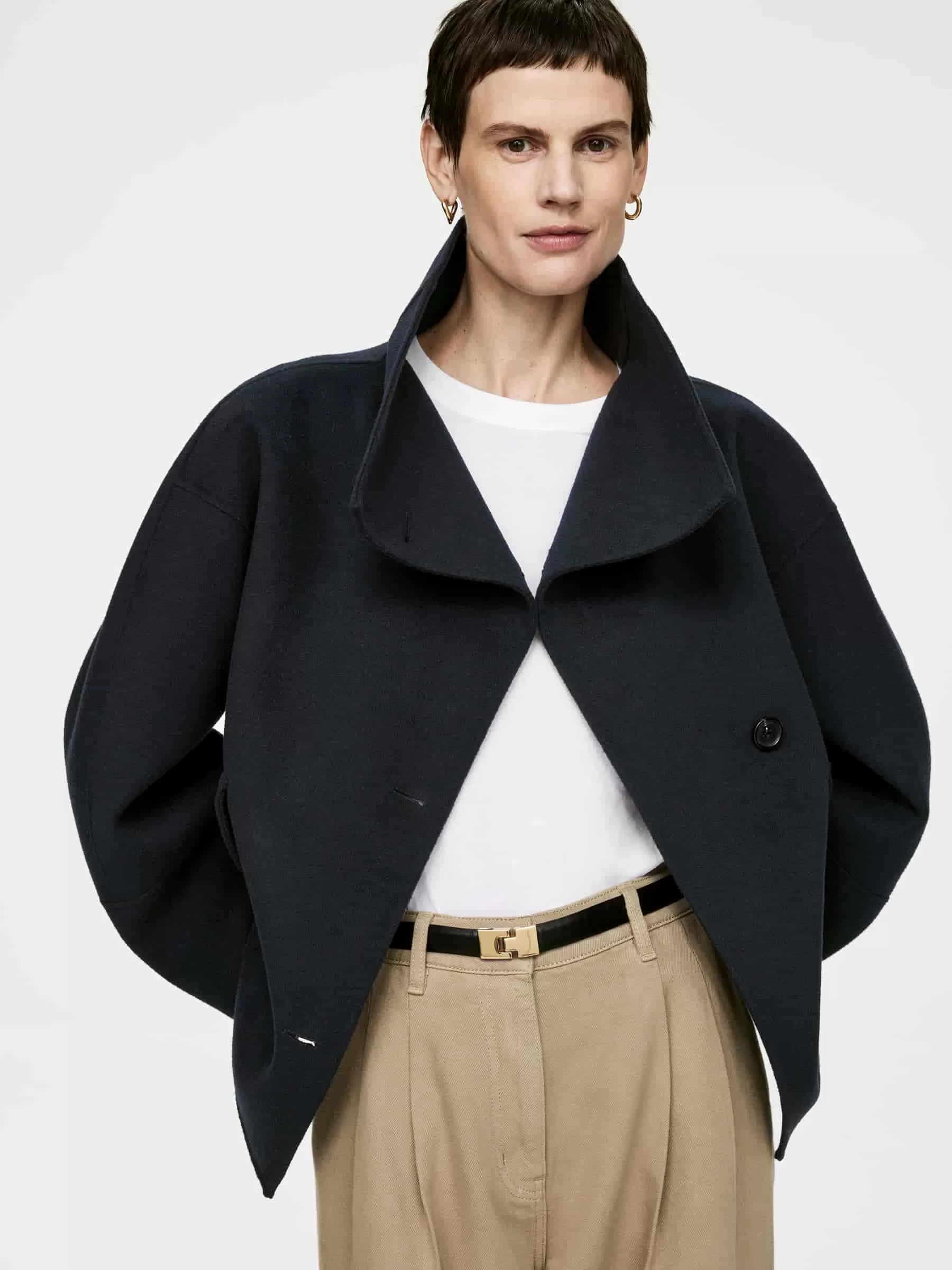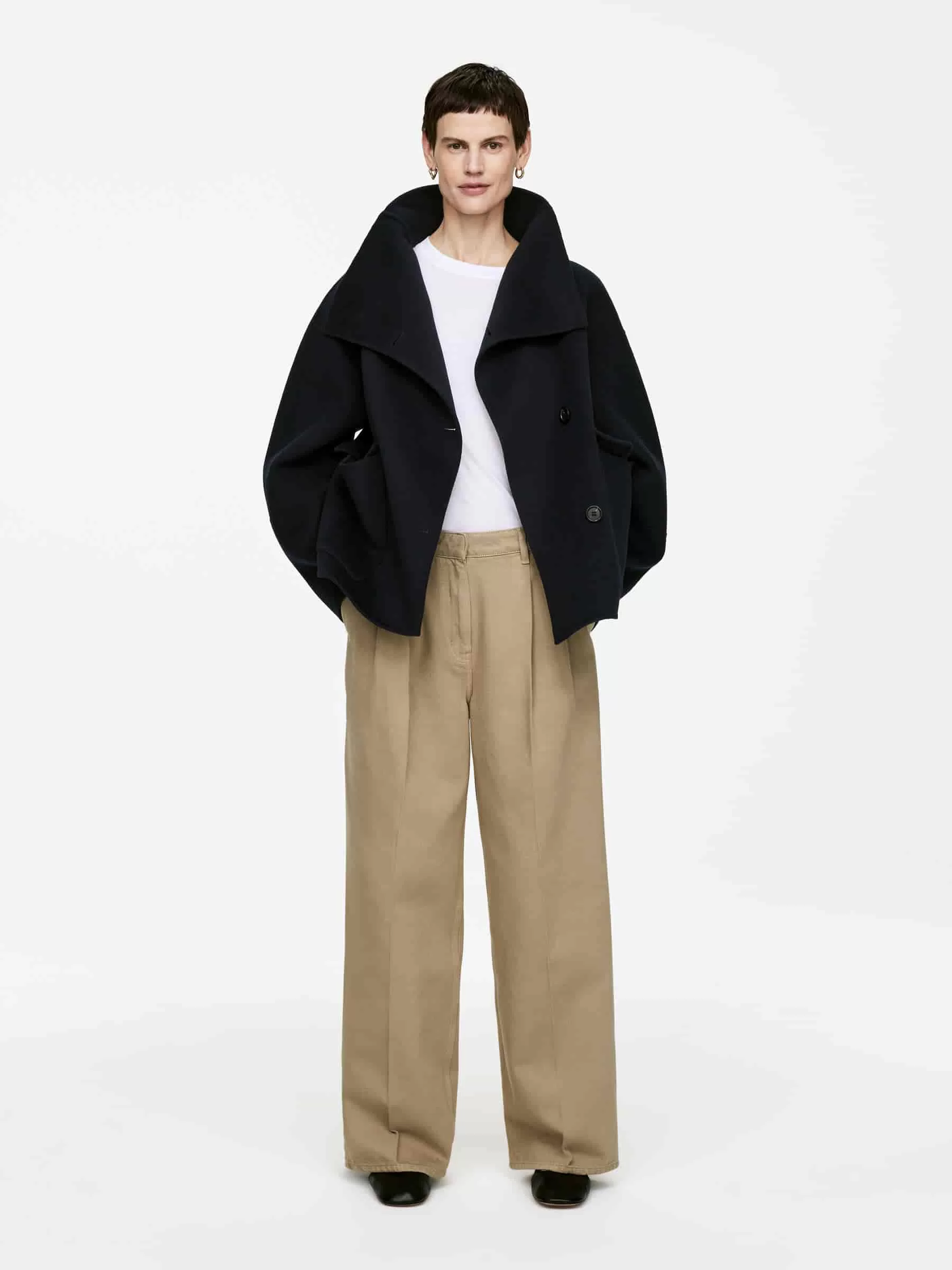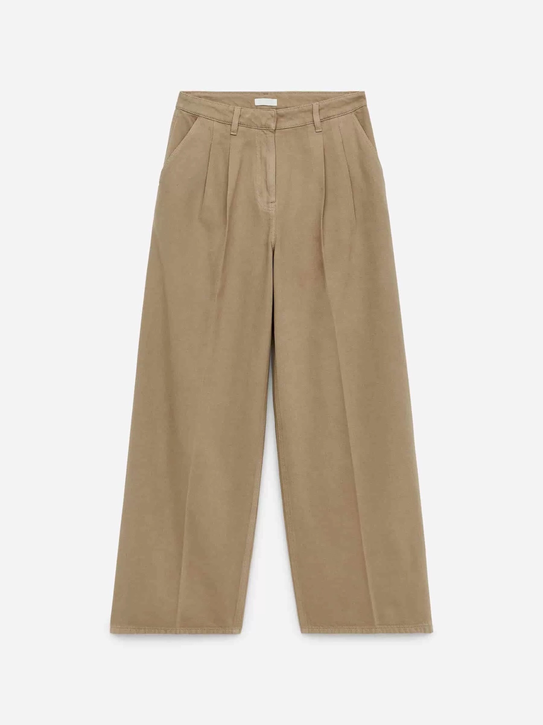 Jeanshose mit weitem Bein aus Baumwoll-Lyocell-Stoff mit gewaschenem Finish. Ein maßgeschneiderter Stil mit Bügelfalten vorne und hinten. Haken- und Ösenverschluss, schräge Seitentaschen und Leistentaschen hinten.