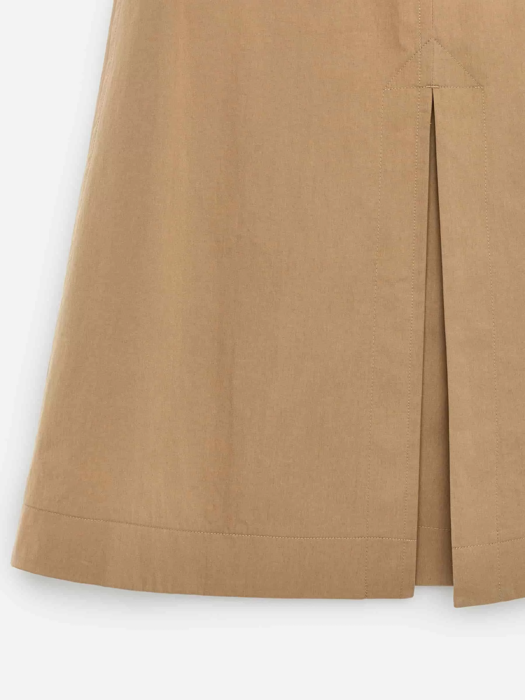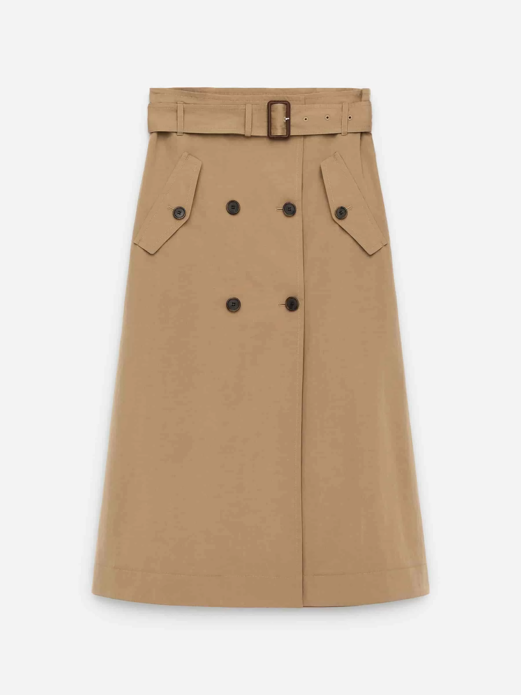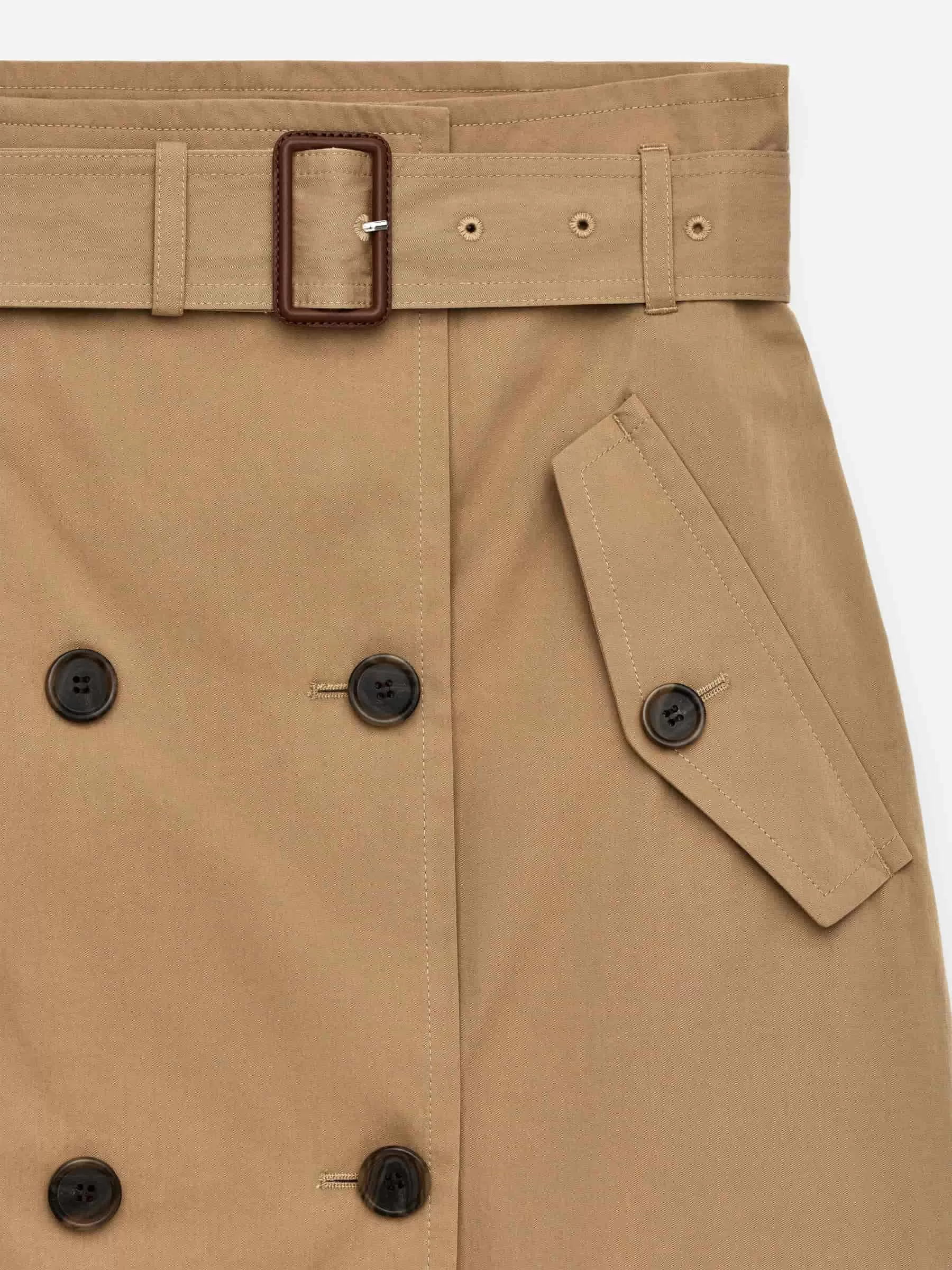 Midirock in A-Linie mit Details im Trench-Stil, einschließlich Wickelverschluss mit Knöpfen, schrägen Seitentaschen mit Klappen und Gürtel. Schlitz hinten.
