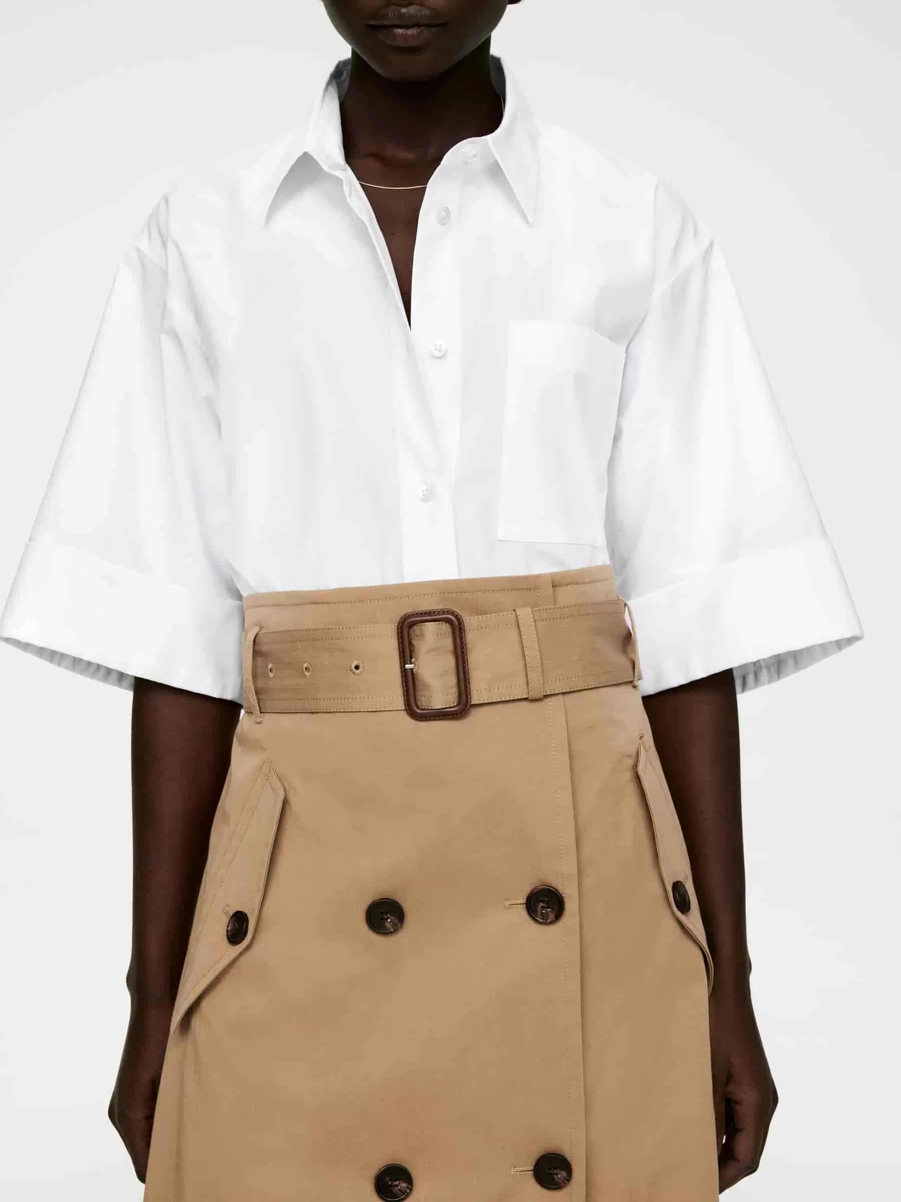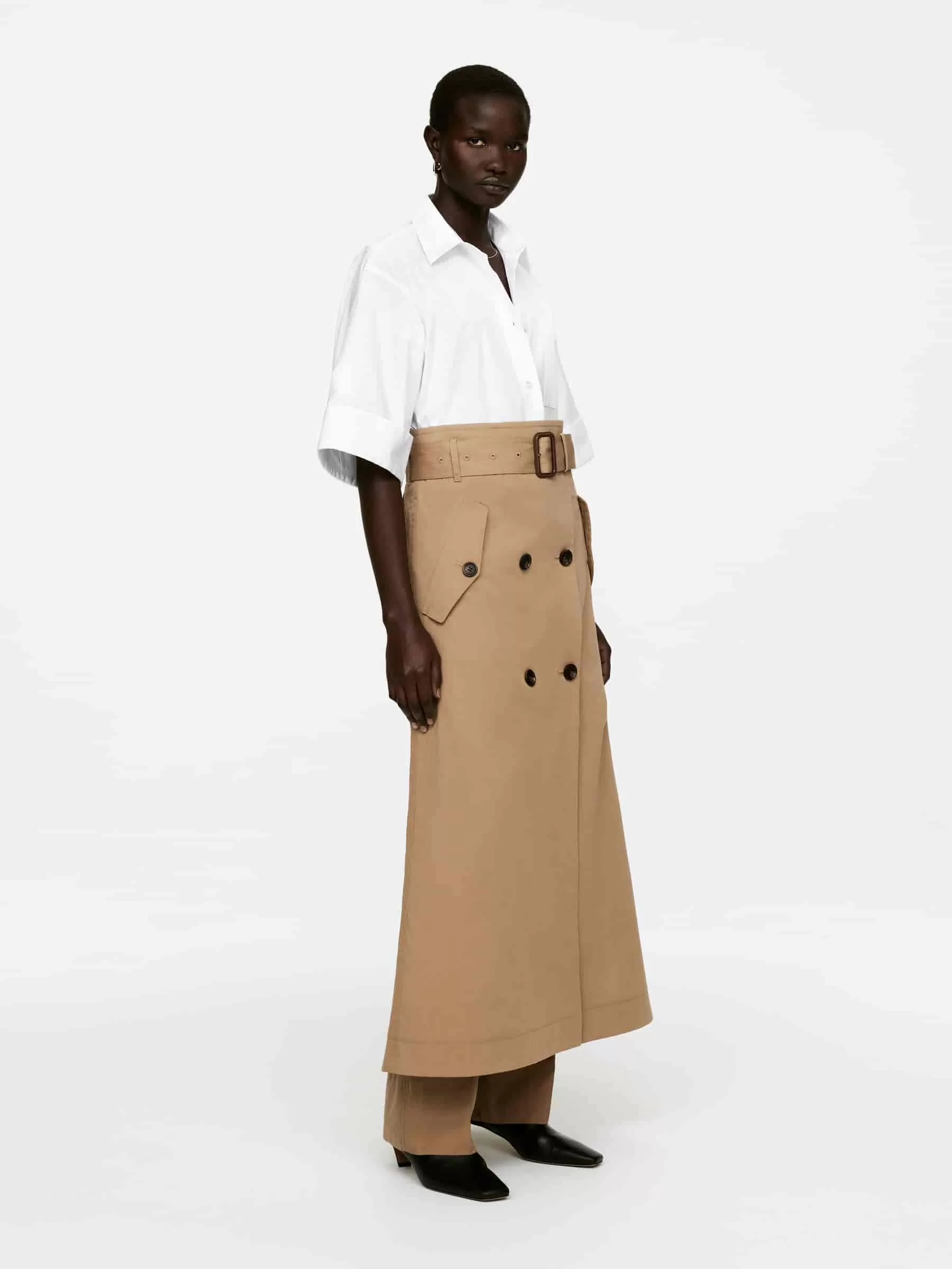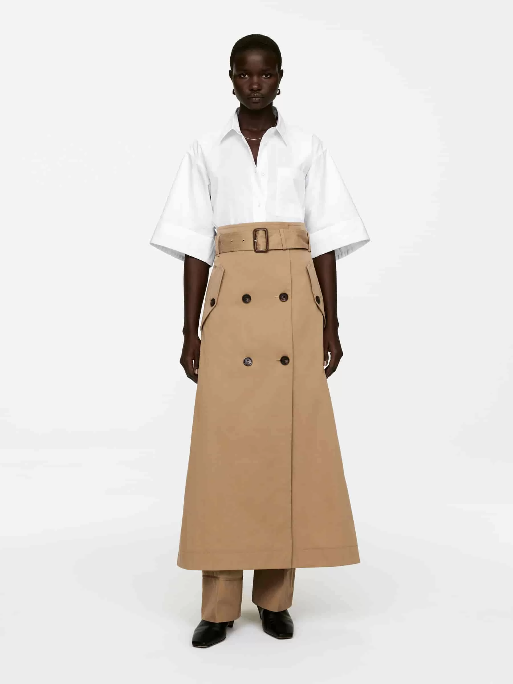 Midirock in A-Linie mit Details im Trench-Stil, einschließlich Wickelverschluss mit Knöpfen, schrägen Seitentaschen mit Klappen und Gürtel. Schlitz hinten.