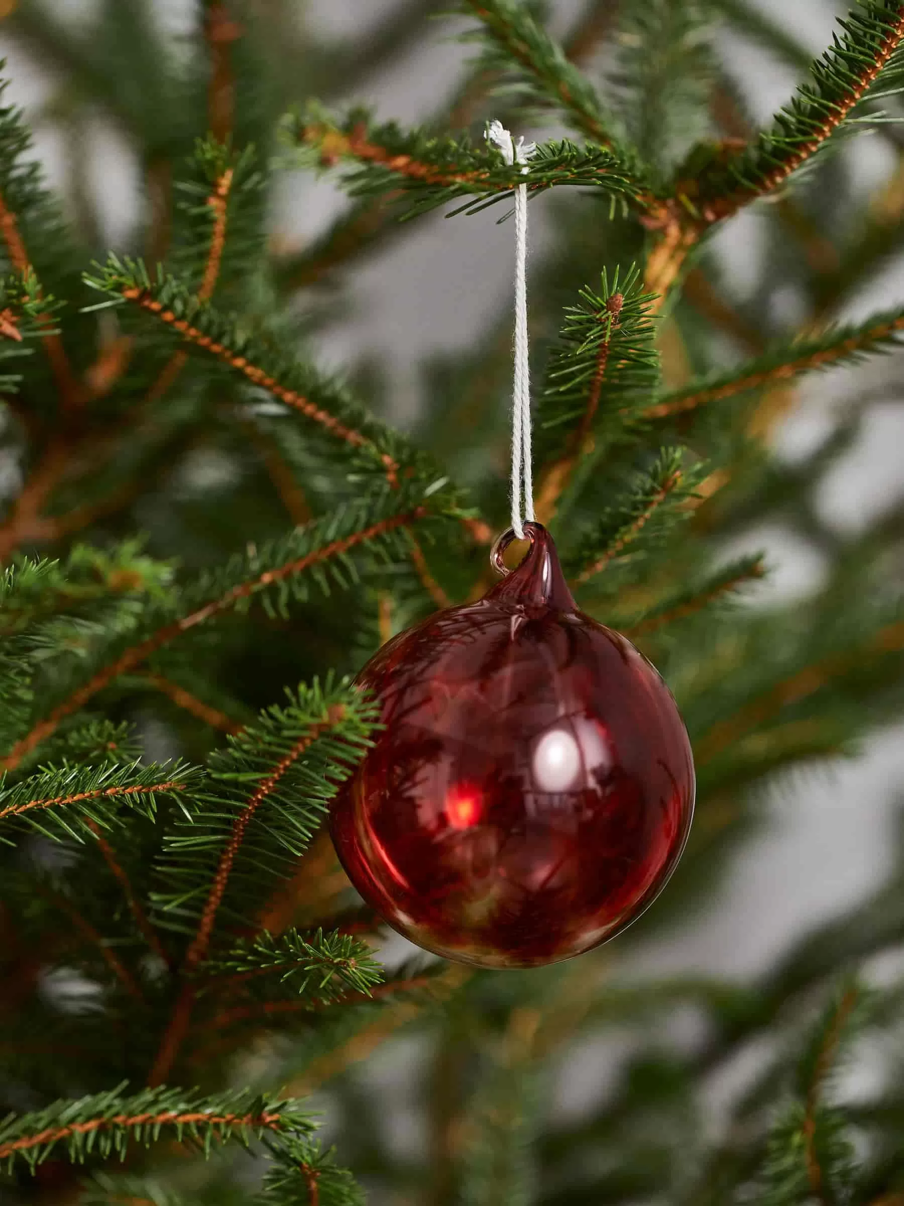 Zarte, mundgeblasene Glaskugeln mit Pinselstrich-Finish und Baumwollschnur zum einfachen Aufhängen. Verkauft im 2er-Set. Durchmesser 80 mm.