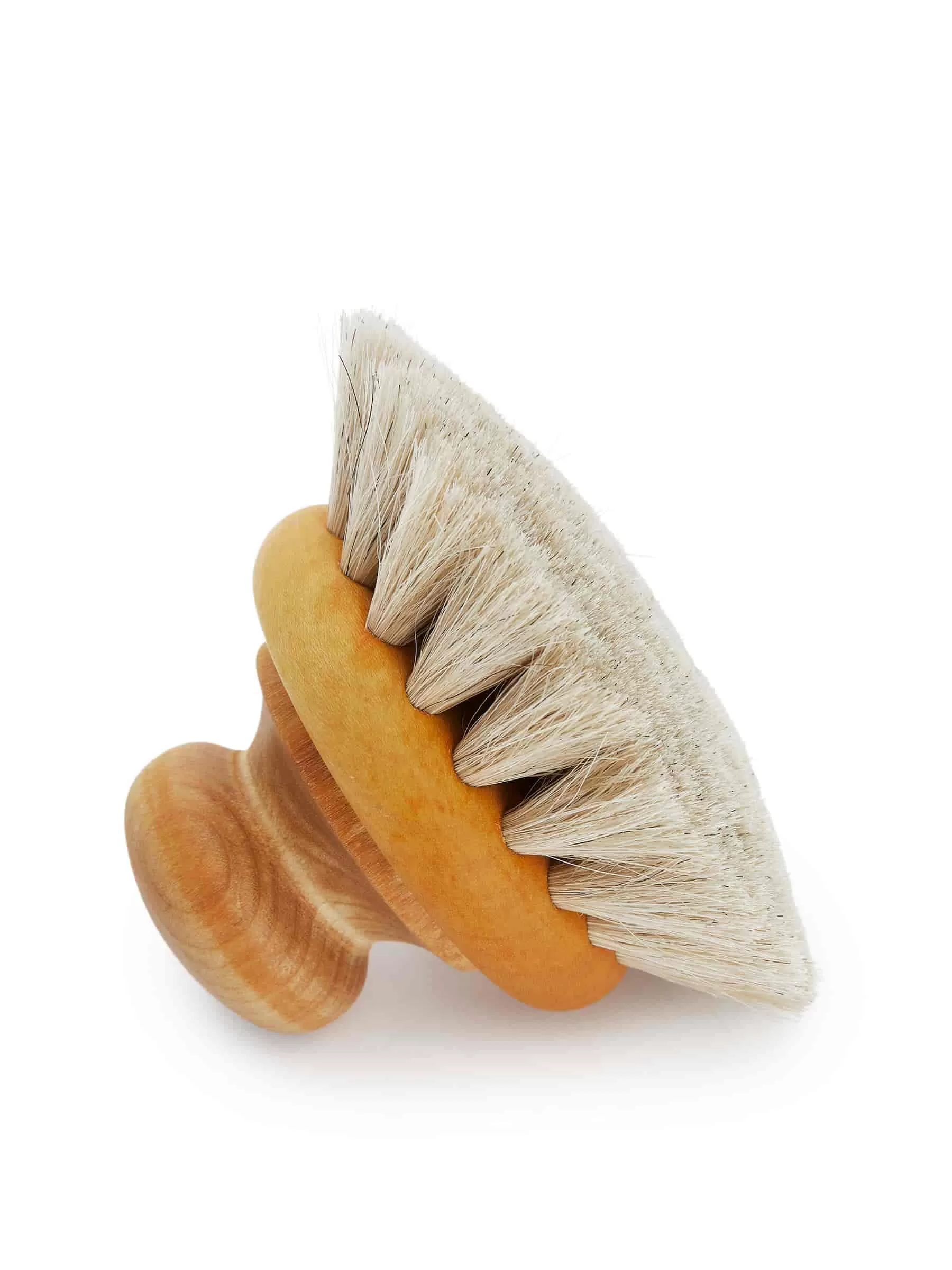 Badebürste mit Griff aus ölbehandeltem Ahornholz. Die biegsamen Borsten sorgen für einen angenehmen Schaum der Seife. Lassen Sie die Bürste nach dem Gebrauch mit den Borsten nach unten trocknen, um das Wasser vom Holz wegzuleiten. Durchmesser 12 cm, Höhe 9 cm. Von der schwedischen Marke Iris Hantverk.
