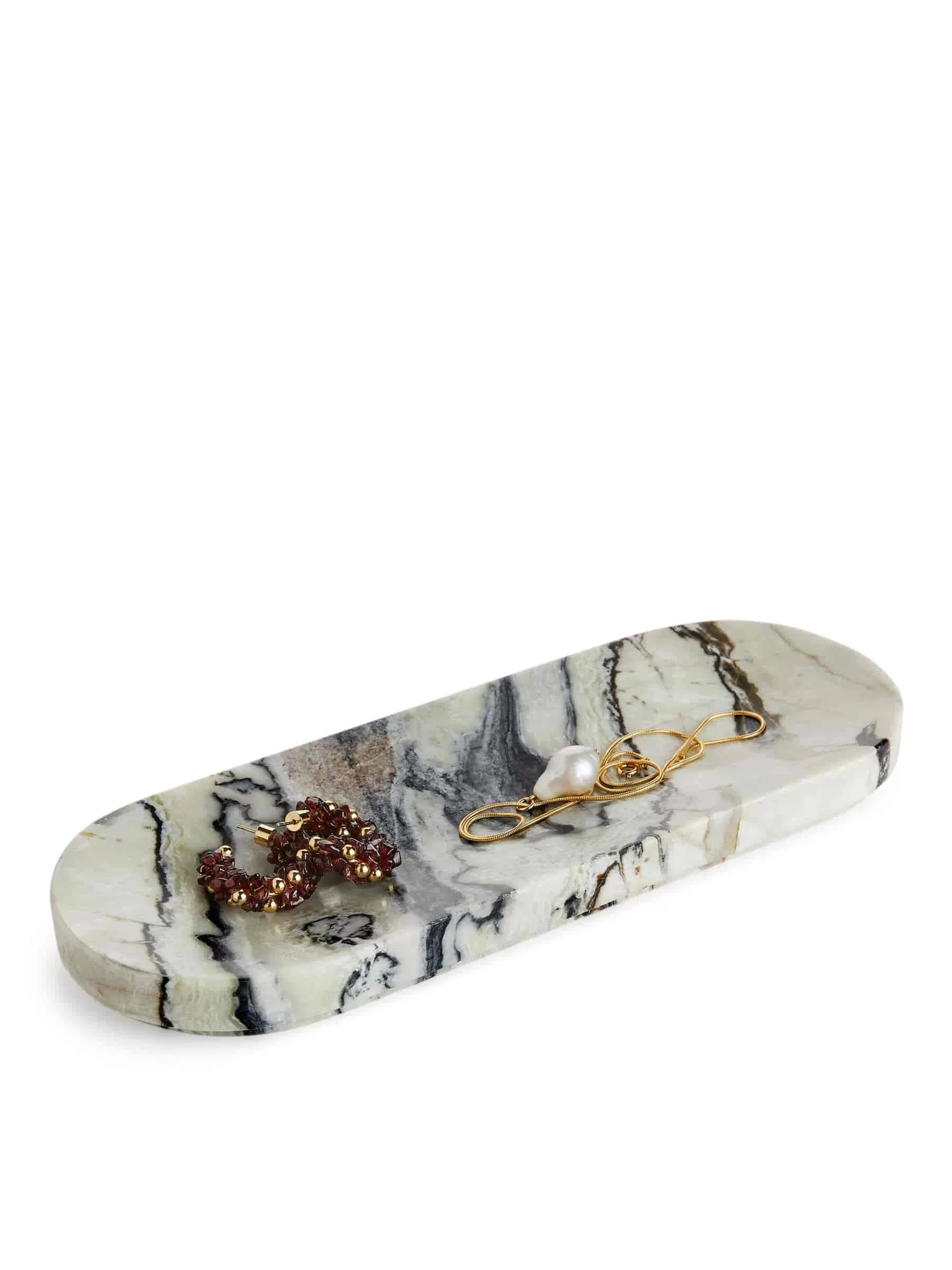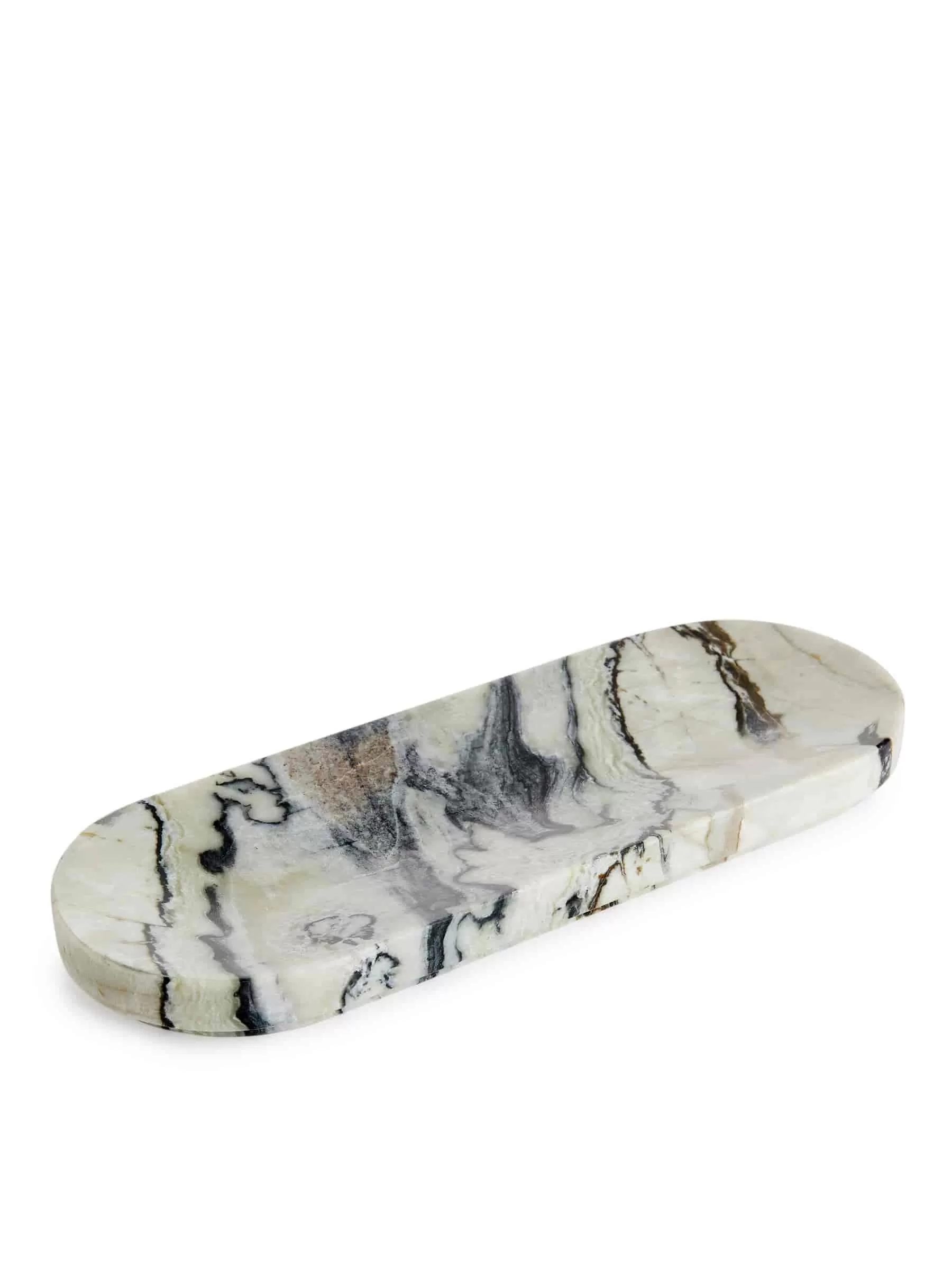 Ovales Marmortablett. Länge 24,5 cm, Breite 9,1 cm. Da Marmor ein natürliches Material ist, können Farbe und Textur jedes Produkts variieren.
