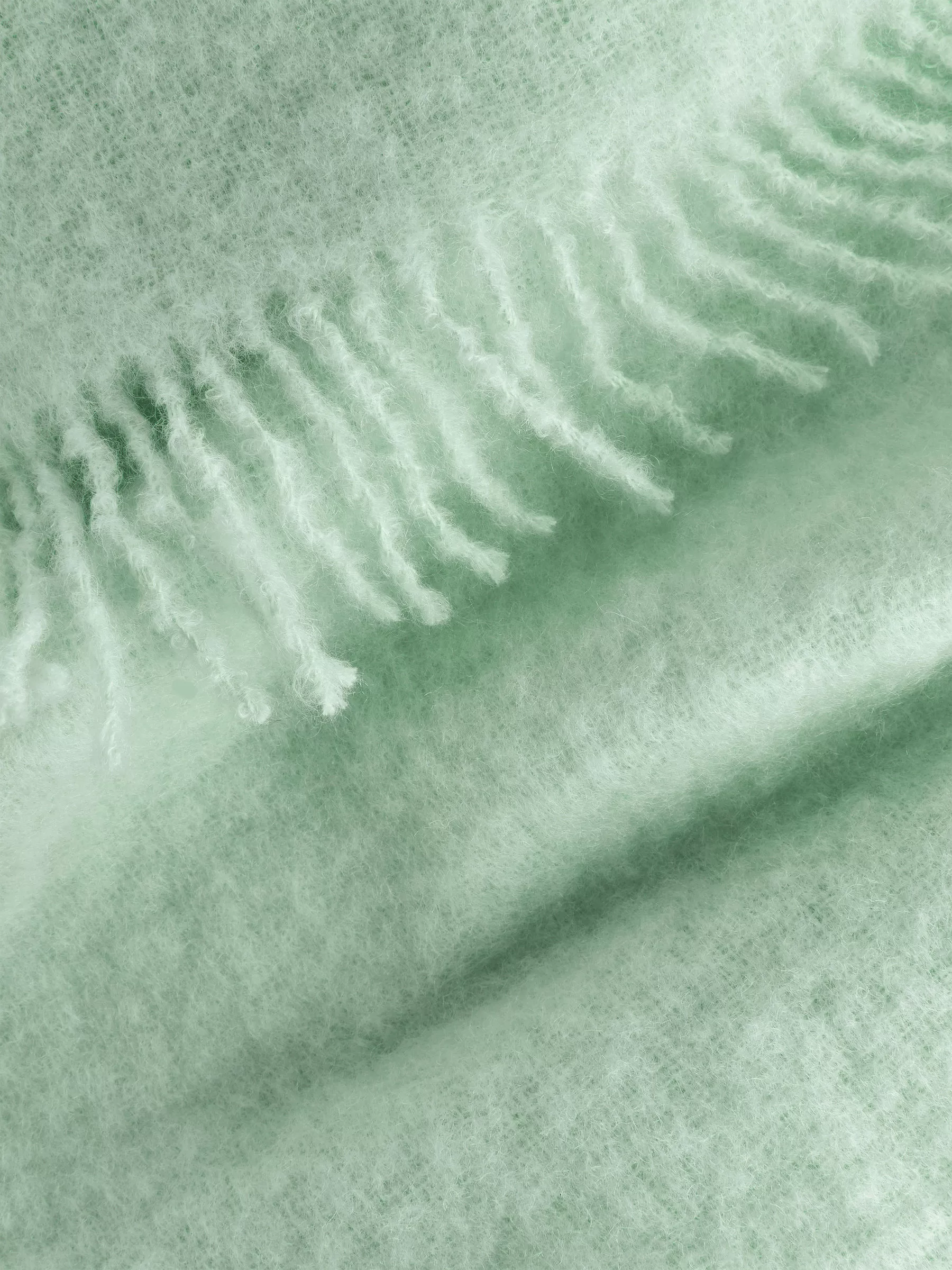 Decke von Stackelbergs aus einer Mischung aus Mohair und Wolle mit Nyloneinfassungen. Die Decke hat handgerollte Fransen, ein Markenzeichen für Decken von Stackelbergs Stockholm. Maße: 130 cm x 170 cm.