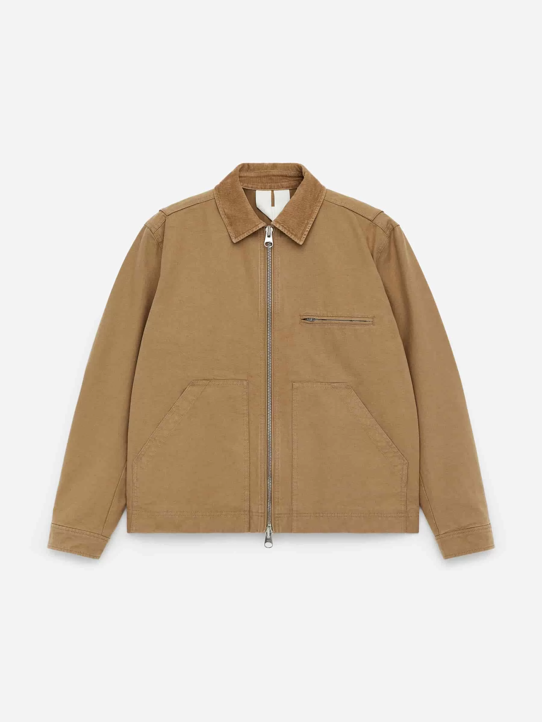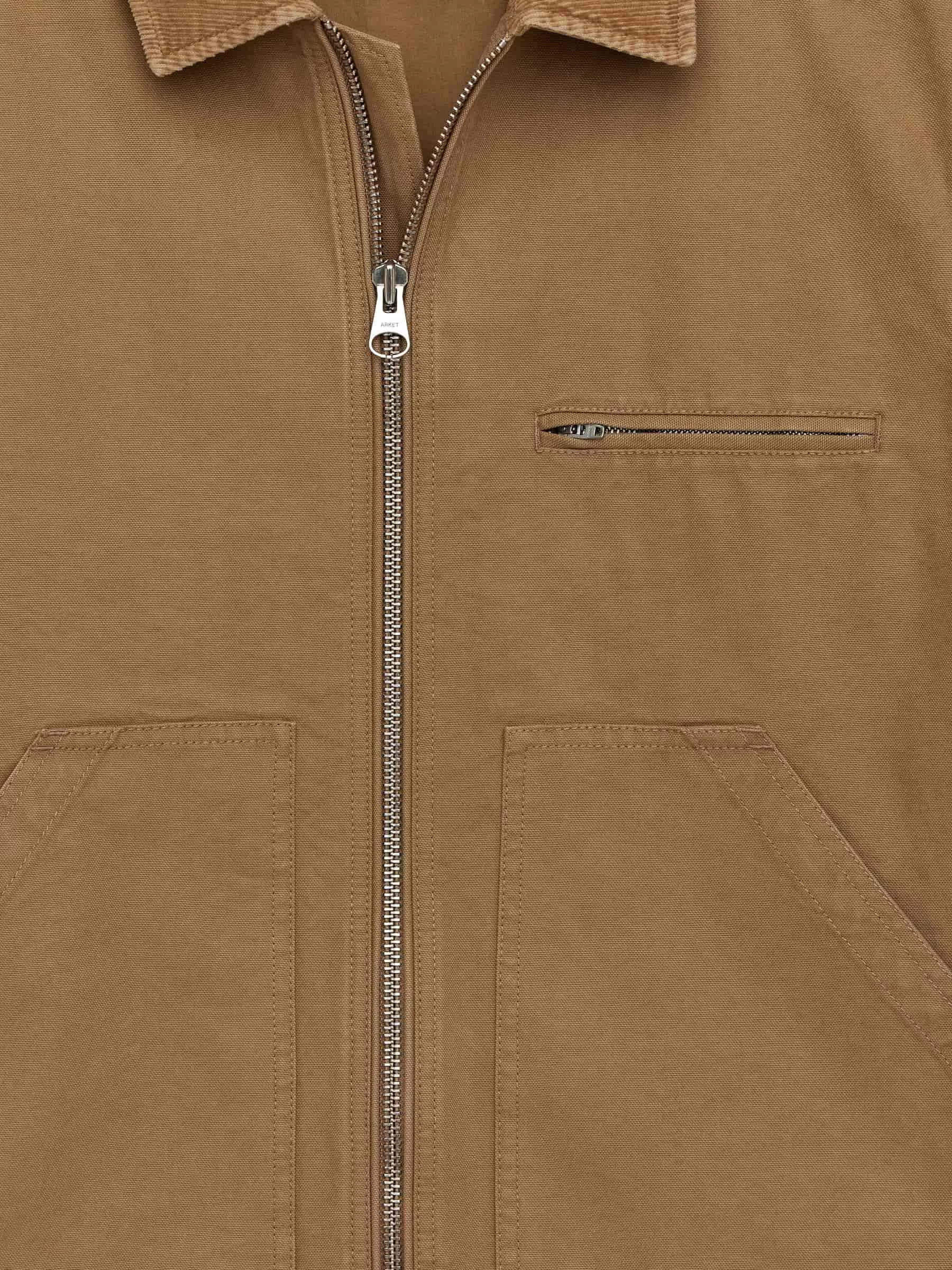 Jacke im Workwear-Stil aus Baumwoll-Canvas mit Kragen aus Cord. Mit Reißverschluss und geknöpften Manschetten. Detailliert mit einer einzelnen Paspeltasche mit Reißverschluss auf der Brust, schrägen Taschen vorne und einer Innentasche. Normale Passform.