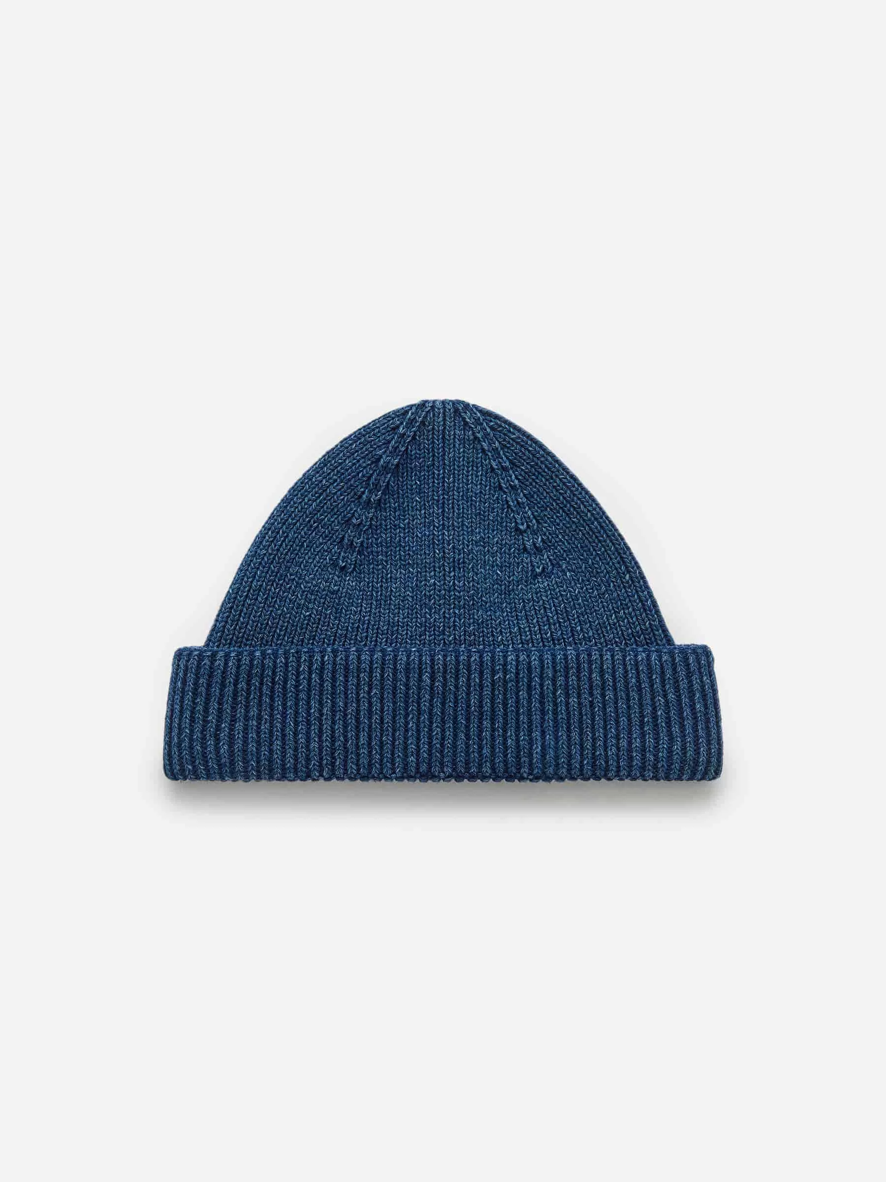 Rippstrickmütze aus einer indigogefärbten Baumwollmischung. Gewaschener Look. Doppelt zusammenklappbar.