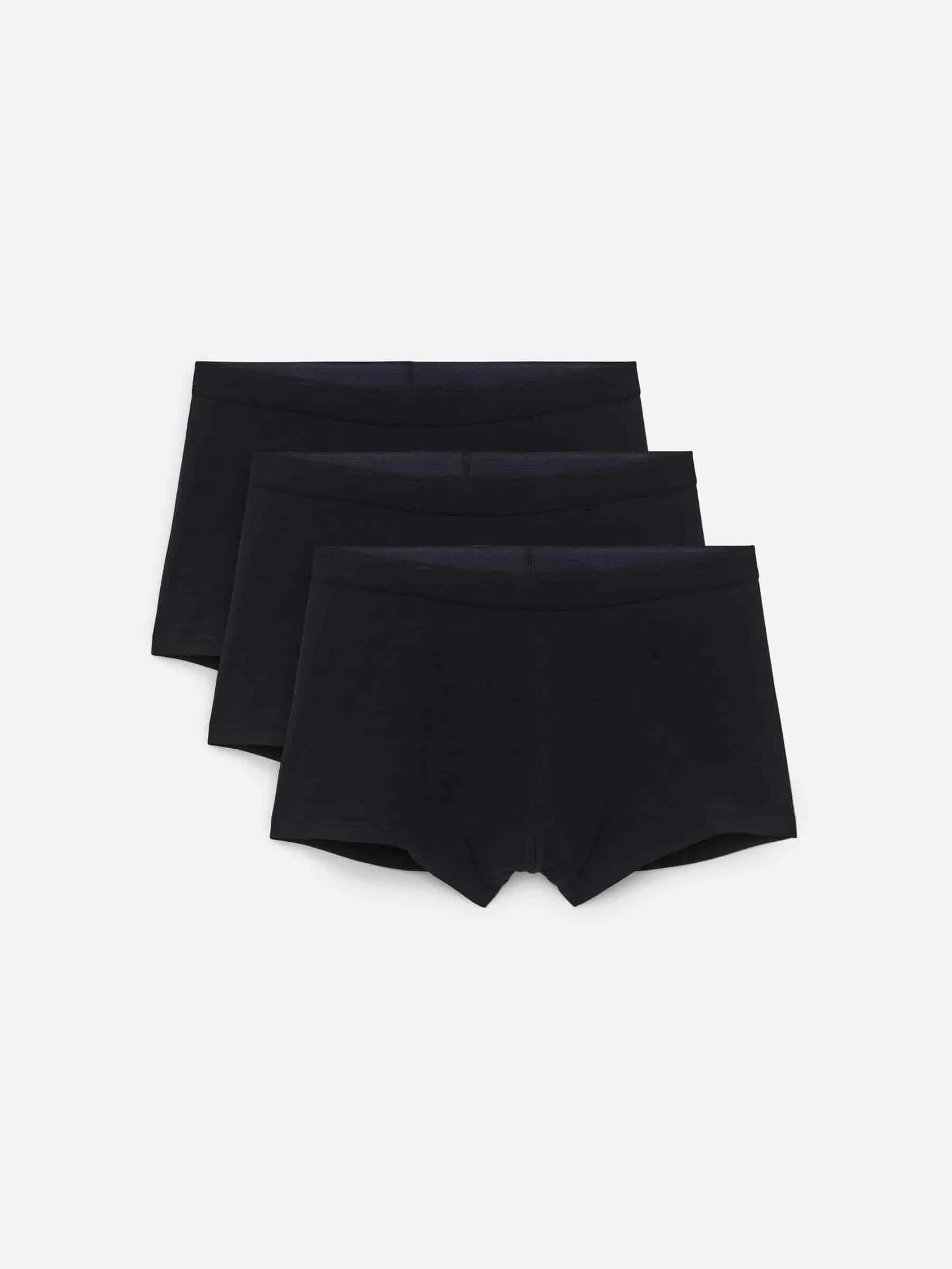 Klassische Trunks aus hochwertigem Baumwolljersey. Ein Modell mit kurzem Bein, elastischem Bund und gefütterter Vorderseite. Verkauft im Set mit 3 Paaren.