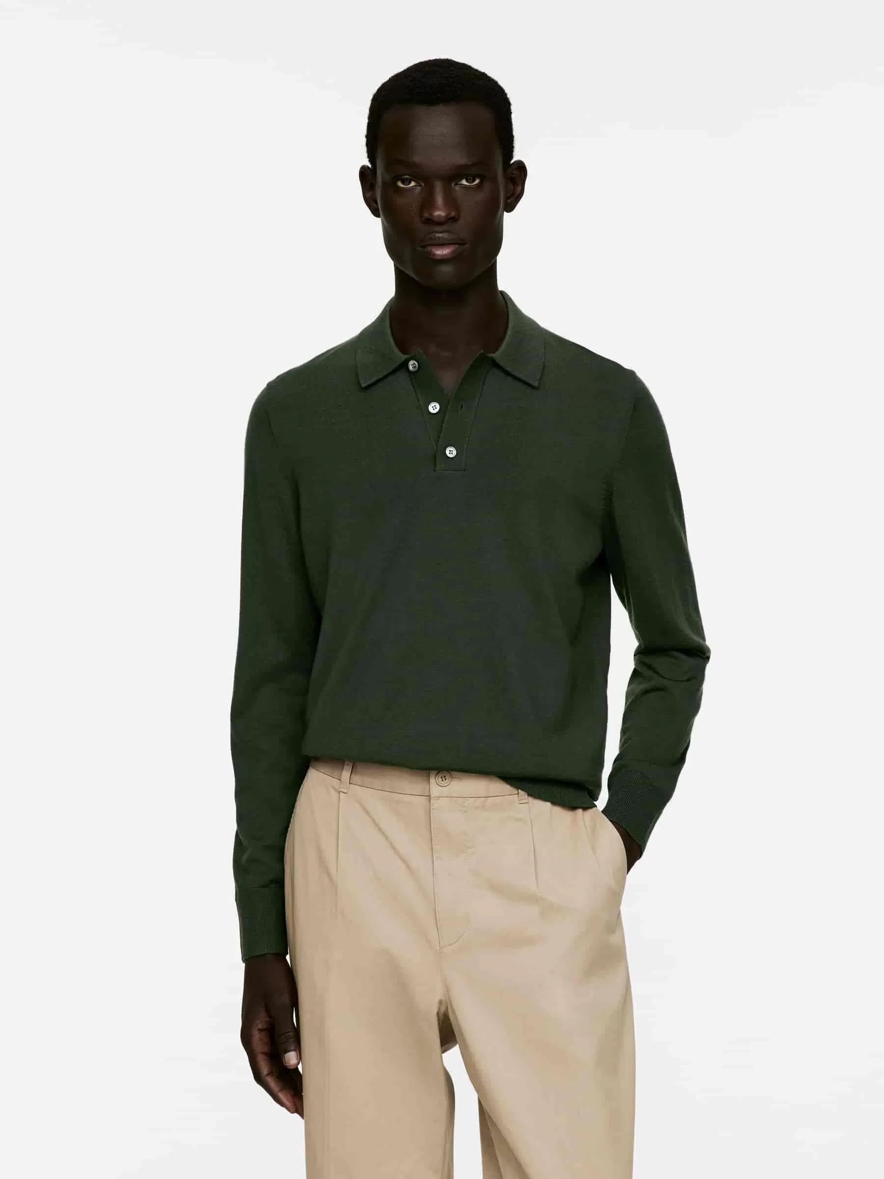 Feinstrick-Polopullover aus Merinowolle. Dieser Stil fühlt sich weich an und hat eine leicht glänzende Oberfläche. Der Pullover ist mit einem Kragen und einer geknöpften halben Knopfleiste versehen. Der Saum und die Bündchen sind aus Rippstrick. Dieser Pullover enthält 100 % RWS-Wolle, zertifiziert durch die Kontrollunion 1244999. Produkte, die nach dem Responsible Wool Standard (RWS) zertifiziert sind, enthalten Wollfasern von Farmen, die unabhängig nach Tierschutz- und Landbewirtschaftungsanforderungen zertifiziert sind.