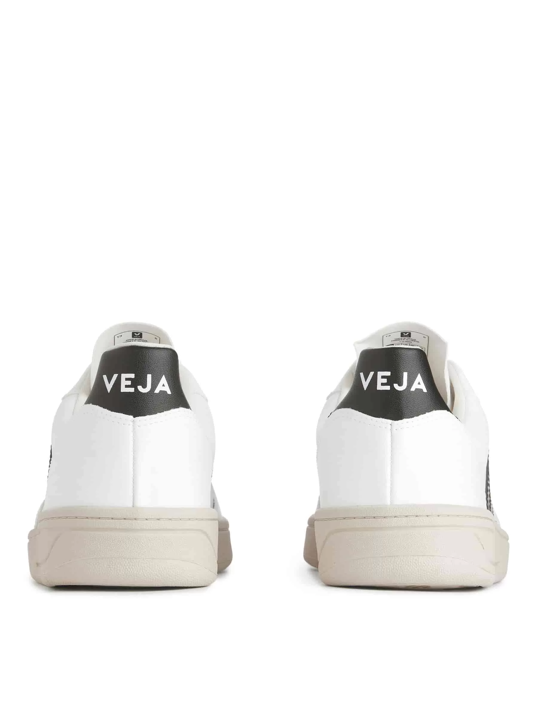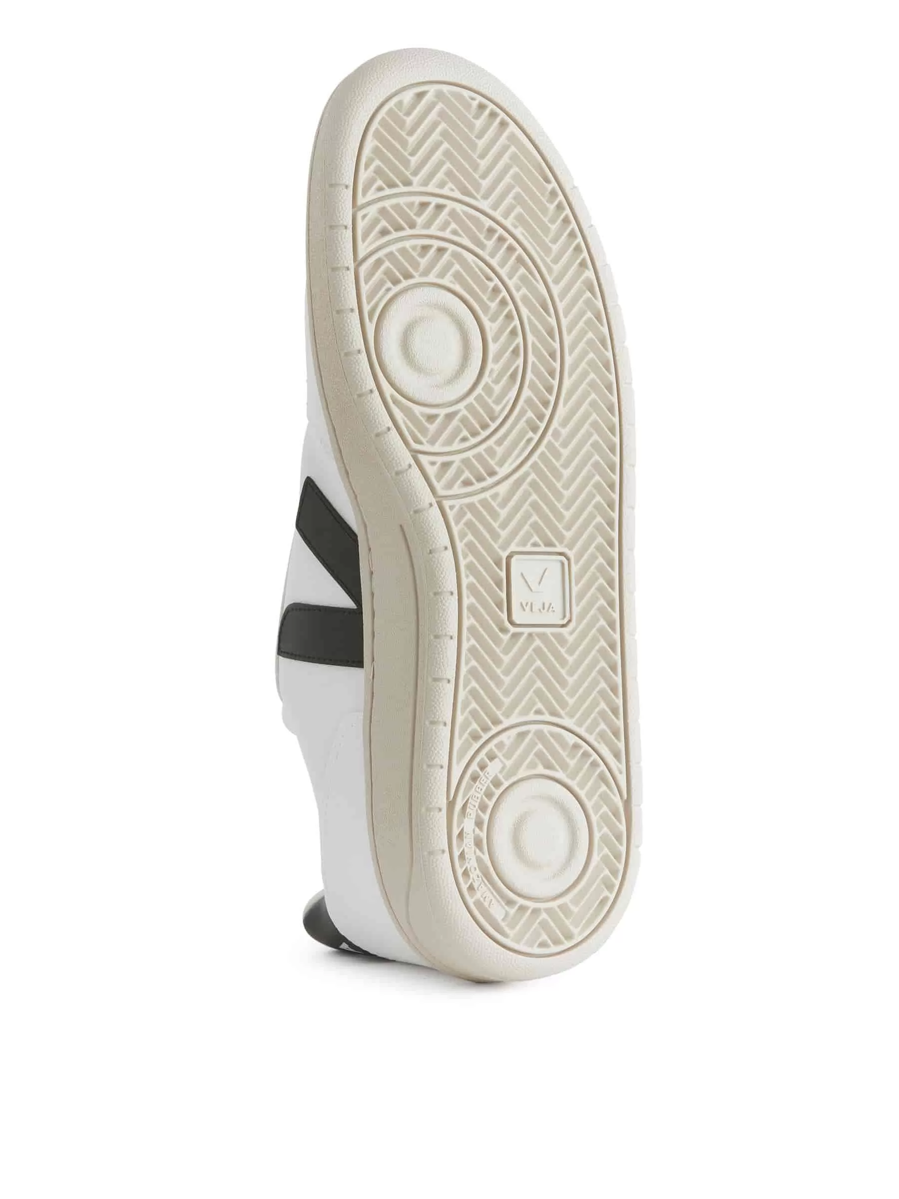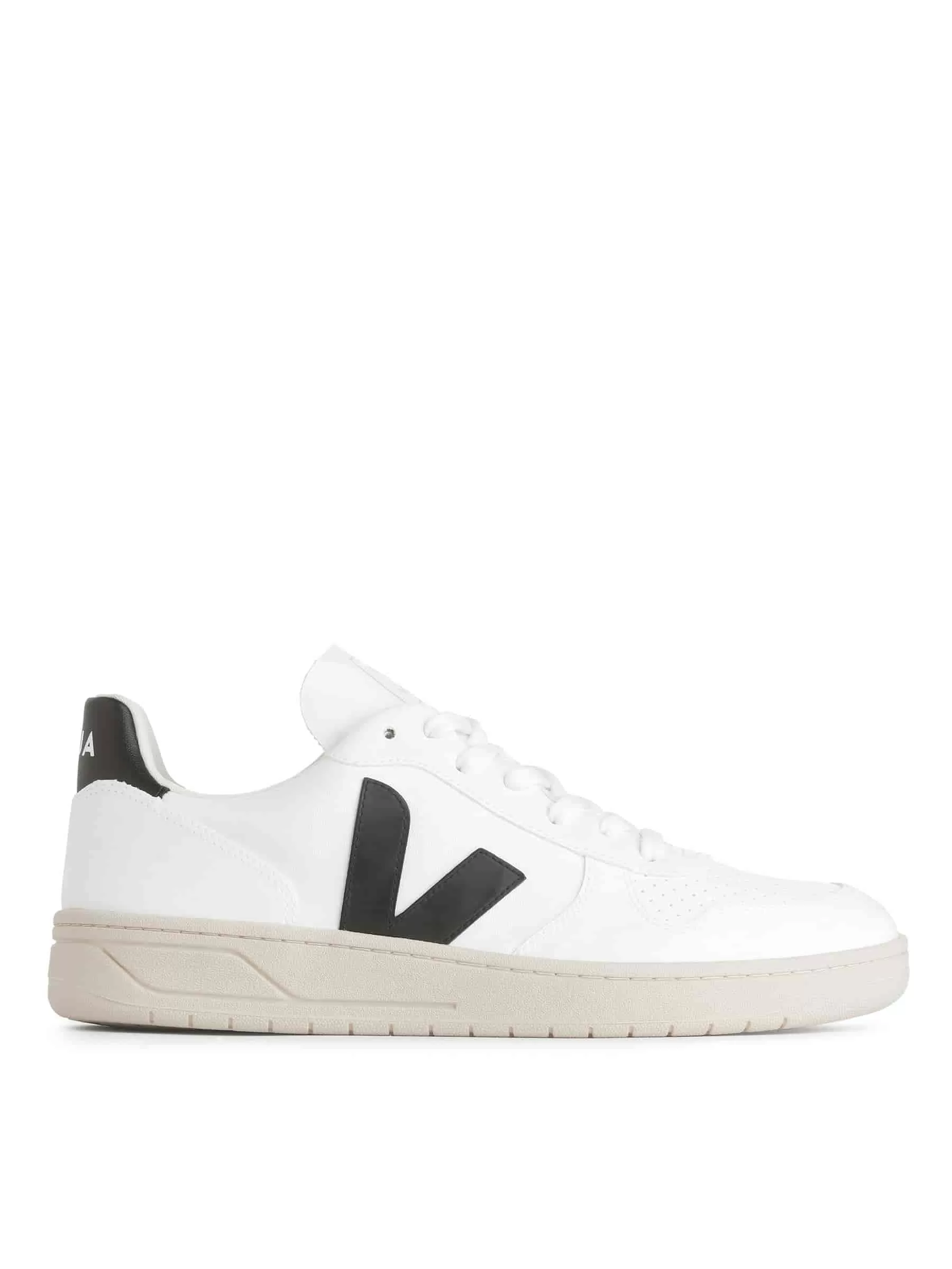 Die Veja V-10-Silhouette verfügt über ein Obermaterial aus veganem Leder, eine Außensohle aus Amazonas-Wildkautschuk und ein weiches Baumwollfutter. Es verfügt über eine perforierte Zehenpartie und ein V-Logo auf beiden Seiten.