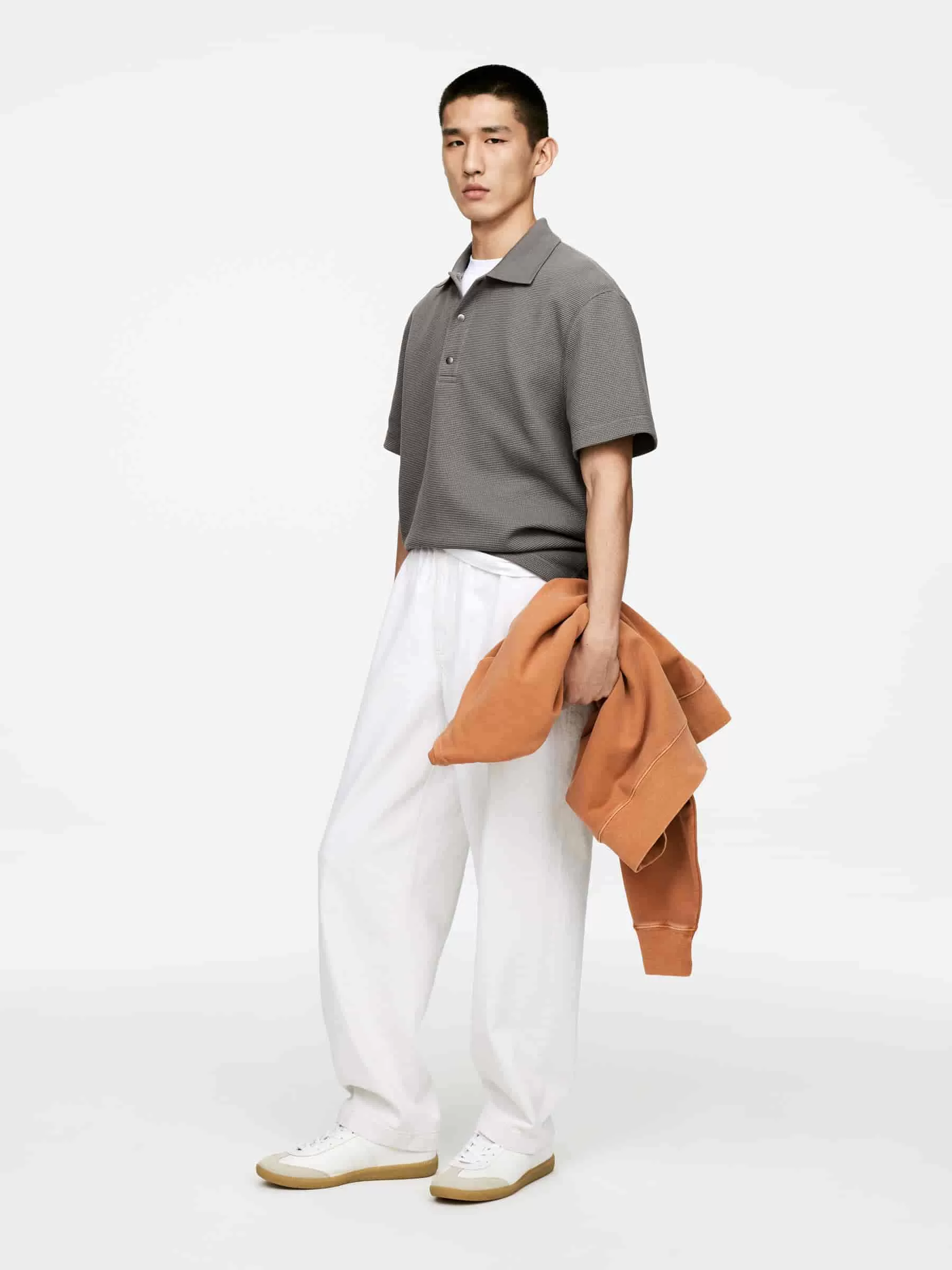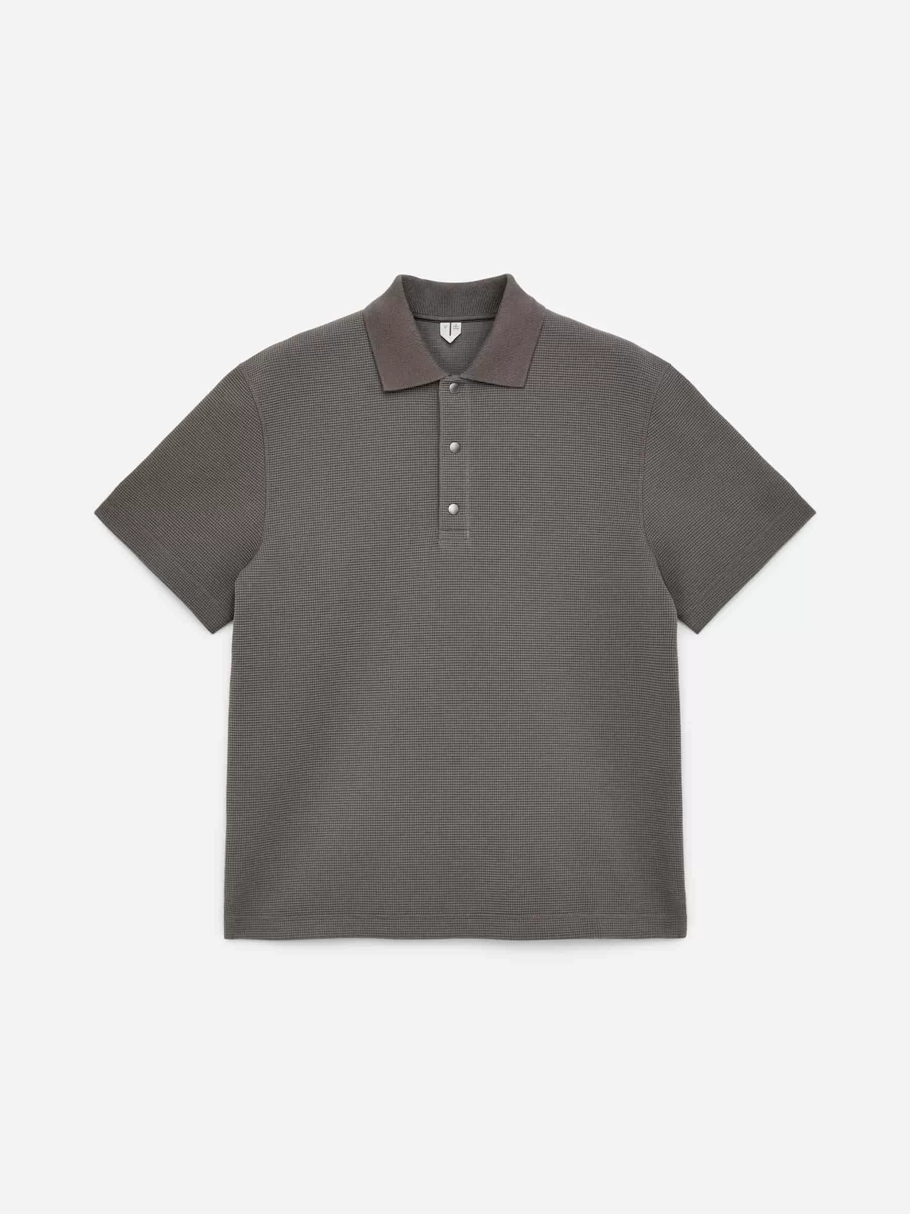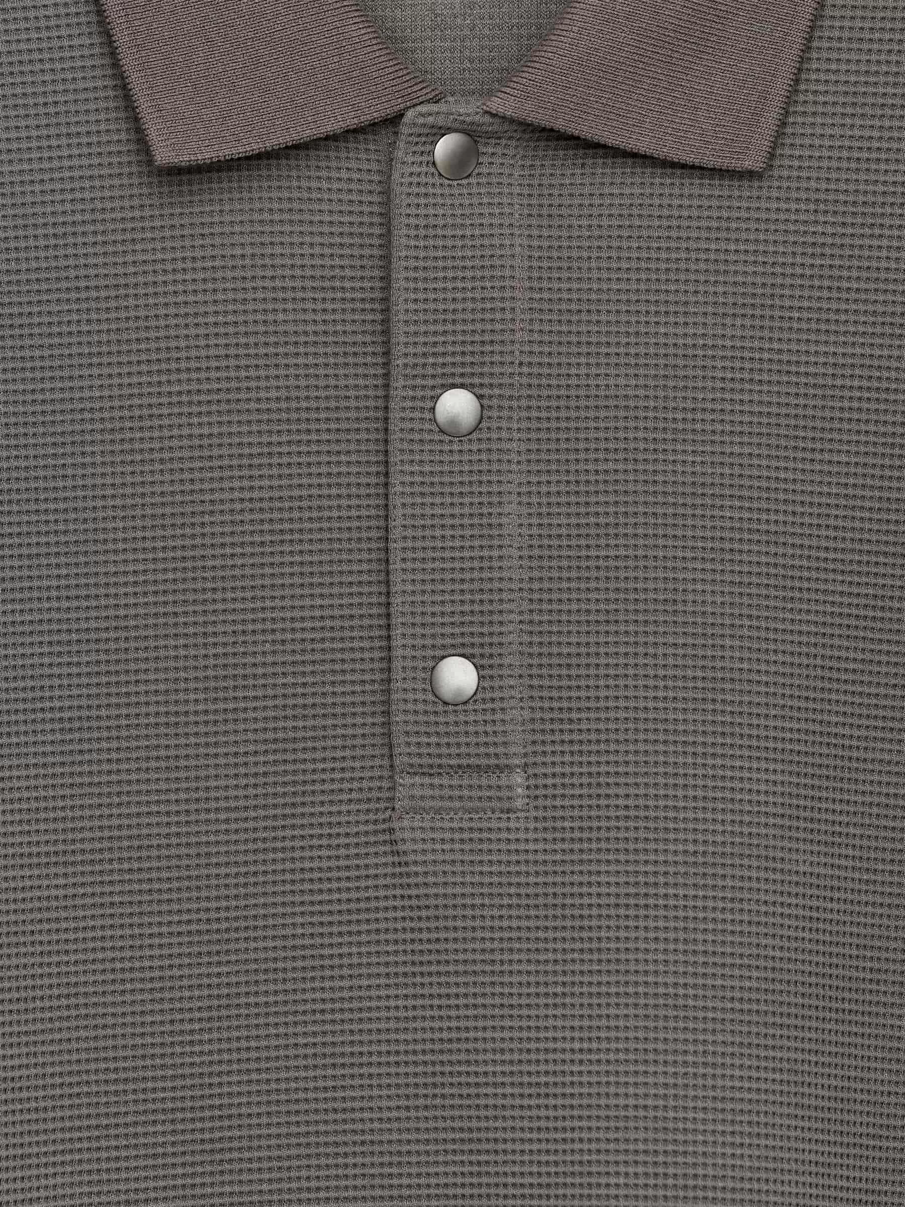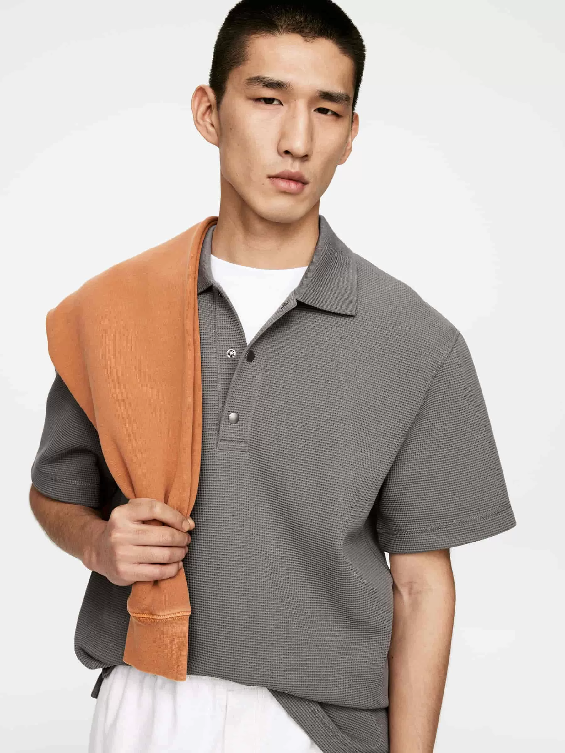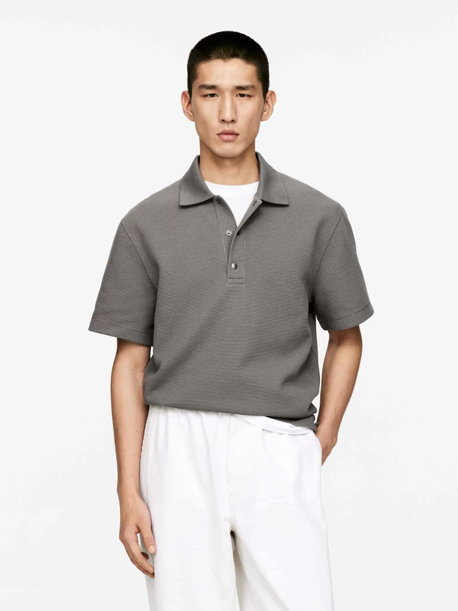 Kurzärmliges Poloshirt aus dehnbarem Jerseystoff mit Waffelstruktur. Mit geripptem Kragen und halber Knopfleiste mit Druckknopfverschluss. Schlitze an den Seitennähten.