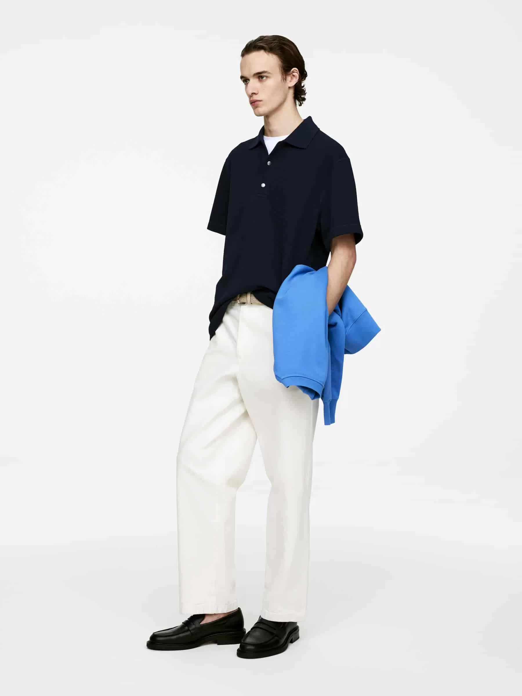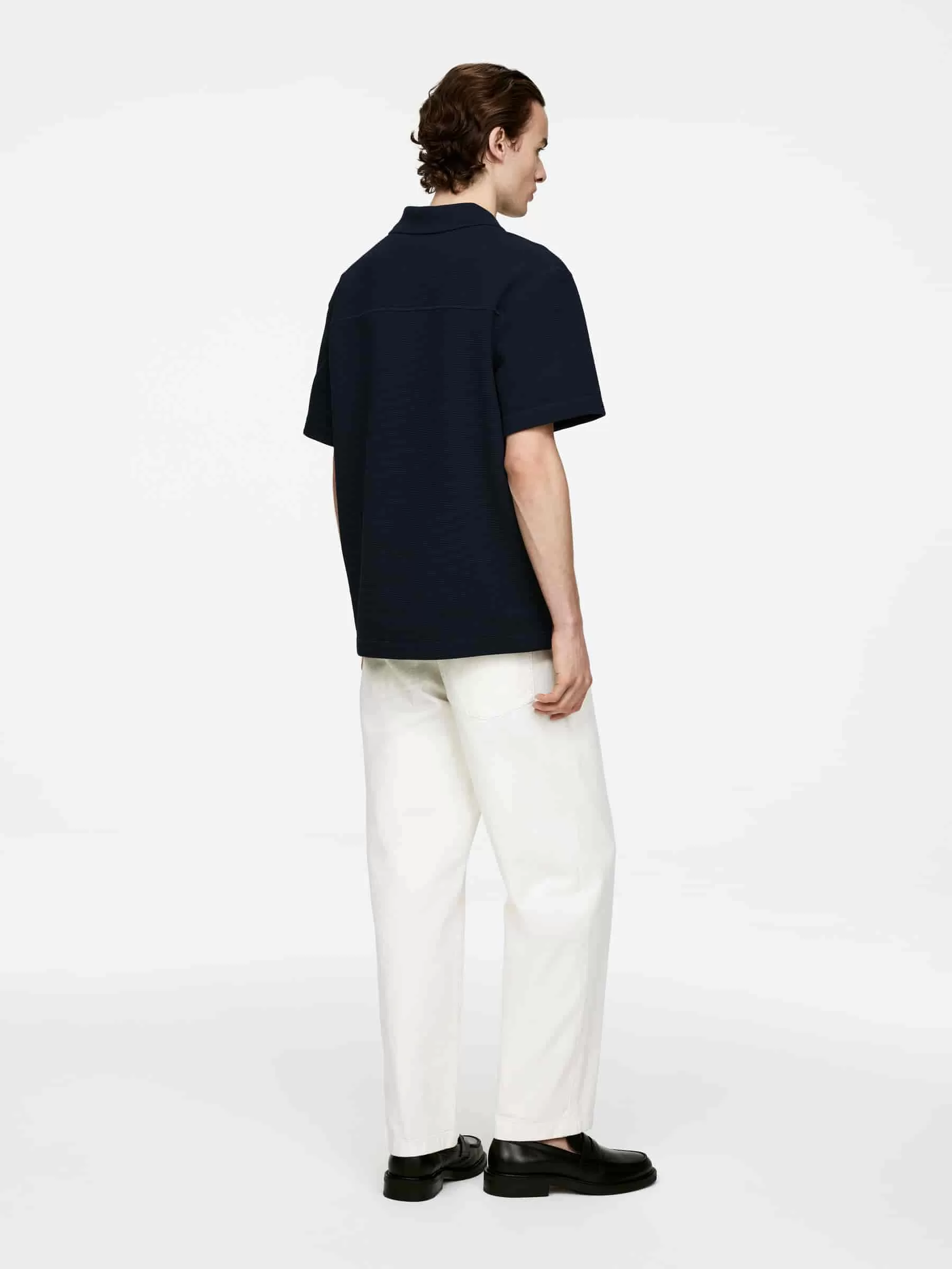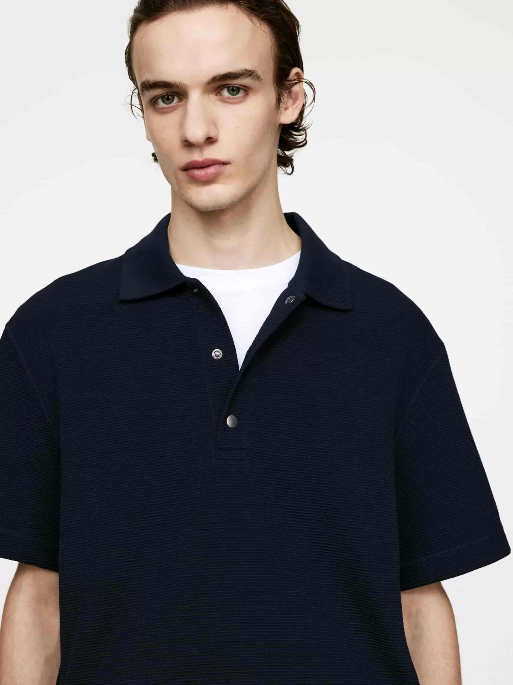 Kurzärmliges Poloshirt aus dehnbarem Jerseystoff mit Waffelstruktur. Mit geripptem Kragen und halber Knopfleiste mit Druckknopfverschluss. Schlitze an den Seitennähten.