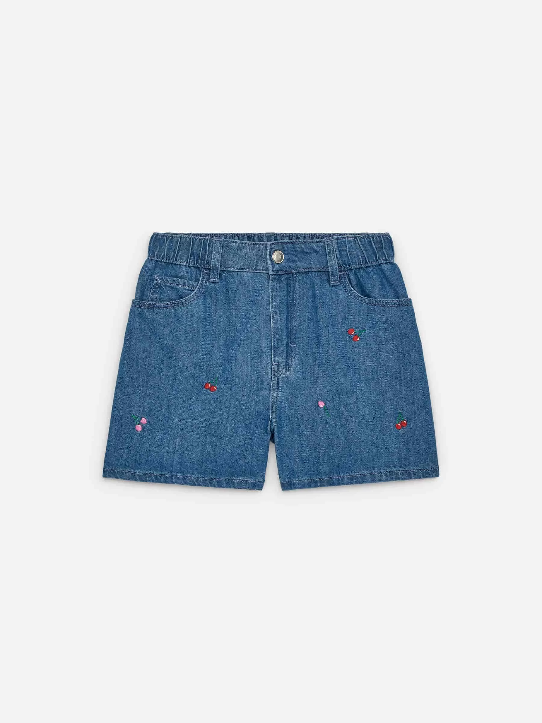Klassische Denim-Shorts im 5-Pocket-Stil mit gestickten Details. Ausgestattet mit Gummizügen in der Taille und einem verstellbaren Innenbund. Entspannte Passform.