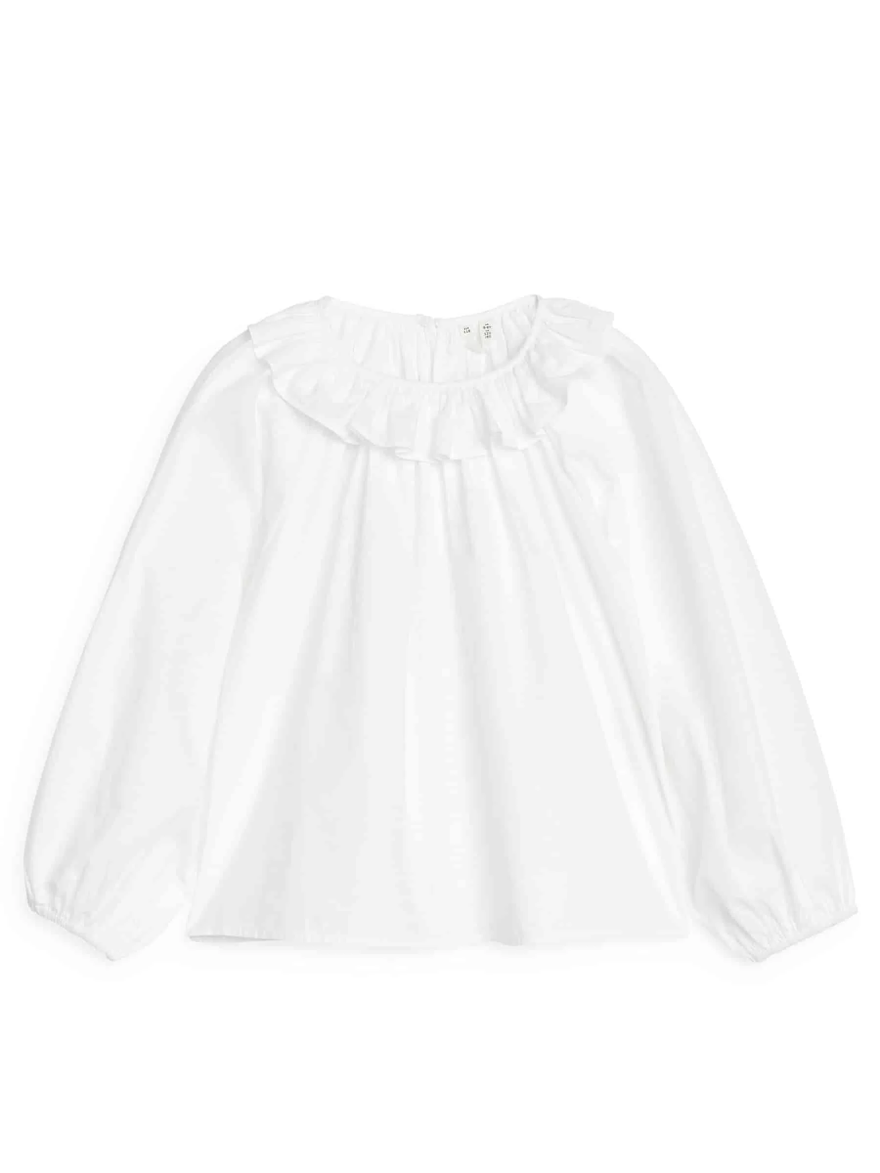 Baumwollbluse mit Rüschenkragen und Raglanärmeln. Schlaufen- und Knopfverschluss hinten in der Mitte.