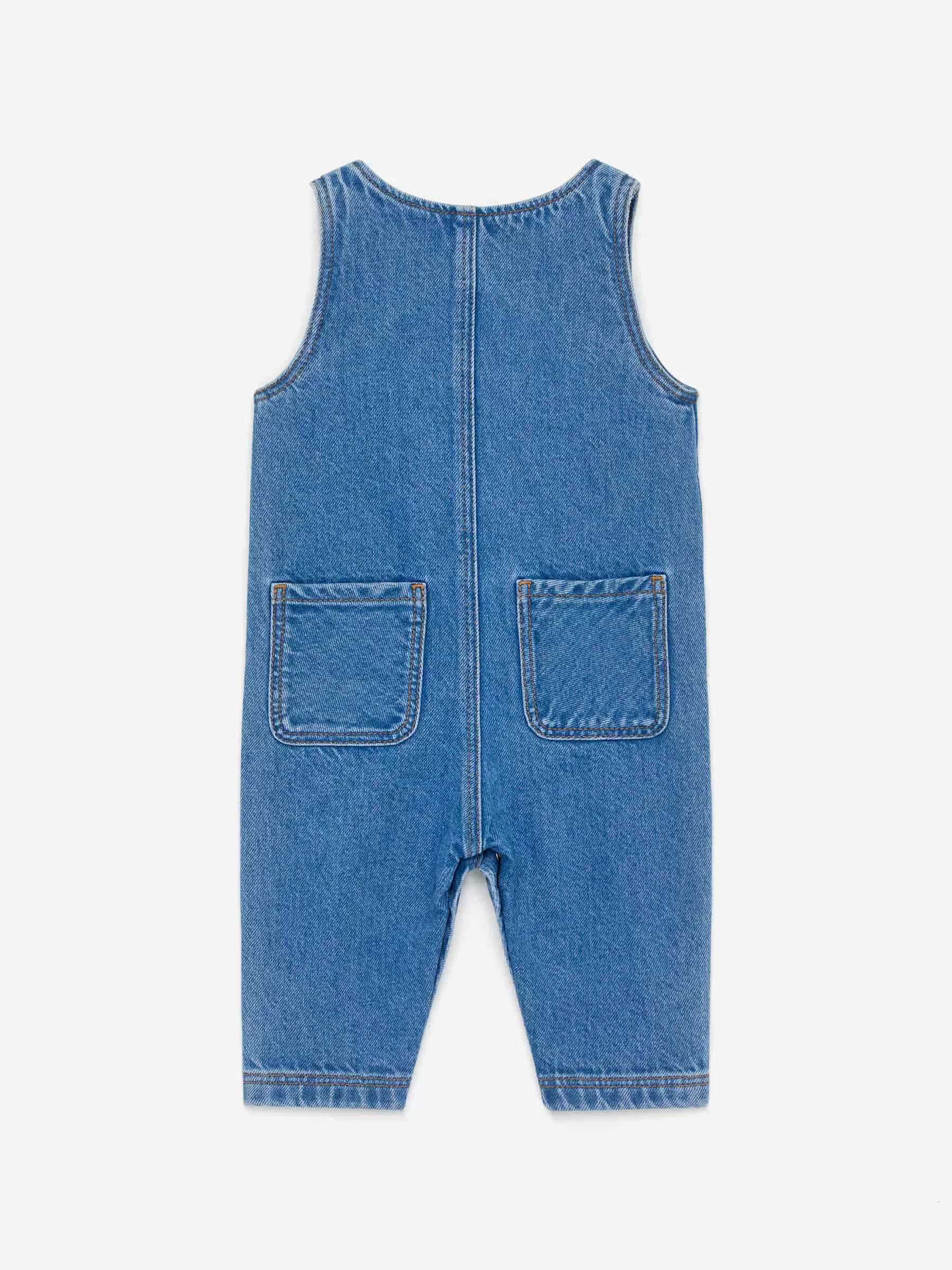 Ärmelloser Overall aus Denim-Twill aus Baumwolle. Druckknöpfe vorne und im Schritt für alle Größen außer 86-92. Gesäßtaschen.