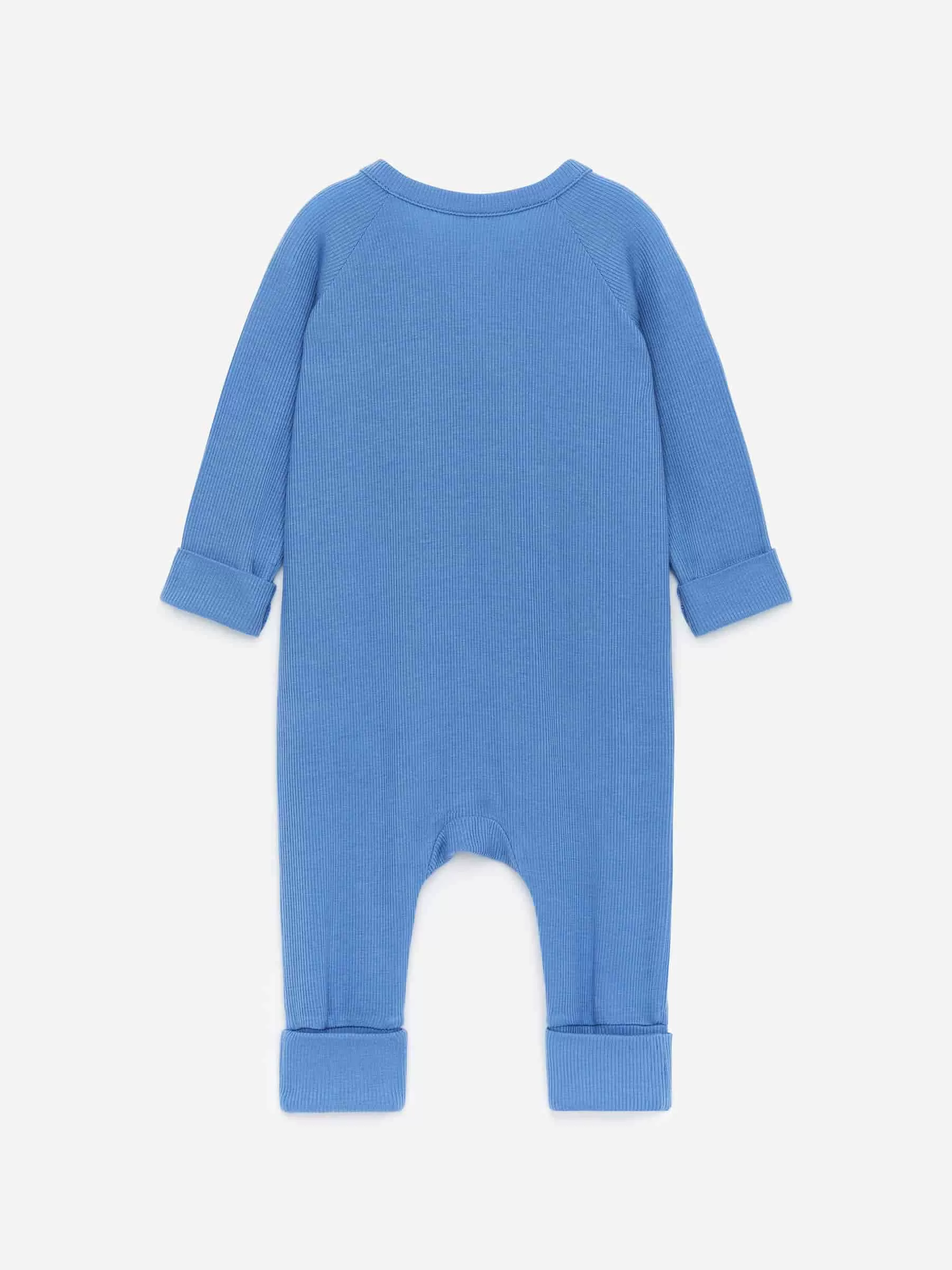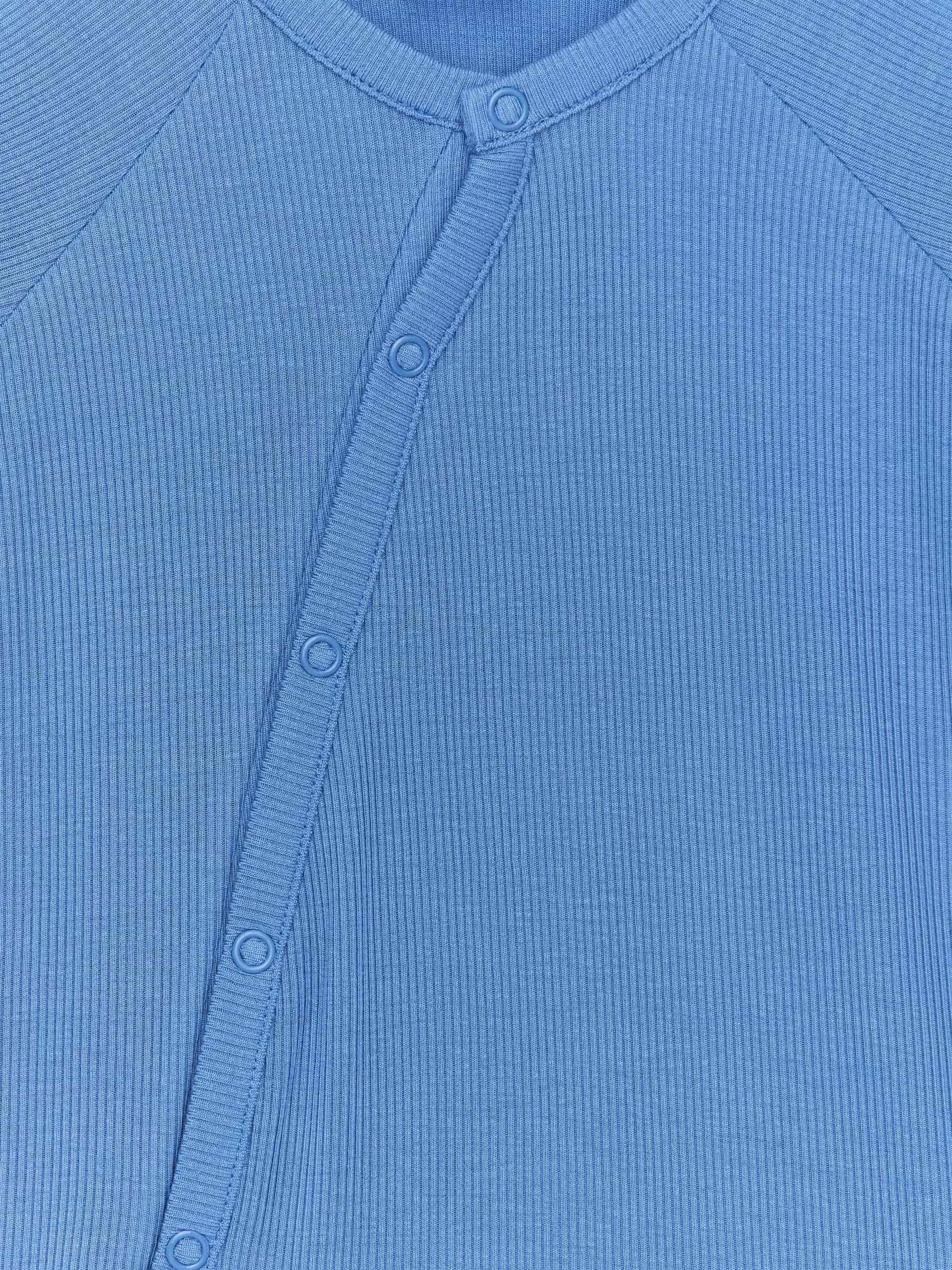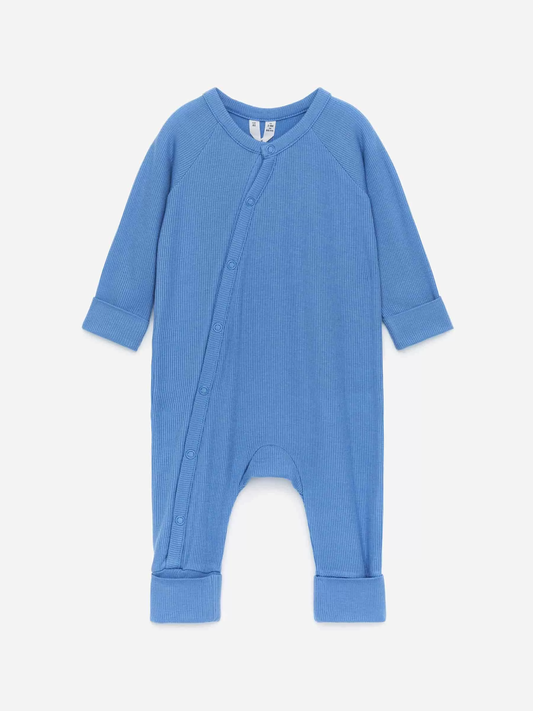 Langarm-Pyjama für das Neugeborene. Hergestellt aus einem ultraweichen und leichten Rippjersey aus Lyocell und Elasthan für Dehnbarkeit. Die Manschetten sind über Hände und Füße faltbar. Diagonal angeordnete Druckknöpfe vorne zum einfachen An- und Ausziehen.