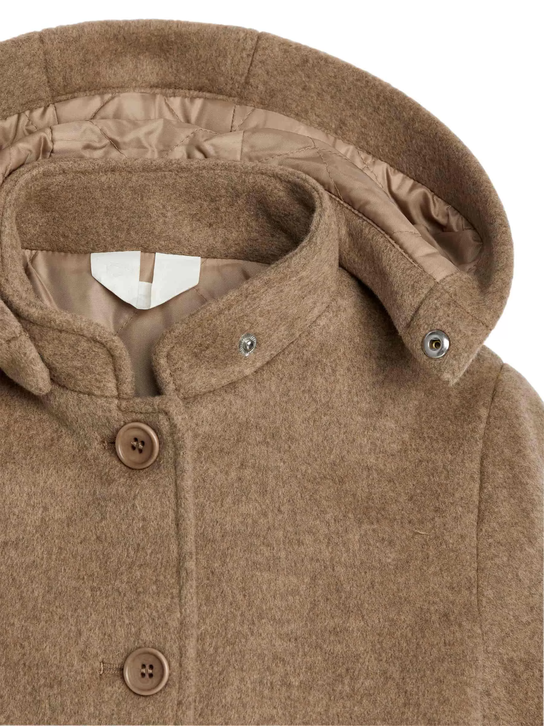 Mantel aus einer Wollmischung. Mit abnehmbarer Kapuze, Knopfleiste vorne und aufgesetzten Taschen. Gefüttert. Der Mantel besteht zu 80 % aus RWS-Wolle (TE-00047206). Produkte, die nach dem Responsible Wool Standard (RWS) zertifiziert sind, enthalten Wollfasern von Farmen, die unabhängig nach Tierschutz- und Landbewirtschaftungsanforderungen zertifiziert sind.