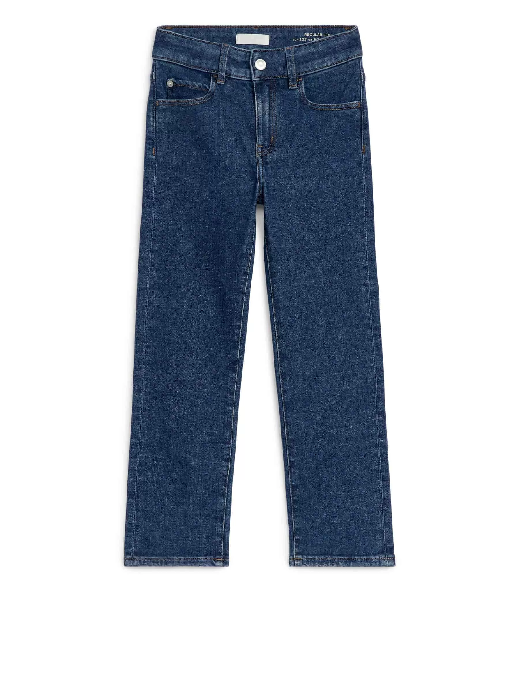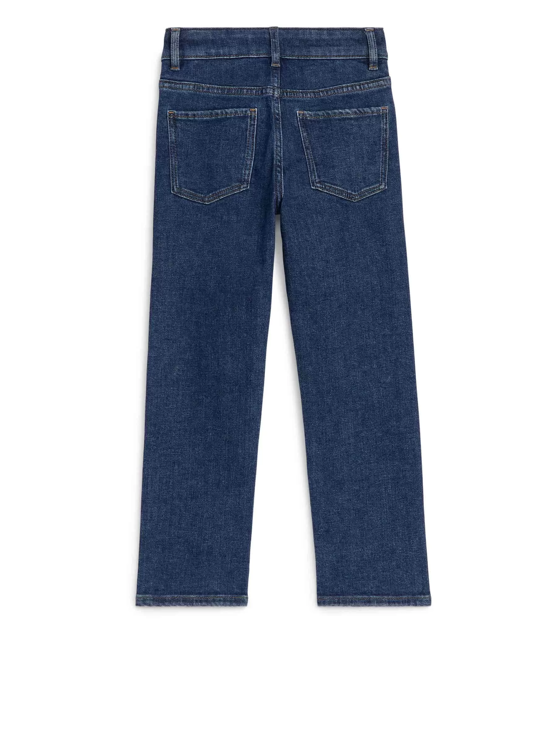 Jeans aus dehnbarem Denim-Stoff. Ein klassischer 5-Pocket-Stil mit normalem Beinverlauf, nicht zu schmal und nicht zu weit. Detailliert mit verstellbaren Gummizügen an der Innenseite des Bunds. Druckknopfverschluss und Reißverschluss im Hosenschlitz. Silberfarbene Metallbeschläge.