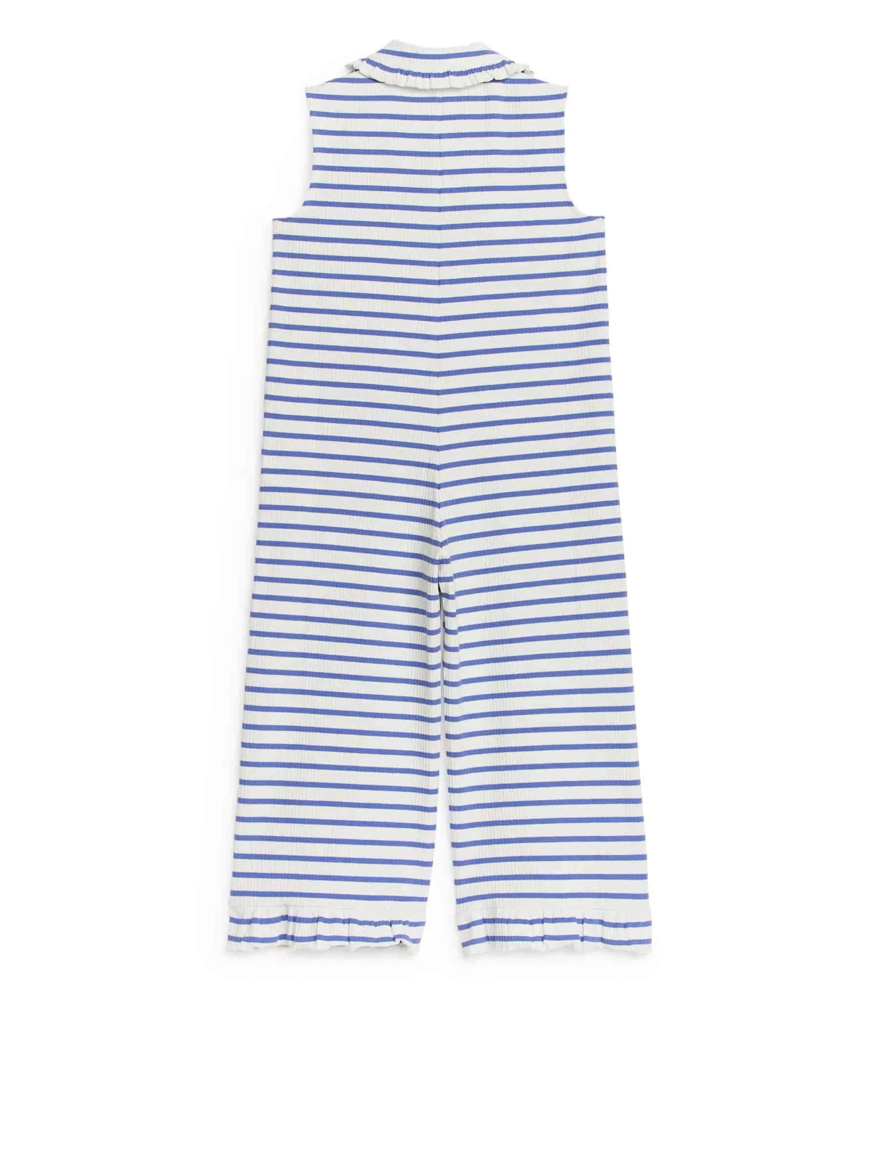 Ärmelloser Overall mit Rippstrickstruktur aus dehnbarer Baumwolle. Doppellagiger Kragen mit Rüschen, Druckknopfverschluss und Rüschen- und Babylock-Kanten am unteren Saum.