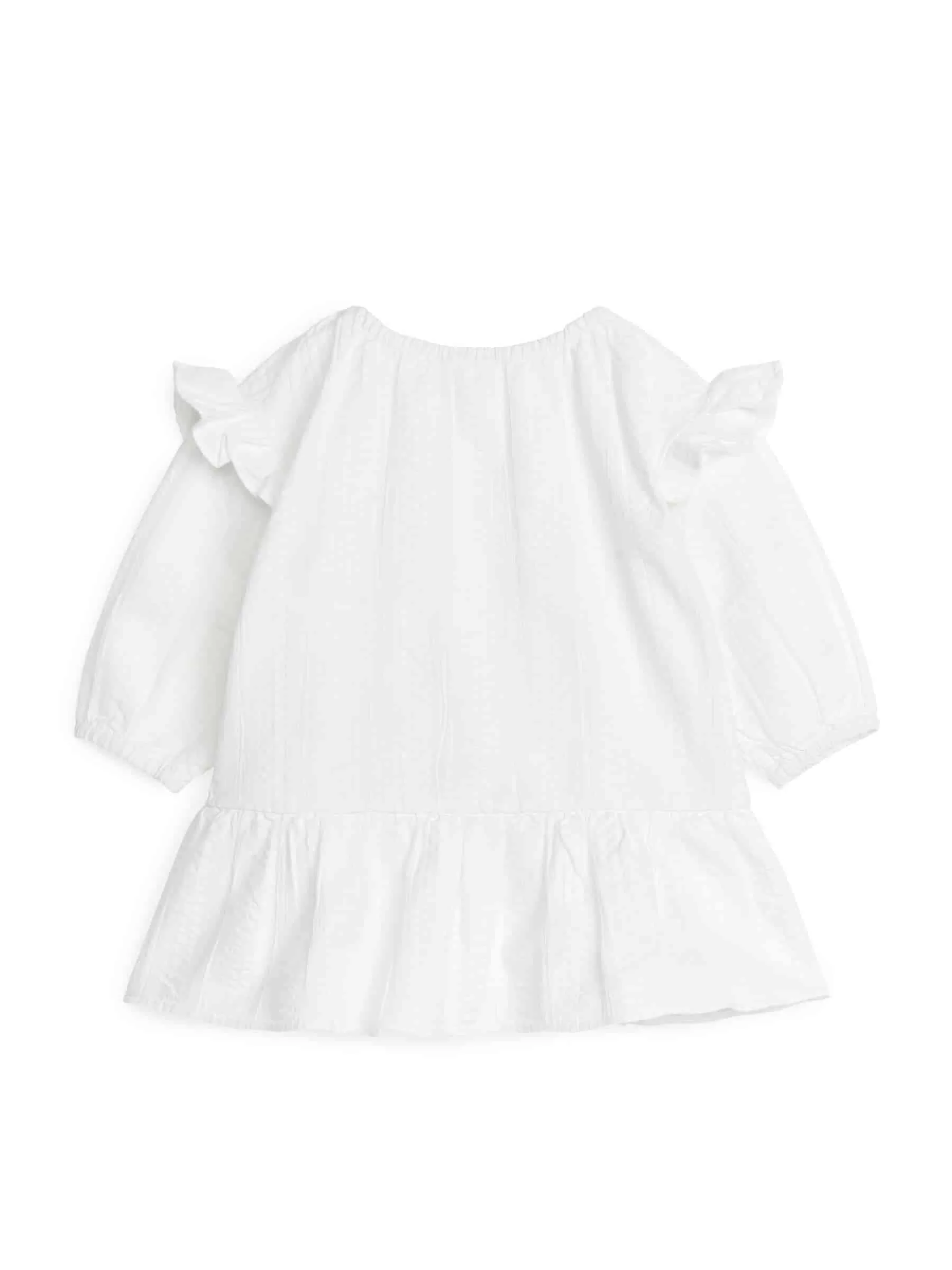 Langärmliges Kleid aus strukturiertem Baumwoll-Seersucker-Gewebe. Mit Rüschen an den Schultern und Gummizügen am Hals und an den Manschetten. Volant am unteren Saum.